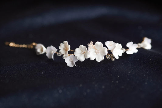 White Sofia - Boho Brautarmband mit Blumen und Kristallen
