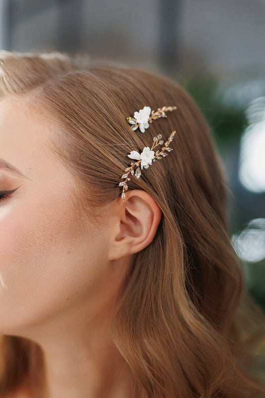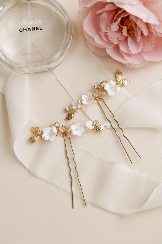 Adeline – Goldene Hochzeitshaarnadeln mit weißen Blumen für die romantische Braut