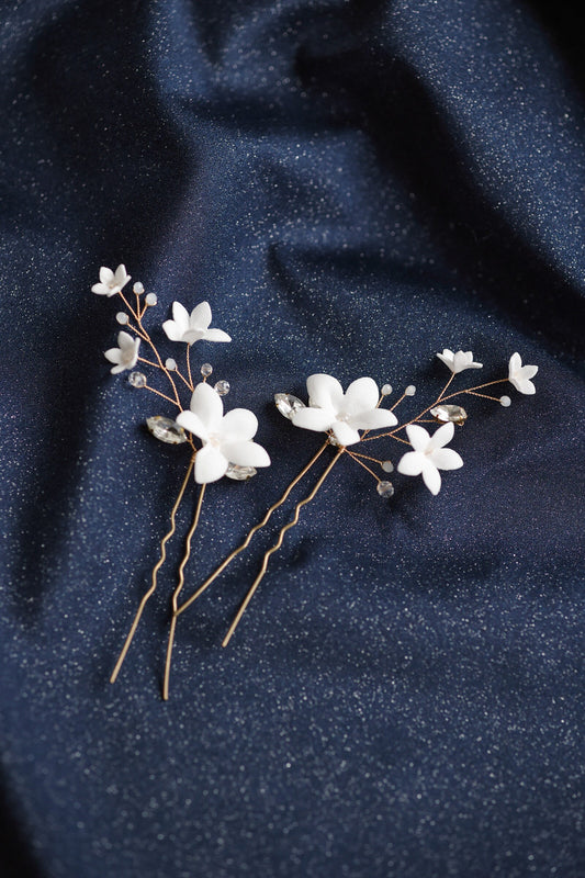 Holly - Hochzeitshaarnadeln mit weißen Blumen und Zirkonen