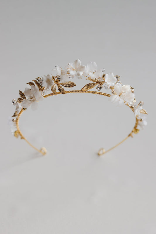 Ambria – Blumen-Hochzeitskrone voller Seidenblumen, Keramikblumen und Kristallen