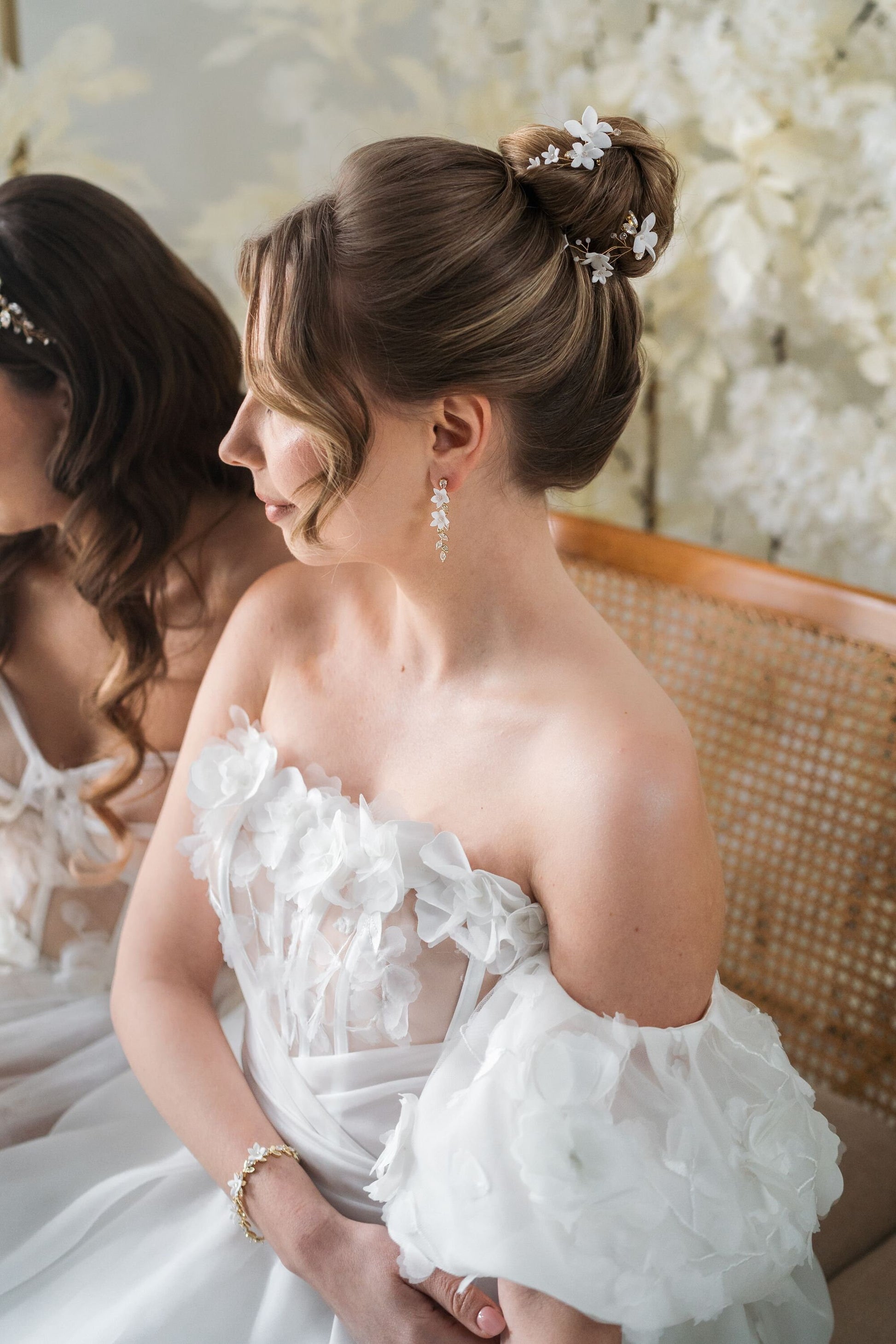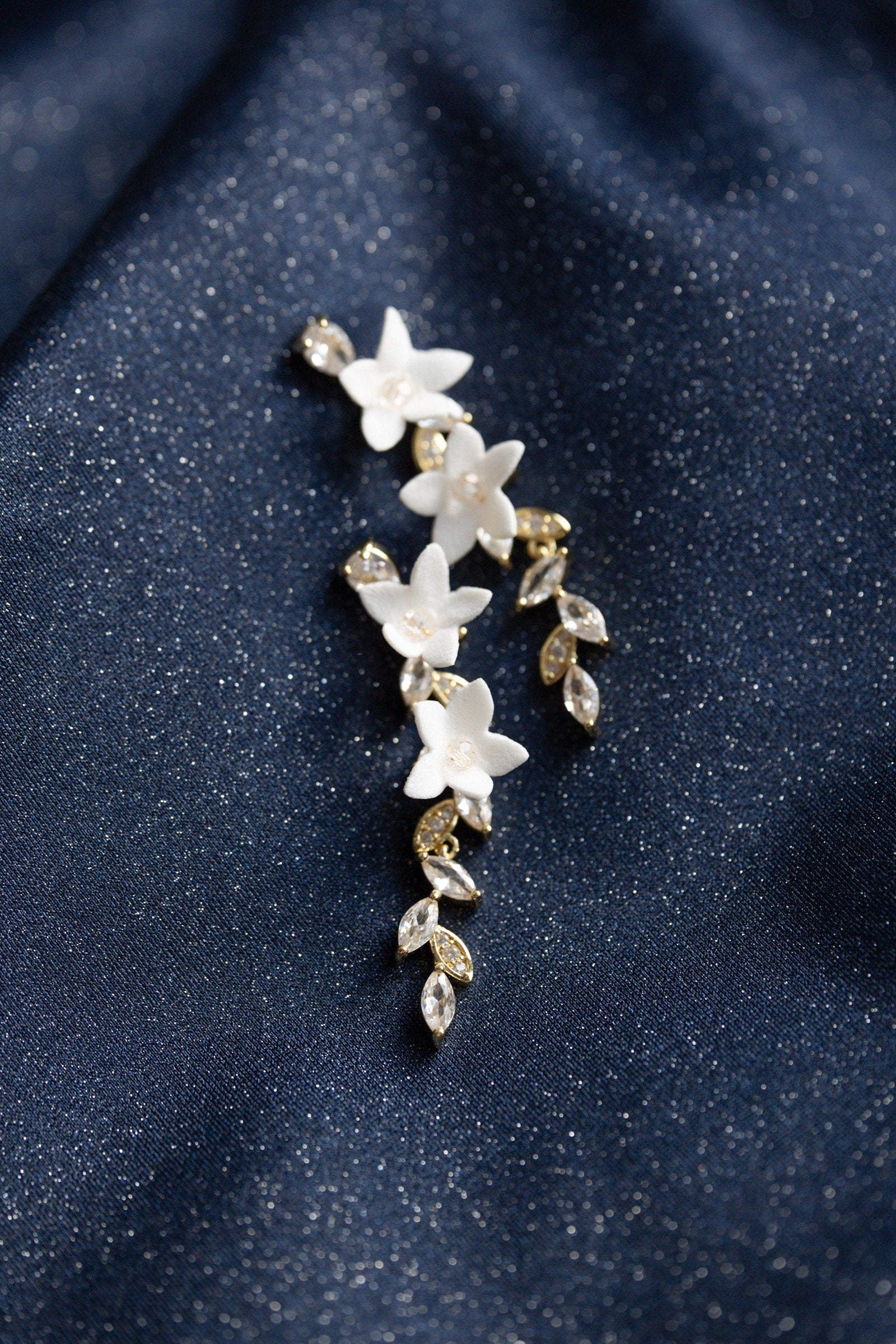 Shiny zircons with a leaf motif combined with white flowers are a great proposition for wedding earrings. A composition of elegance with a natural accent will perfectly complement romantic styles, and will add freshness and lightness to classic ones.