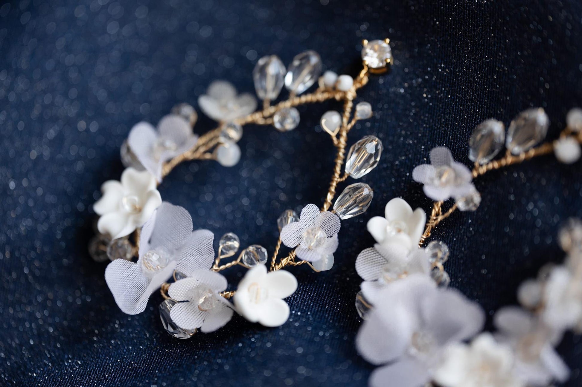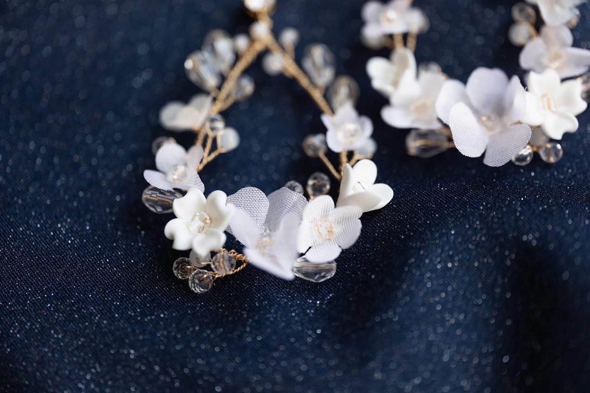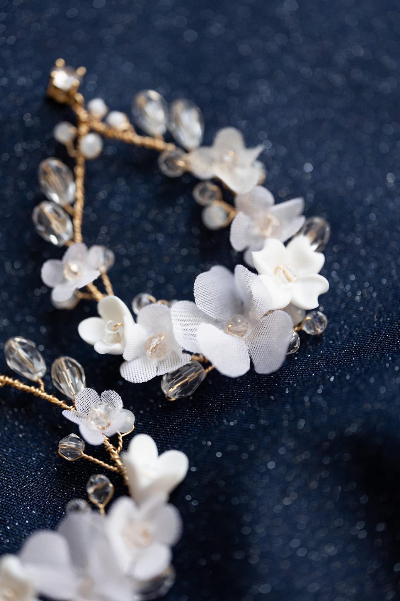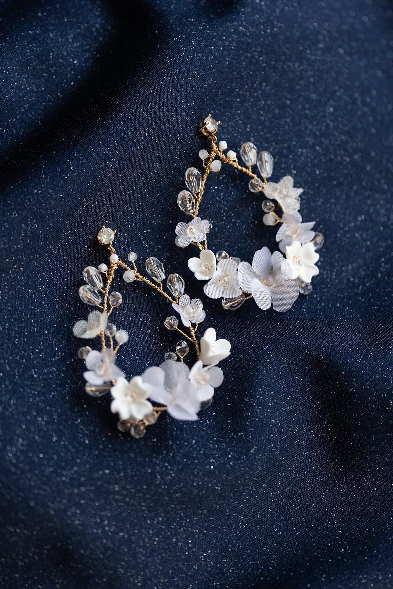 Hochzeitsohrringe, reich verziert mit Seide, weißen Blumen und Kristallen, inspiriert von Mustern aus meinem Atelier. Die Komposition wird durch eine Nadel mit einem zarten Zirkon ergänzt. Sie passen sowohl zu Spitzen- als auch zu minimalistischen Brautkleidern.