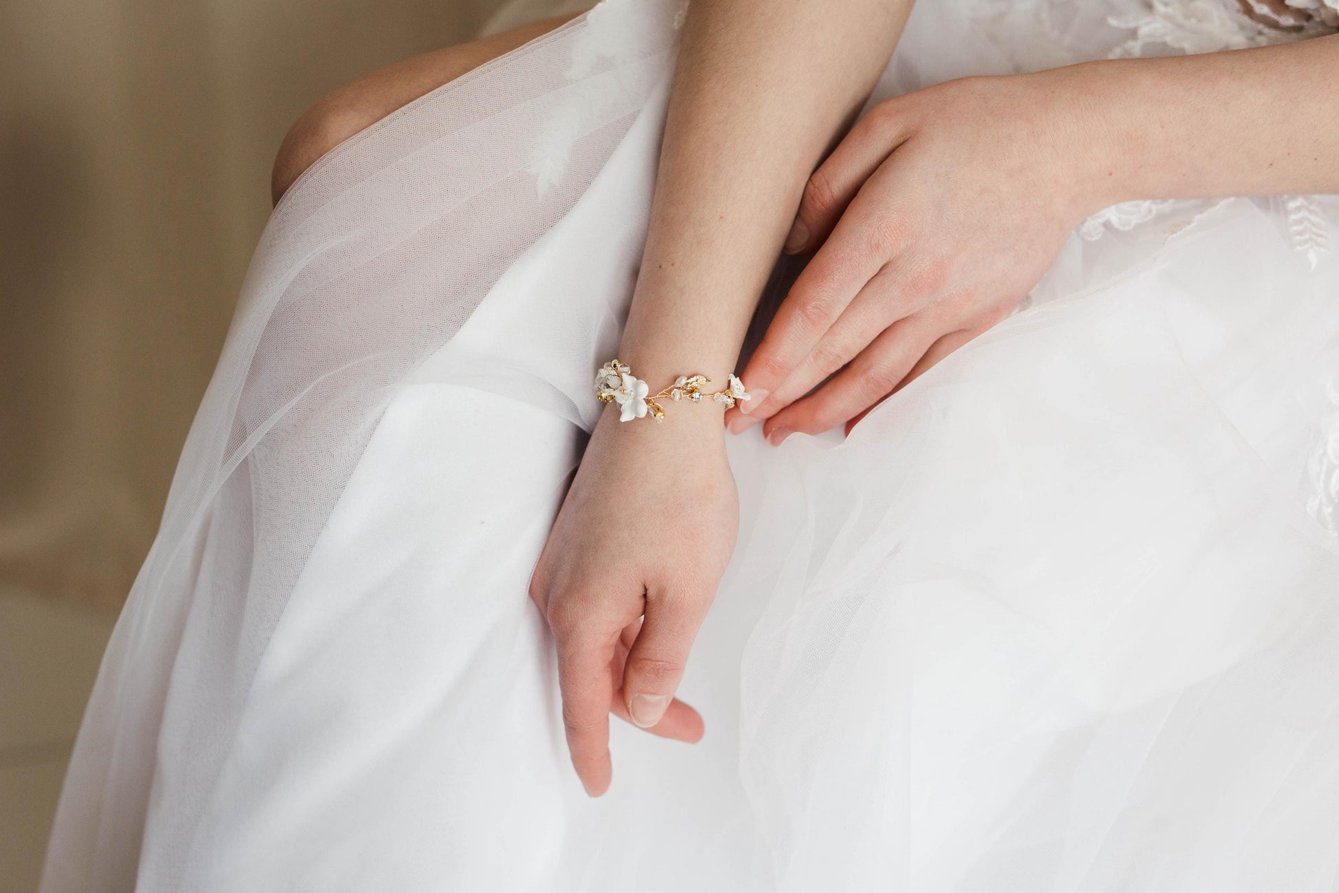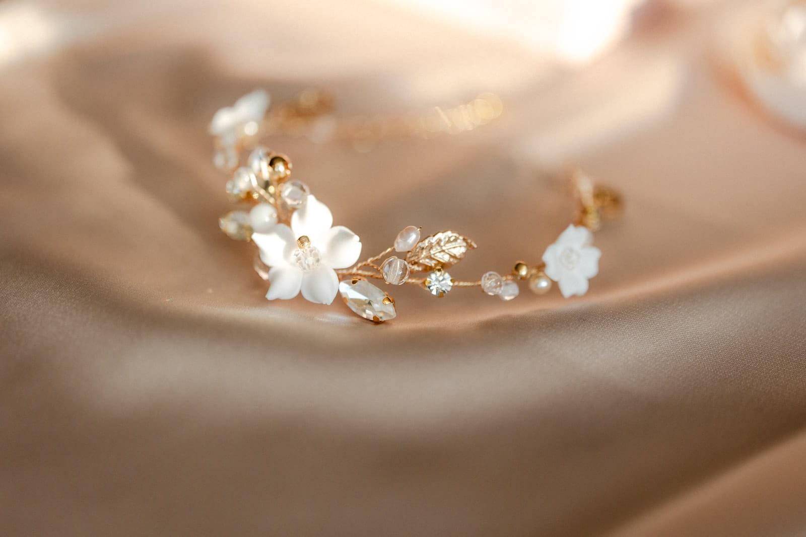Ein einzigartiges, handgefertigtes Hochzeitsarmband ist ein Accessoire, das Ihrem Styling Glanz verleiht. Die Kombination aus weißen Blumen, goldenen Details und glänzenden Steinen macht es zu einem Schmuckstück voller Anmut und Klasse. Das Armband ist zart und dezent und zieht gleichzeitig die Blicke auf sich. Es ist die ideale Wahl für Bräute, die Wert auf einen romantischen und eleganten Stil legen.
