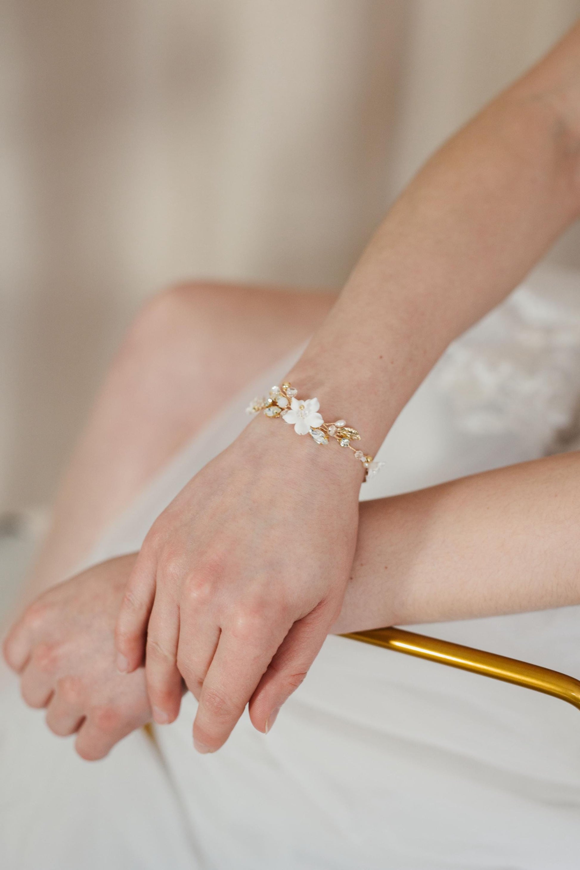 White Sofia - Boho Brautarmband mit Blumen und Kristallen
