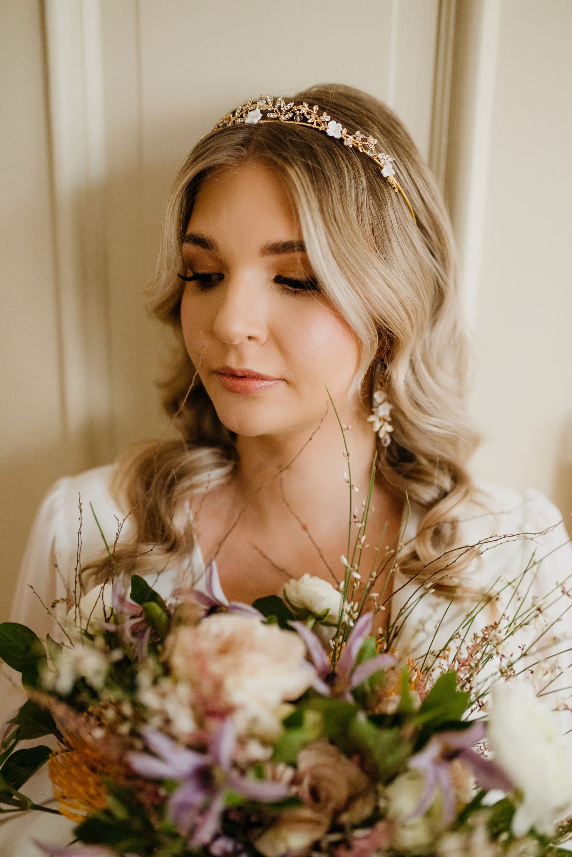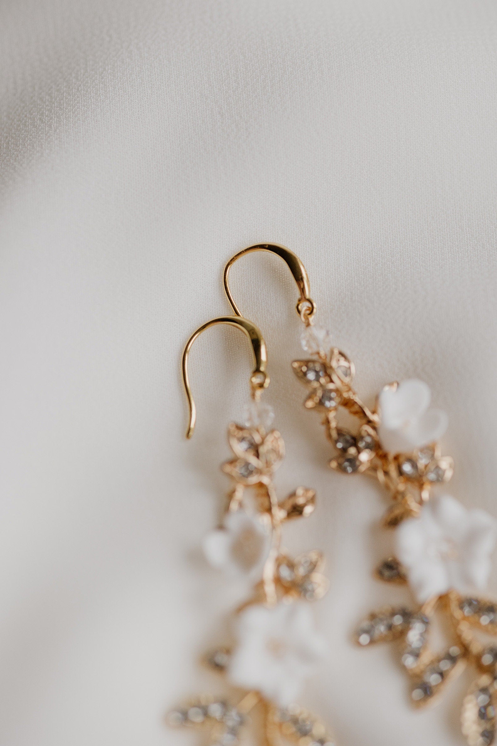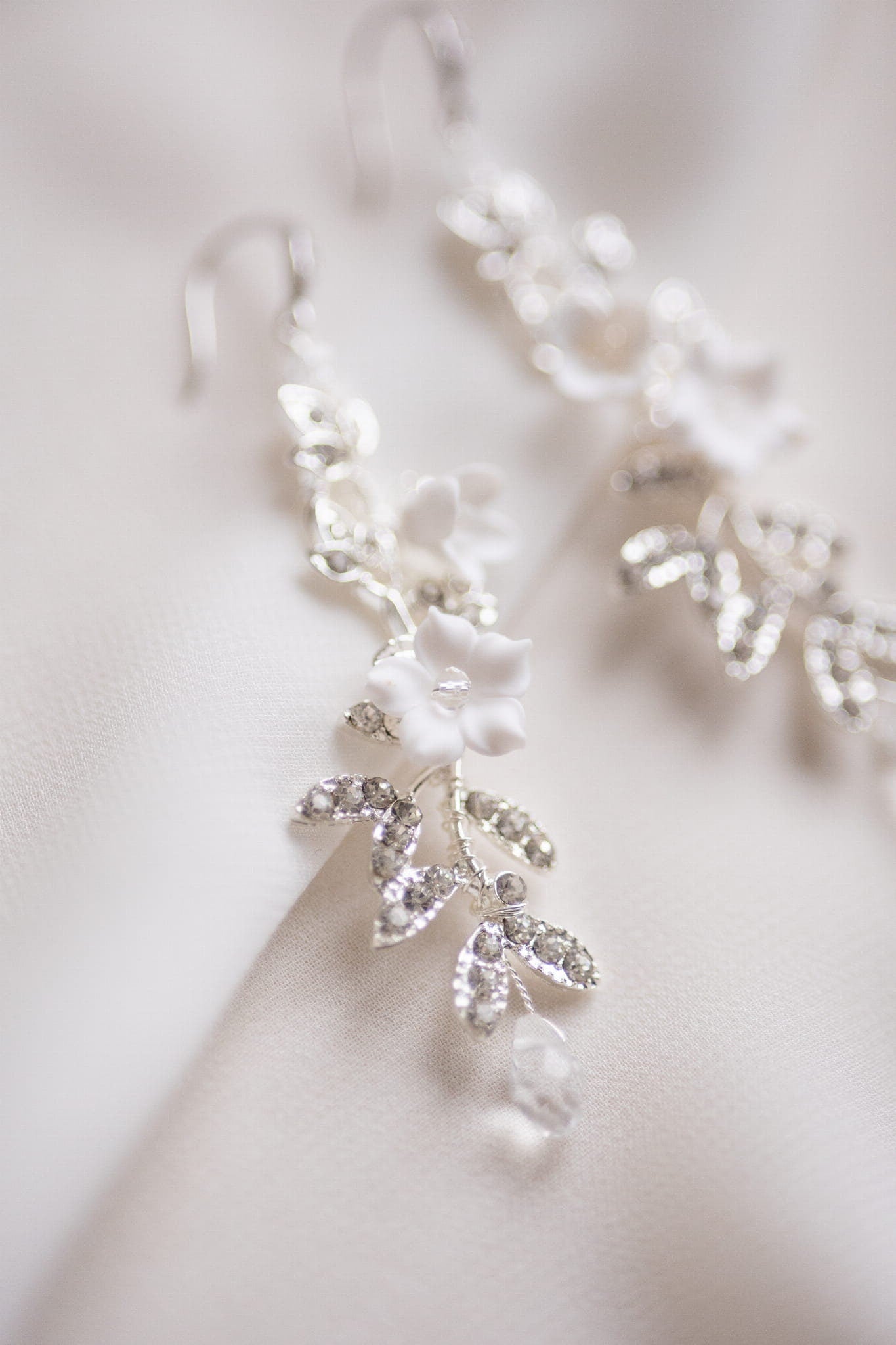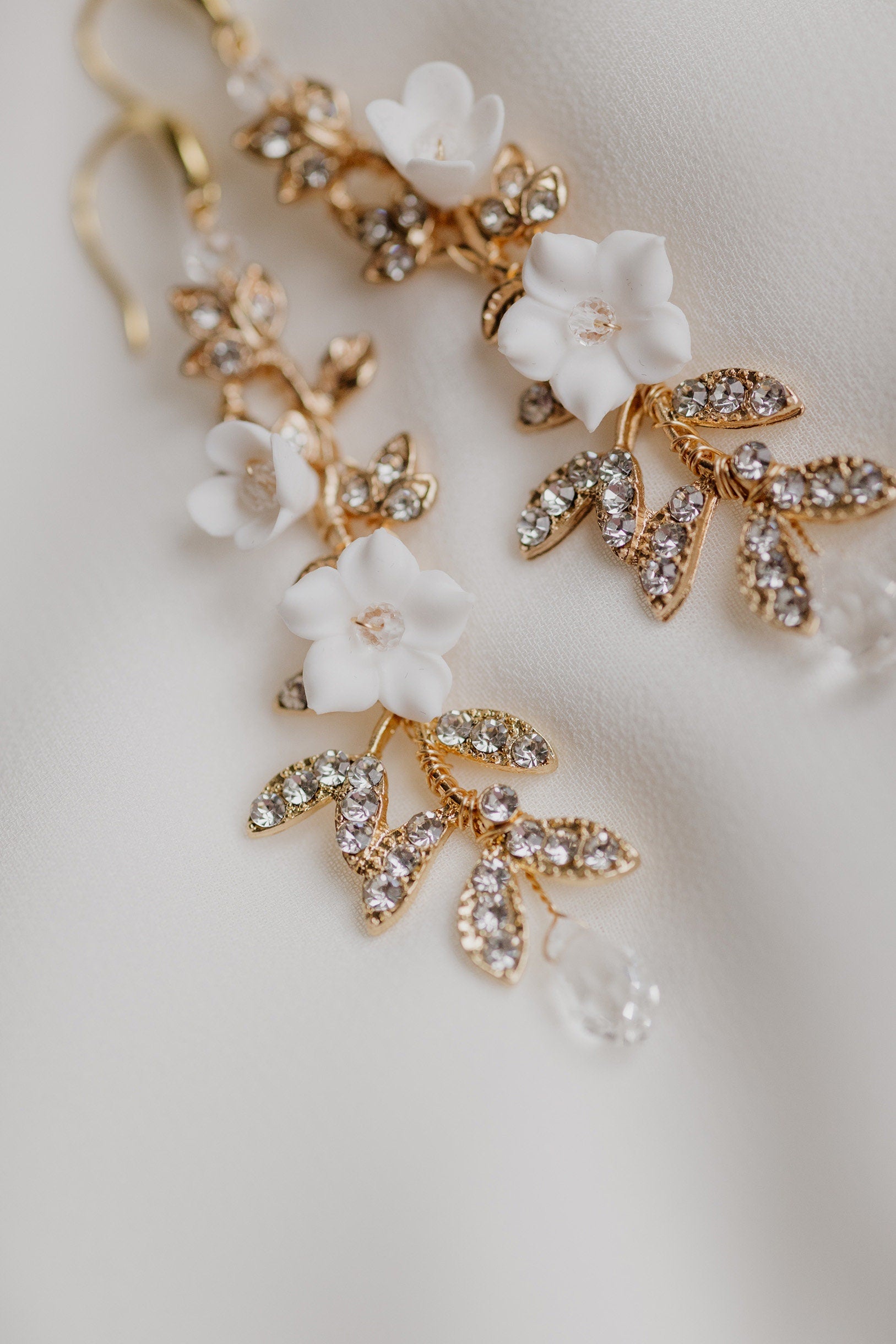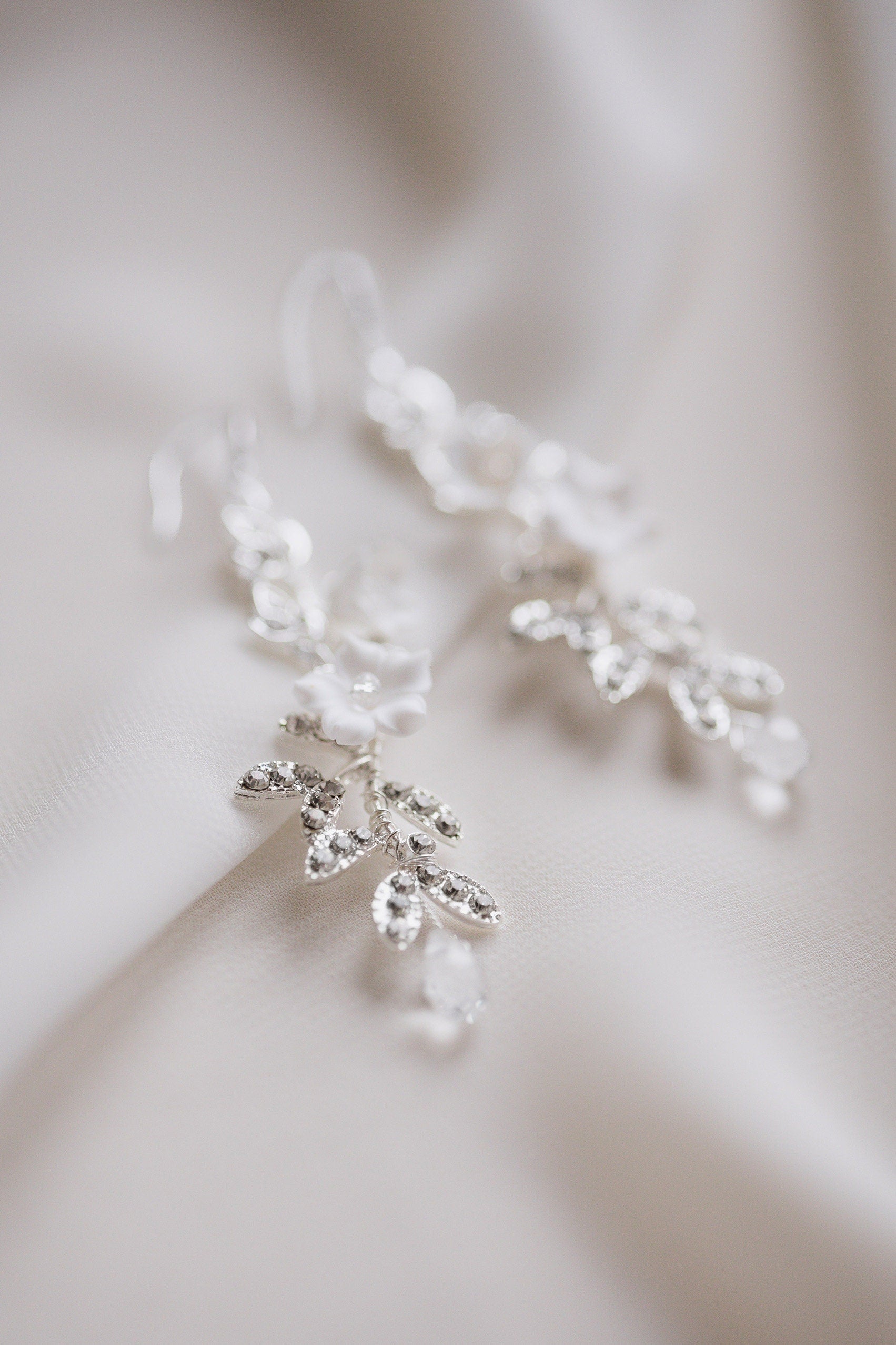 Elegante Hochzeitsohrringe aus glitzernden Zweigen mit Zirkonia und weißen Blumen sind das perfekte Accessoire für die Braut, die sowohl Glamour als auch Romantik bewahren möchte. Der schicke und doch feminine Trend ist zeitlos und liegt uns allen am Herzen.