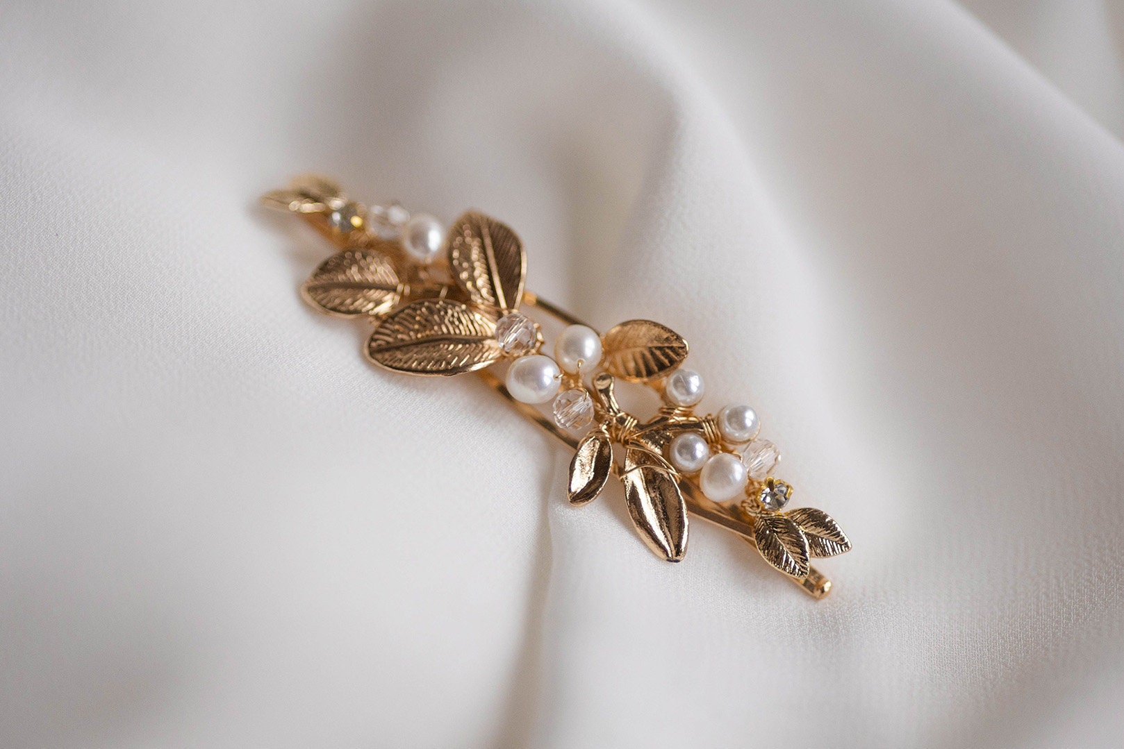 Eine wunderschön komponierte, dekorative Haarnadel aus funkelnden Kristallen, Perlen und hübschen Blättern ist eine perfekte Ergänzung für romantische und rustikale Stylings. Mit ihrer zeitlosen Eleganz schmückt sie aber auch klassische und glamouröse Stylings. Dank der praktischen Einsteckform können Sie sie an verschiedene Frisuren anpassen – verschiedene Dutts, Hollywood-Wellen und Hochzeitspferdeschwänze.