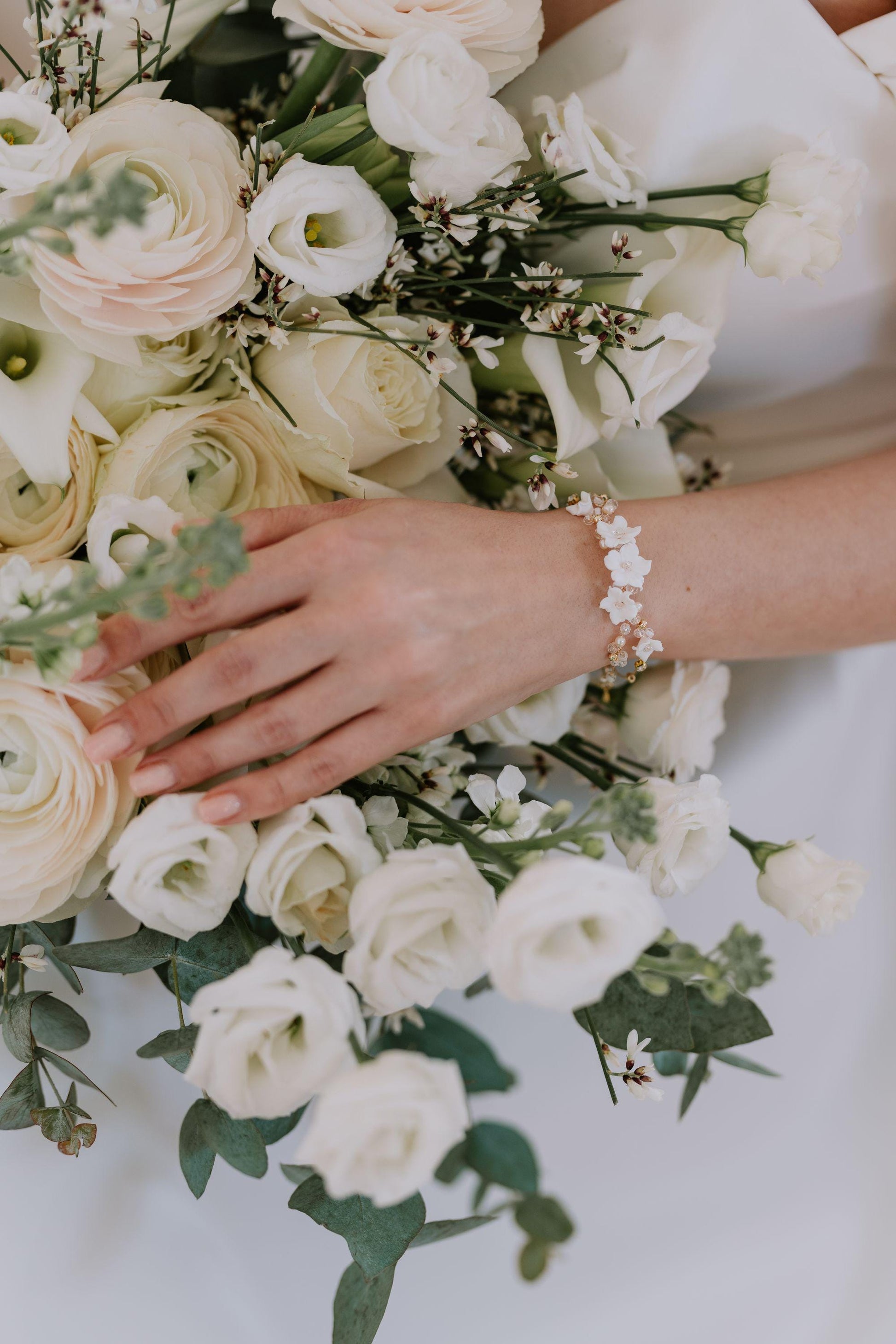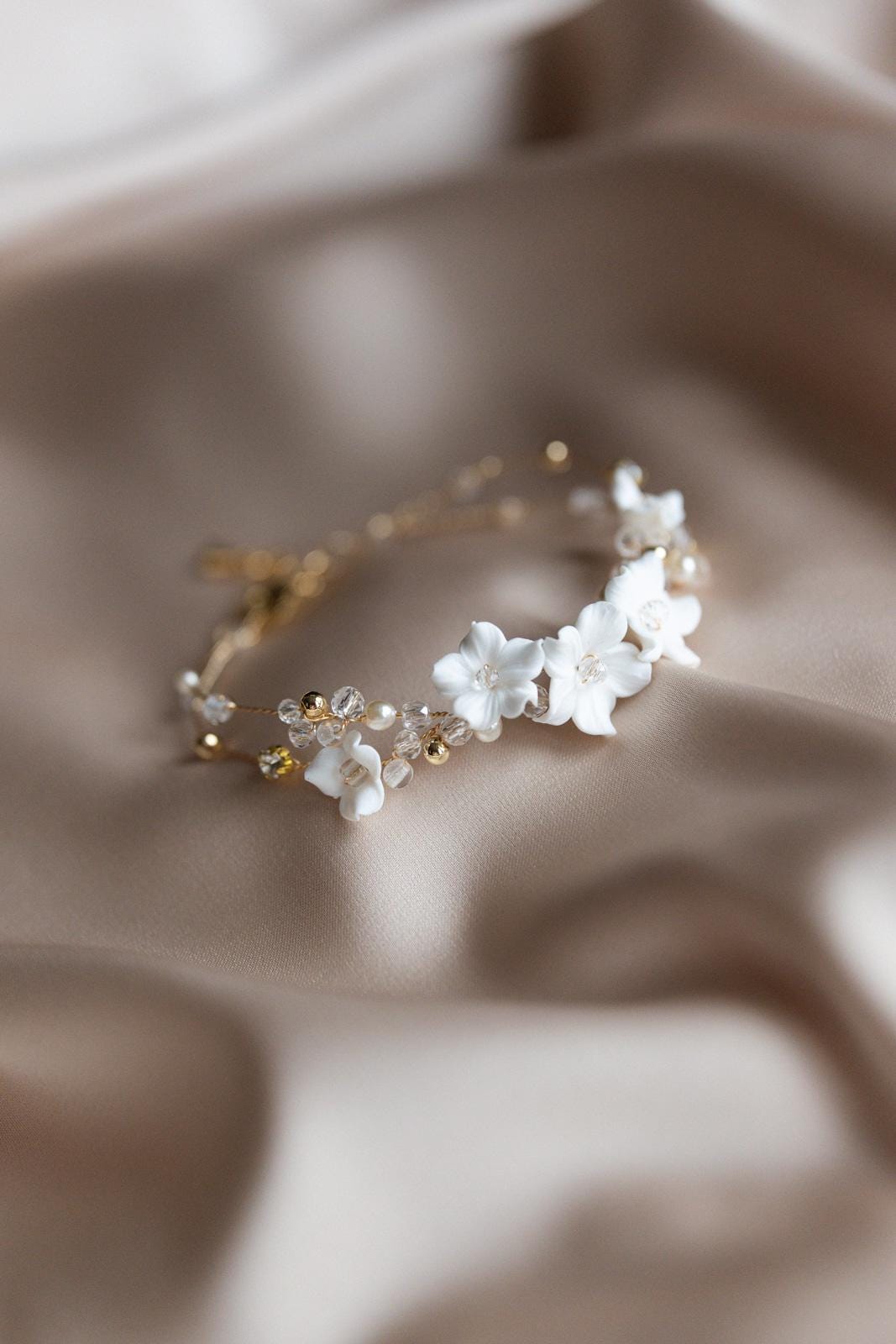 Jedes Detail dieses handgefertigten Armbandes wurde mit Blick auf zukünftige Bräute entworfen. Zarte weiße Blumen und glänzende Kristalle verleihen ihm einen einzigartigen Look, und die leichte Konstruktion sorgt für höchsten Tragekomfort. Es passt perfekt zu anderen Elementen des Hochzeitsschmucks und bildet ein stimmiges und elegantes Ganzes.