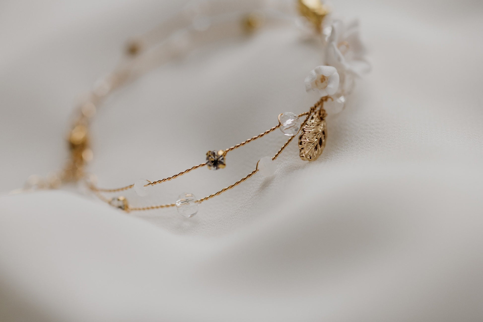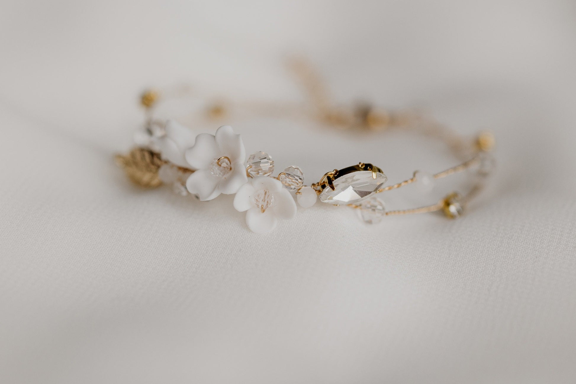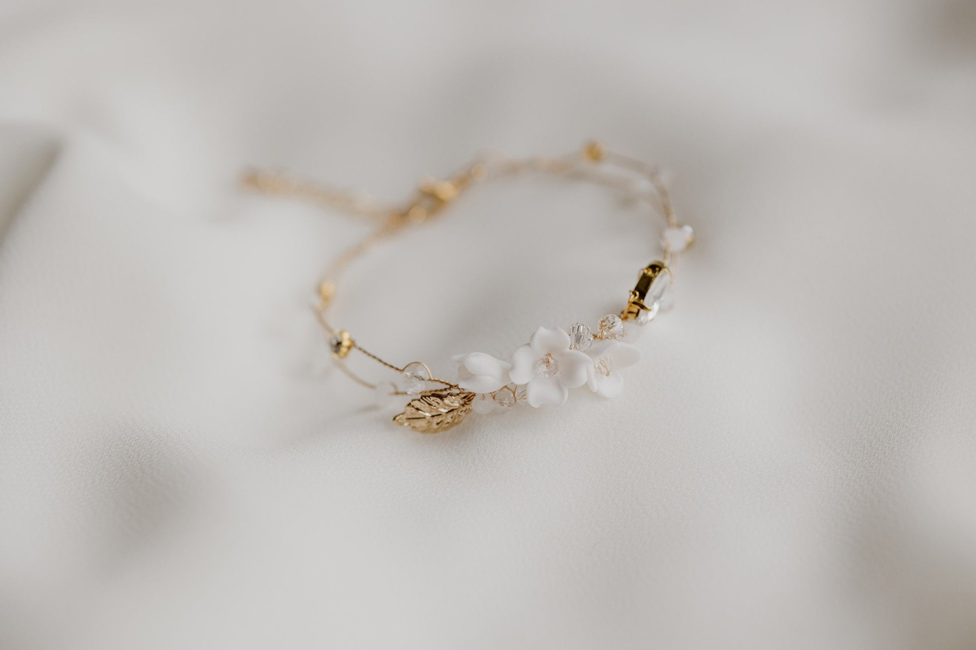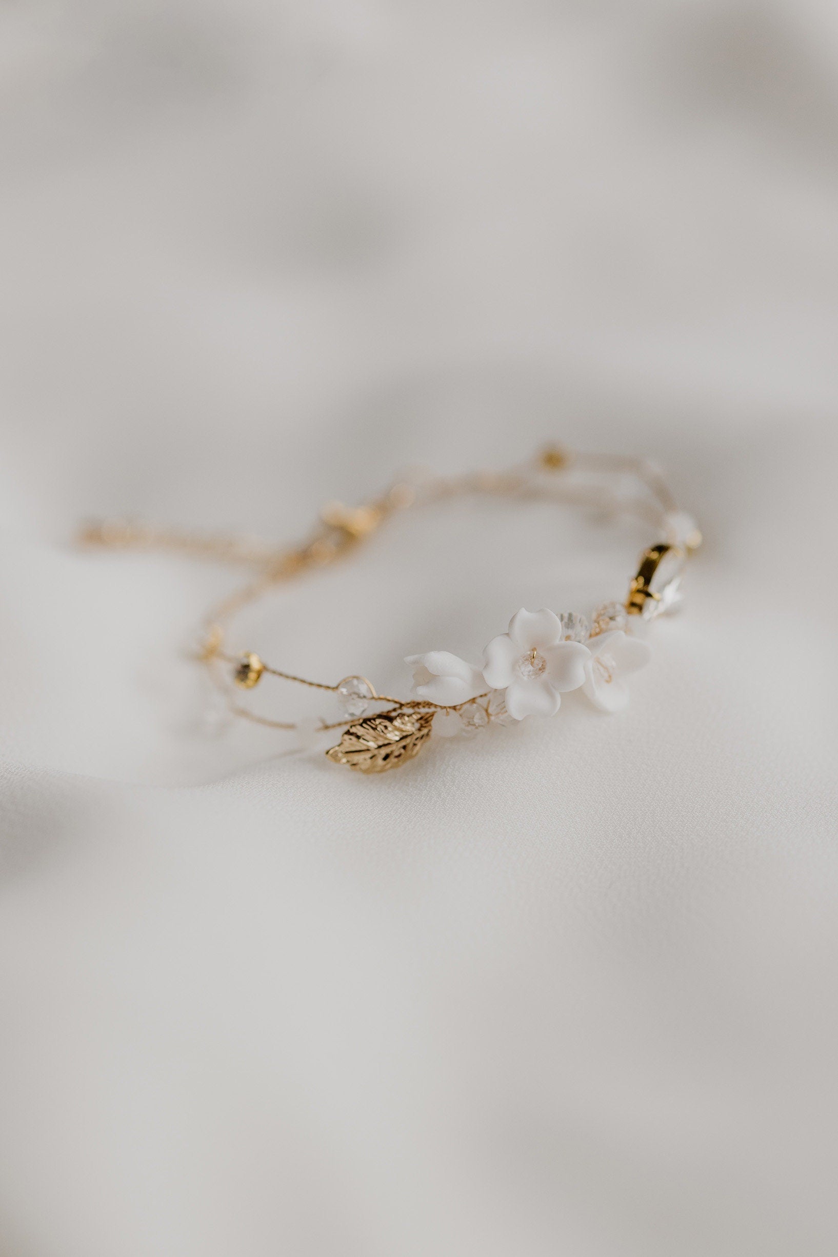 Ein zartes Hochzeitsarmband aus weißen Blumen, schimmernden Blättern und Kristallen rundet Ihr Traumhochzeits-Styling ab. Auf subtile und charmante Weise verleiht es ihm Chic und Originalität. Es passt perfekt zu einem romantischen, rustikalen oder klassischen Stil.