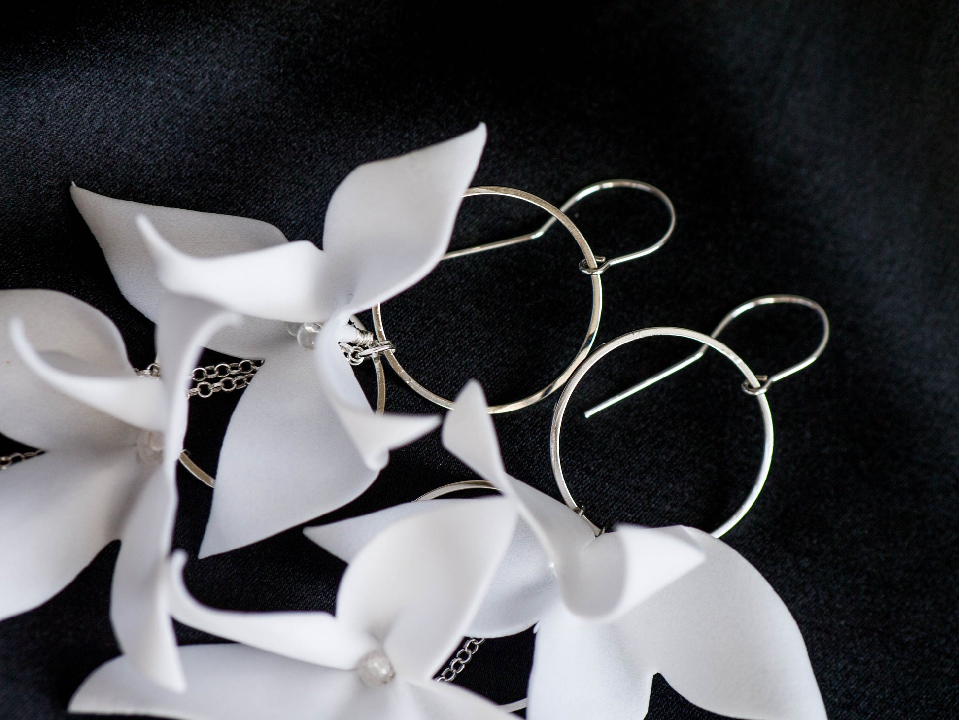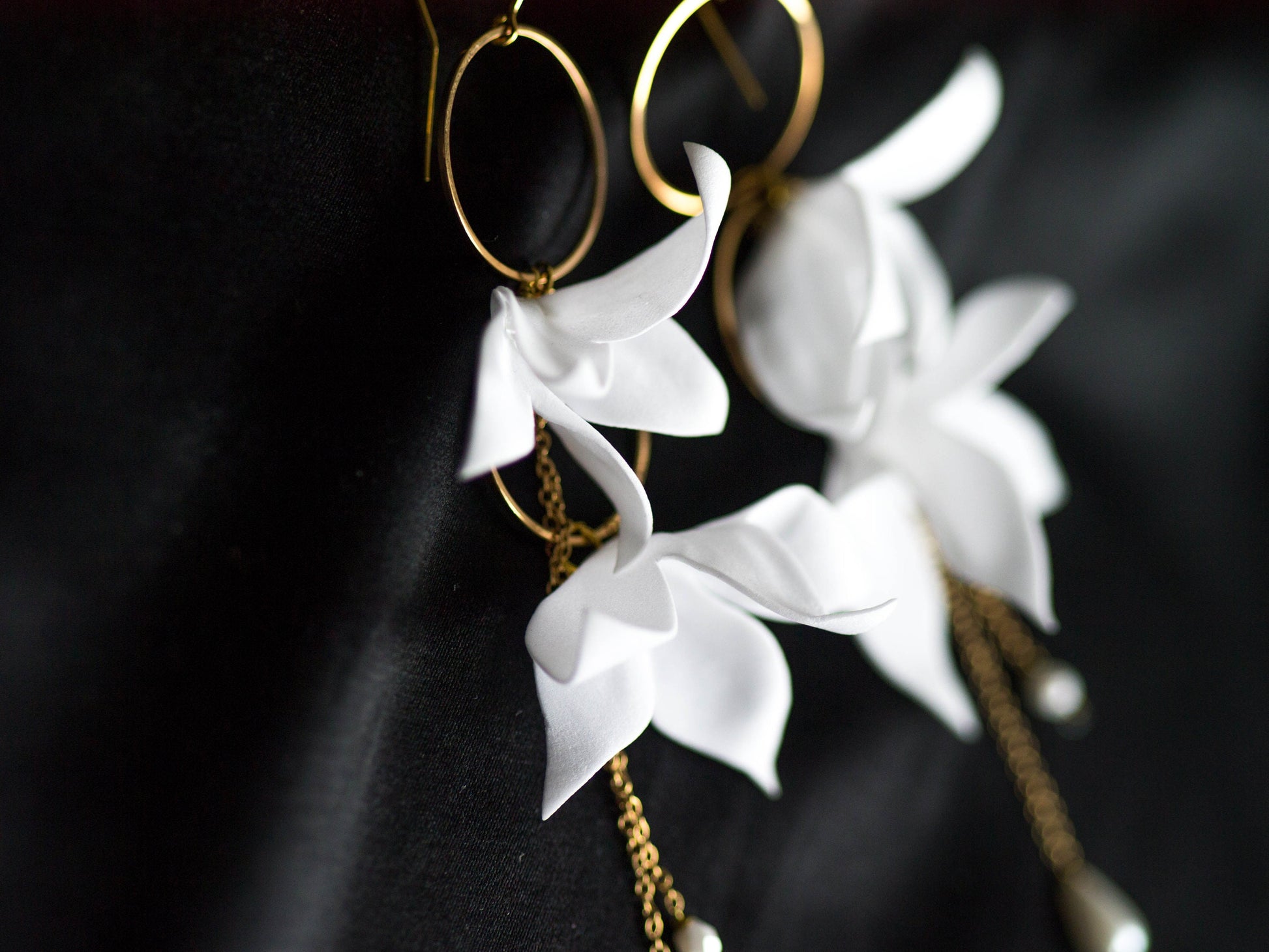 Feminin und ätherisch, von der Natur inspiriert, wunderschöne Hochzeitsohrringe. Betonen perfekt den Stil minimalistischer Kleider und verleihen ihnen subtile Zartheit und Leichtigkeit. Die Blumen bestehen aus weißem, handmodelliertem thermoplastischem Schaum, sind unverformbar und wasserdicht. Die übrigen Halbfertigprodukte sind in einem Goldton gehalten.