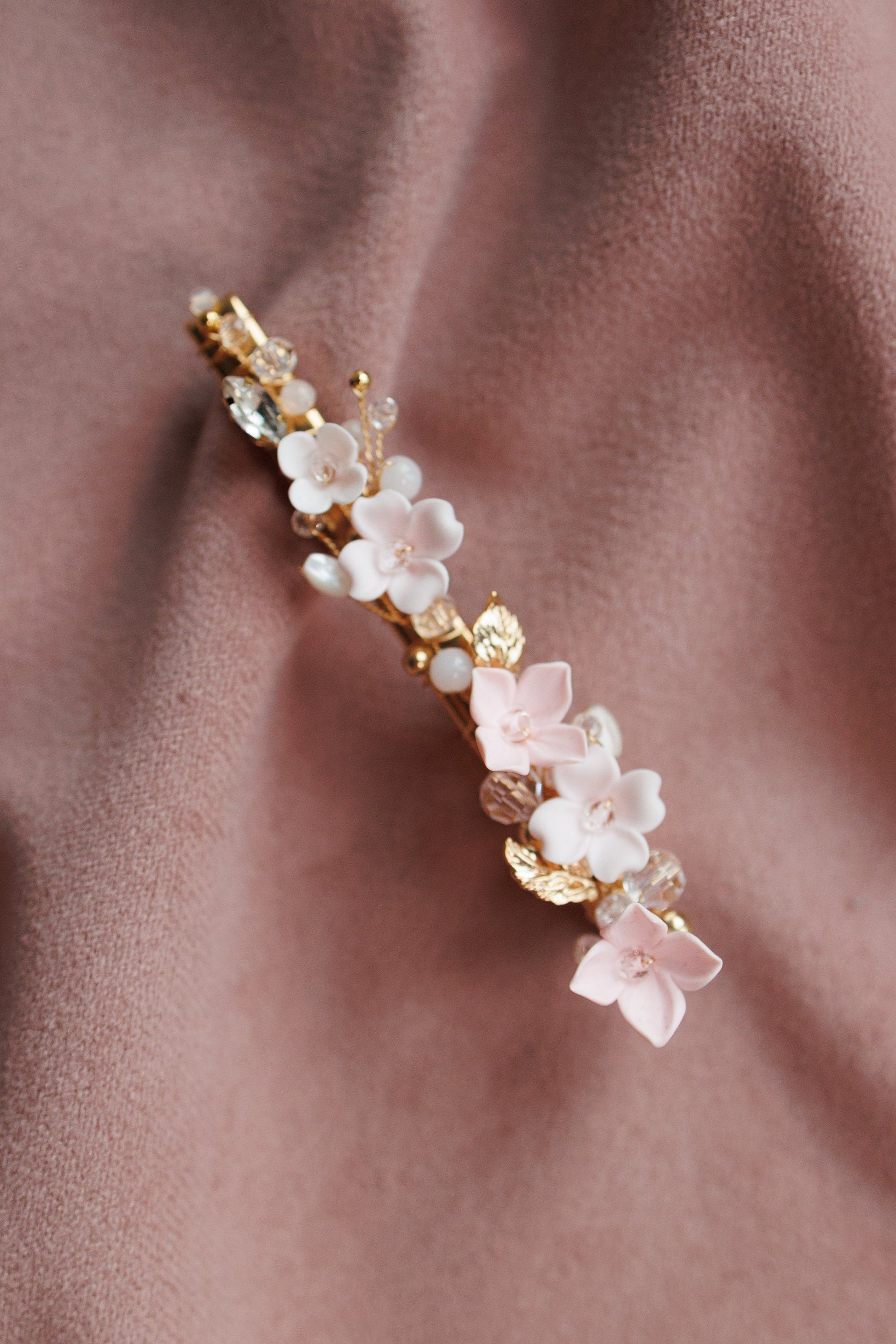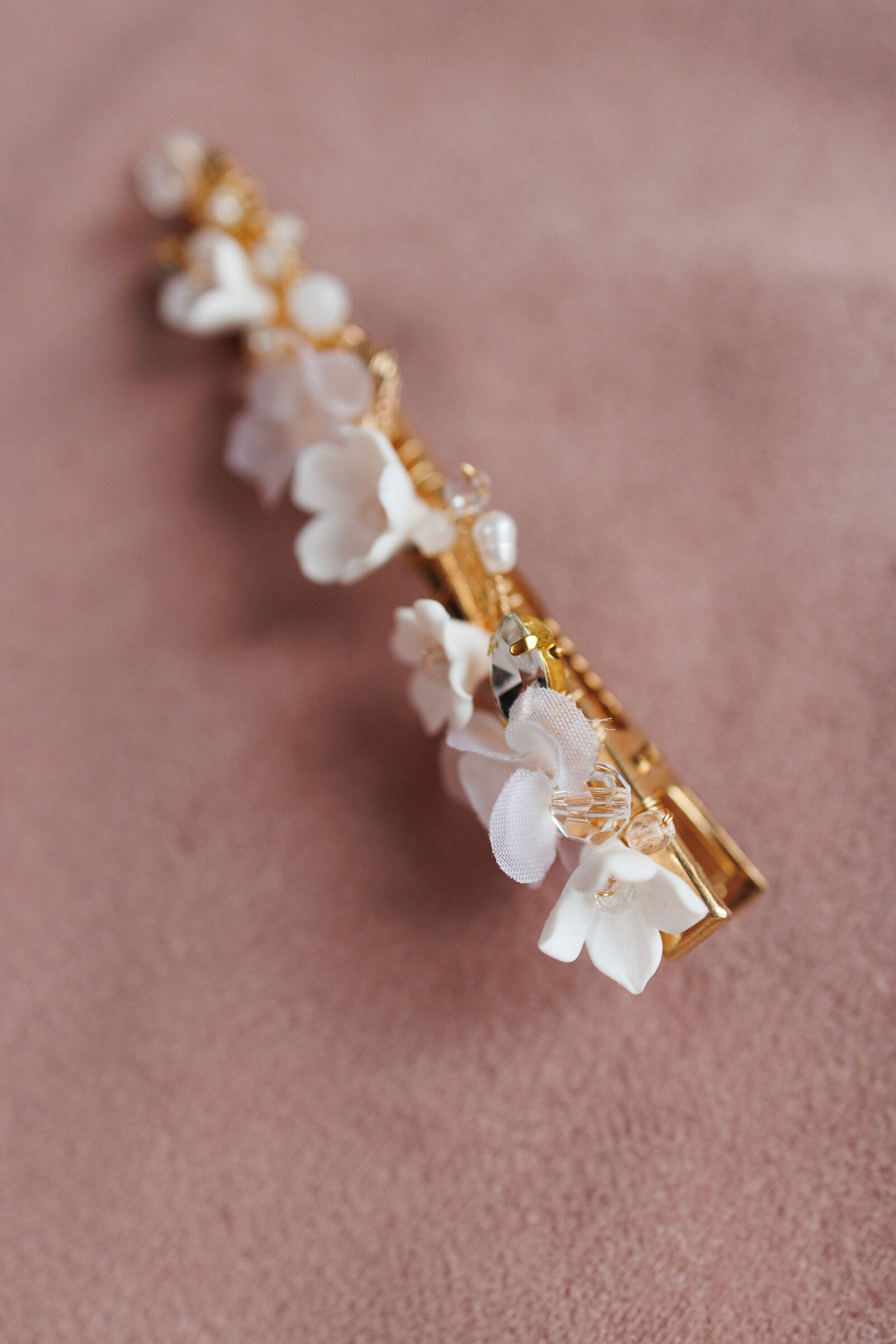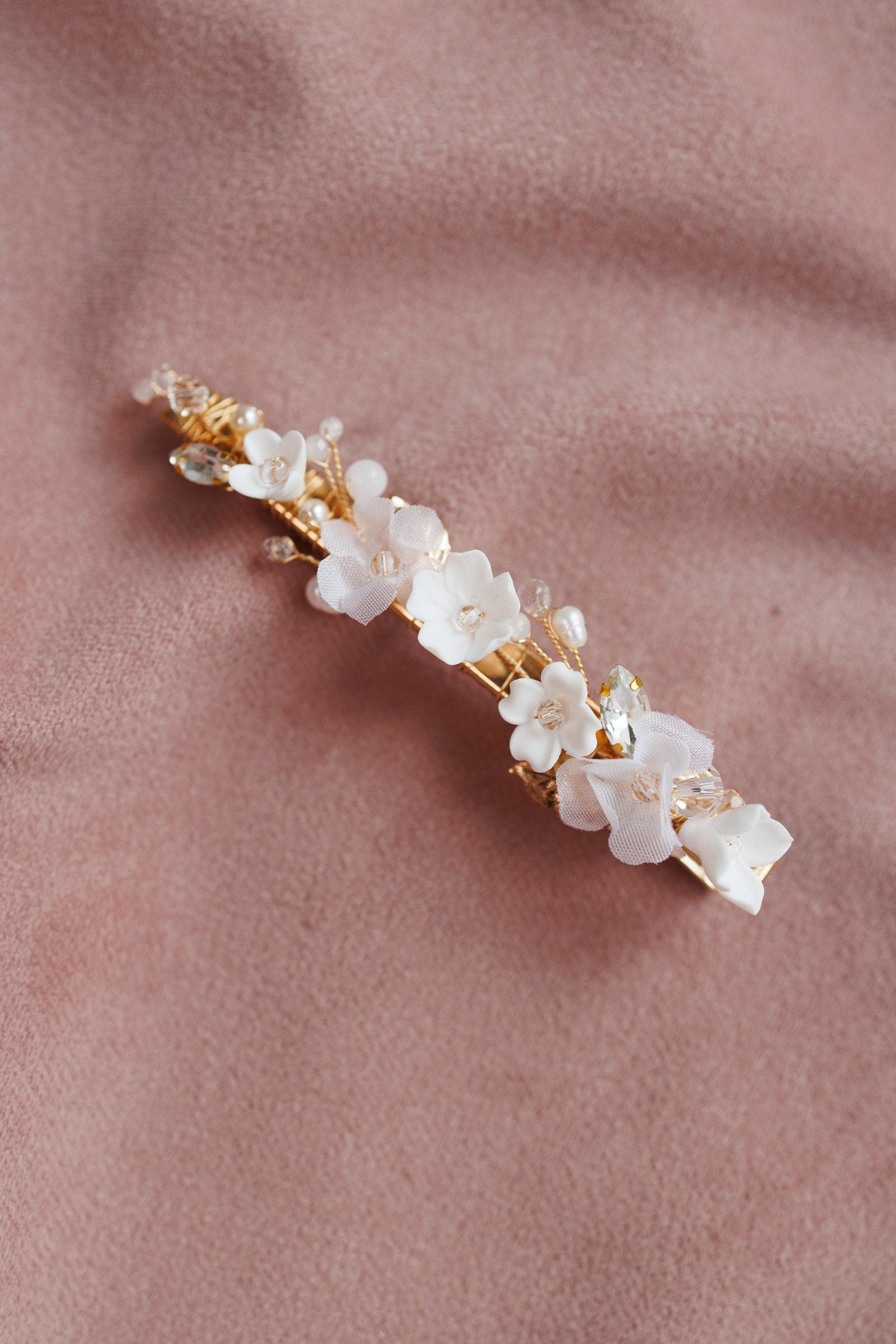 Eine dekorative Haarnadel, zart und gleichzeitig ausdrucksstark dank wunderschön glänzender Blätter, Kristalle und Perlen, verziert mit Blumen, verschönert sowohl glatte Dutts als auch leicht offenes Haar. Sie schmückt verschiedene Hochzeitsstile auf einzigartige und elegante Weise.