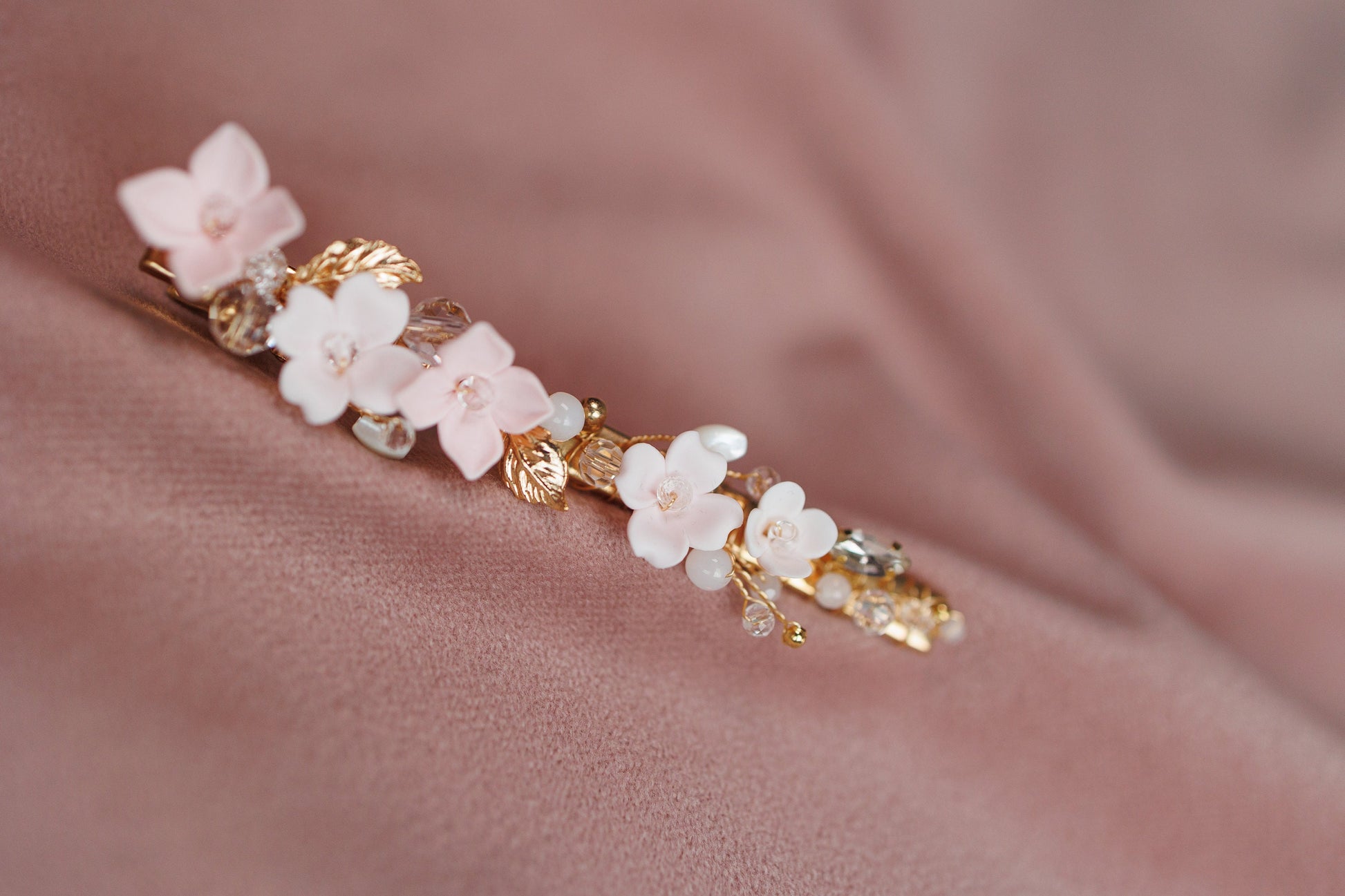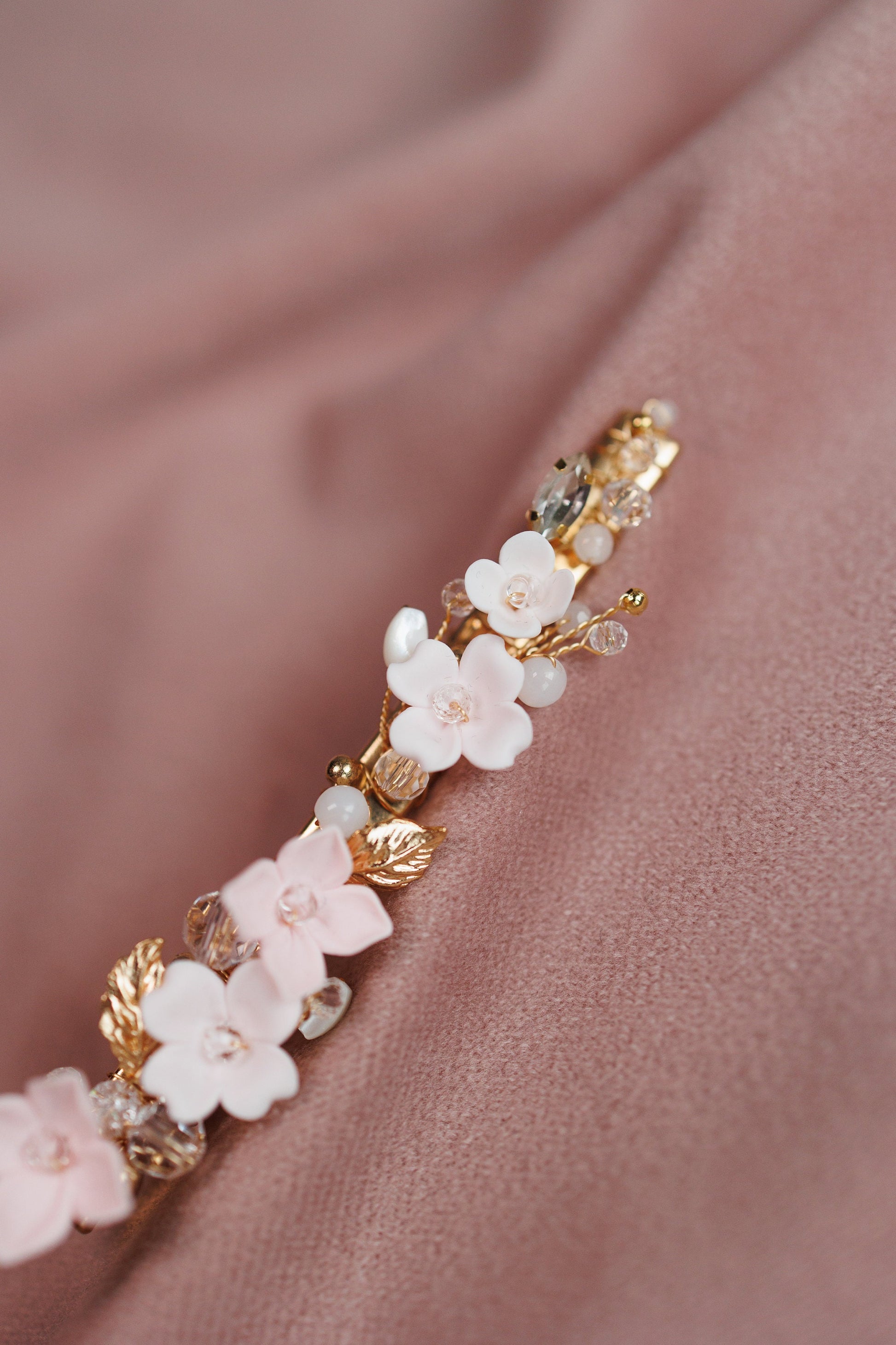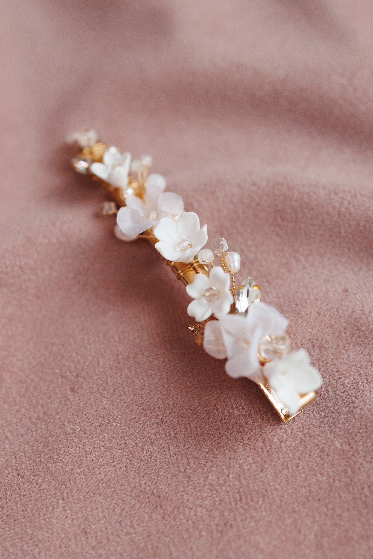 Eine dekorative Haarnadel, zart und gleichzeitig ausdrucksstark dank wunderschön glänzender Blätter, Kristalle und Perlen, verziert mit Blumen, verschönert sowohl glatte Dutts als auch leicht offenes Haar. Sie schmückt verschiedene Hochzeitsstile auf einzigartige und elegante Weise.
