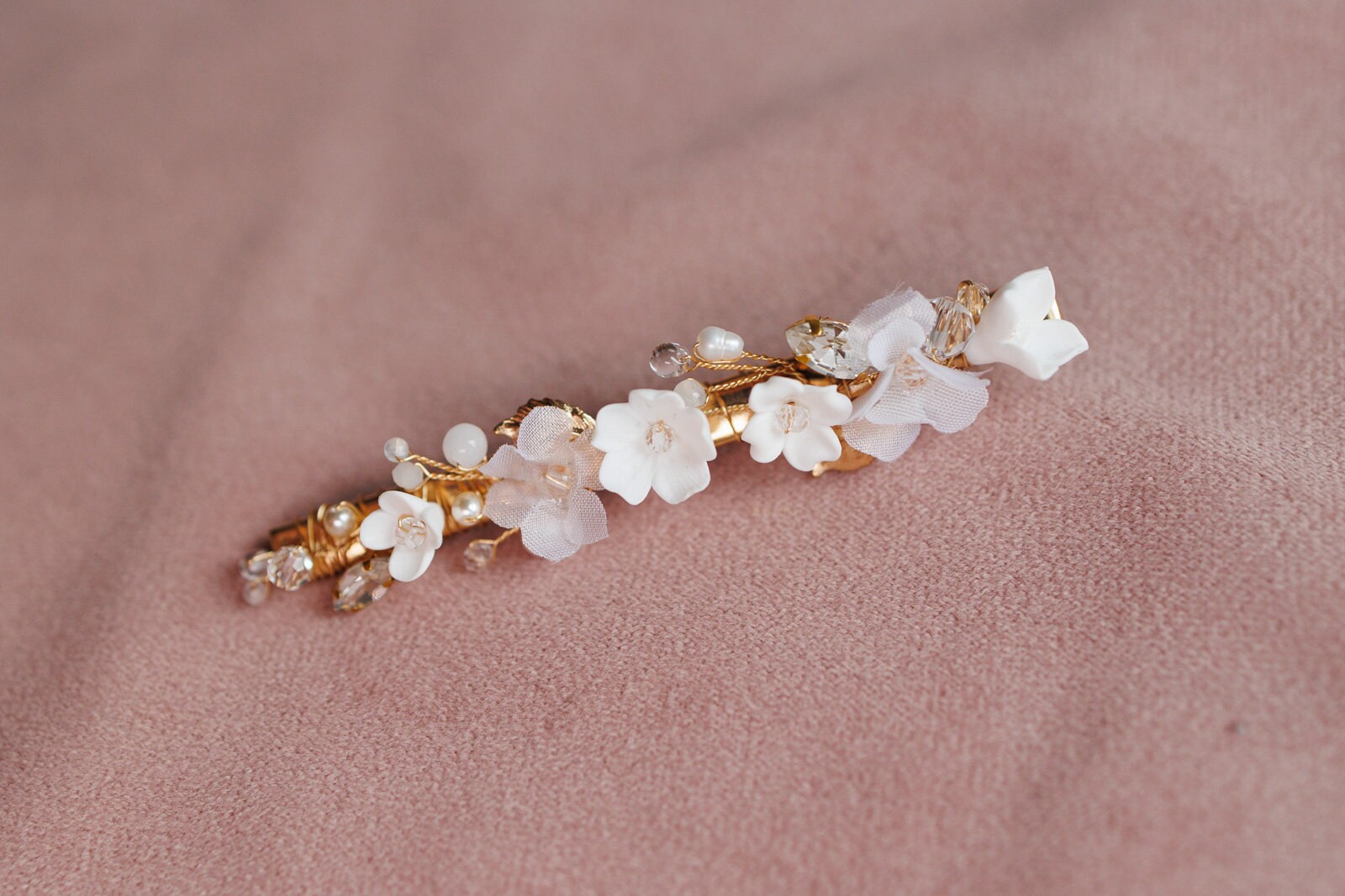 Eine praktische Befestigungsmöglichkeit des sogenannten „Froschs“ erleichtert Ihnen sicherlich die Einpassung der Dekoration in Ihre Traumhochzeitsfrisur.