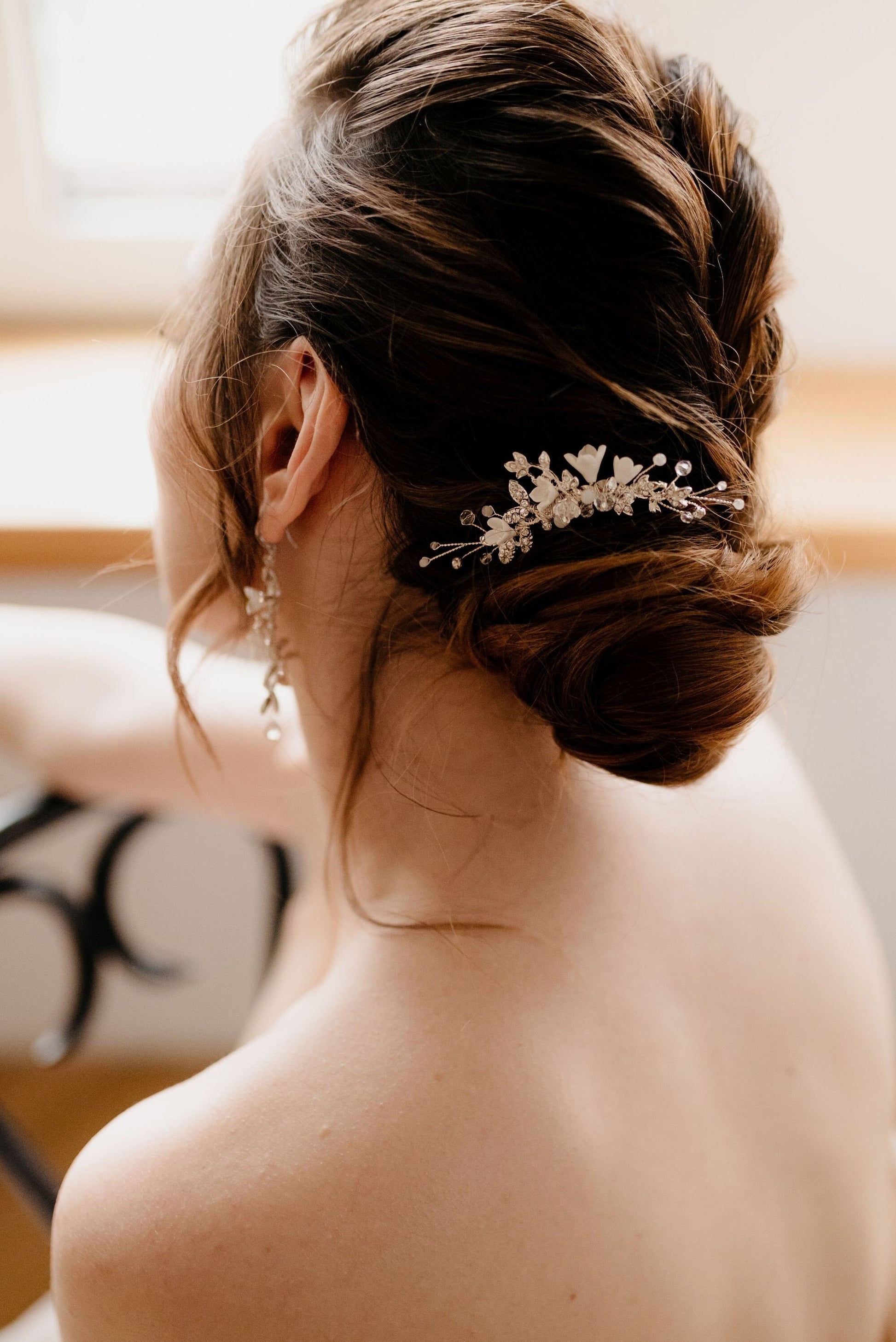 Ein eleganter Hochzeitskamm voller Magie und funkelnder Zweige, besetzt mit Zirkonen und weißen Blumen, schmückt perfekt verschiedene Frisuren – seitlich geschwungene Locken und zarte Hochsteckfrisuren. Seine kleine Form passt sowohl zu einem romantischen als auch zu einem klassischen Hochzeitslook und verleiht dem Ganzen Charakter und einzigartigen Charme.