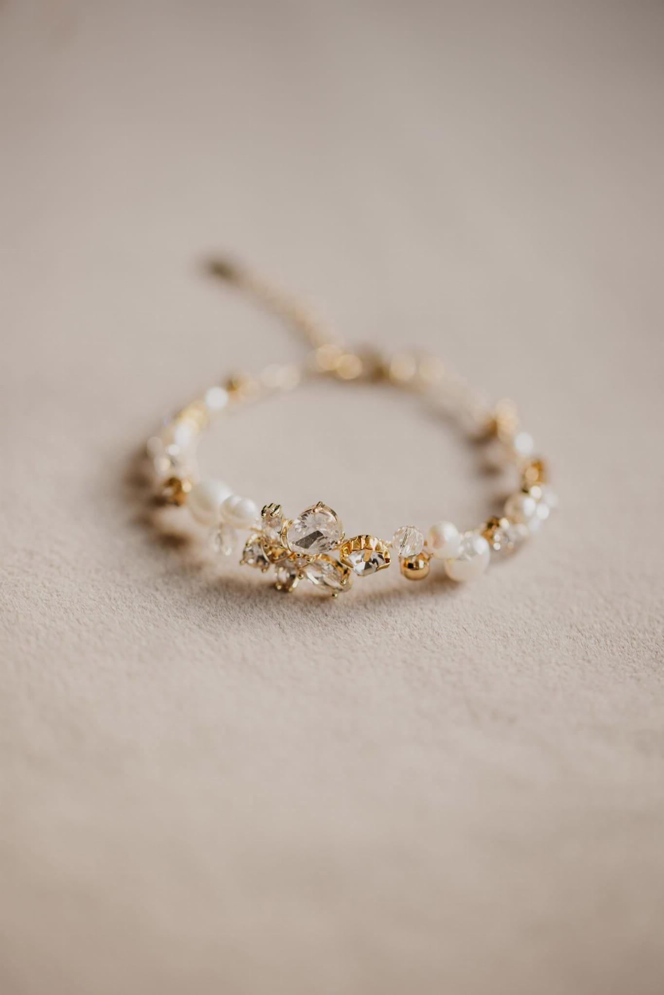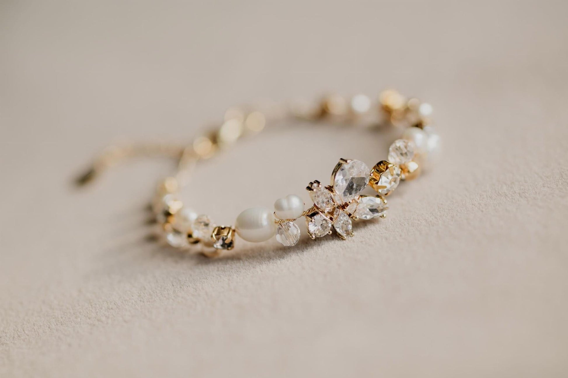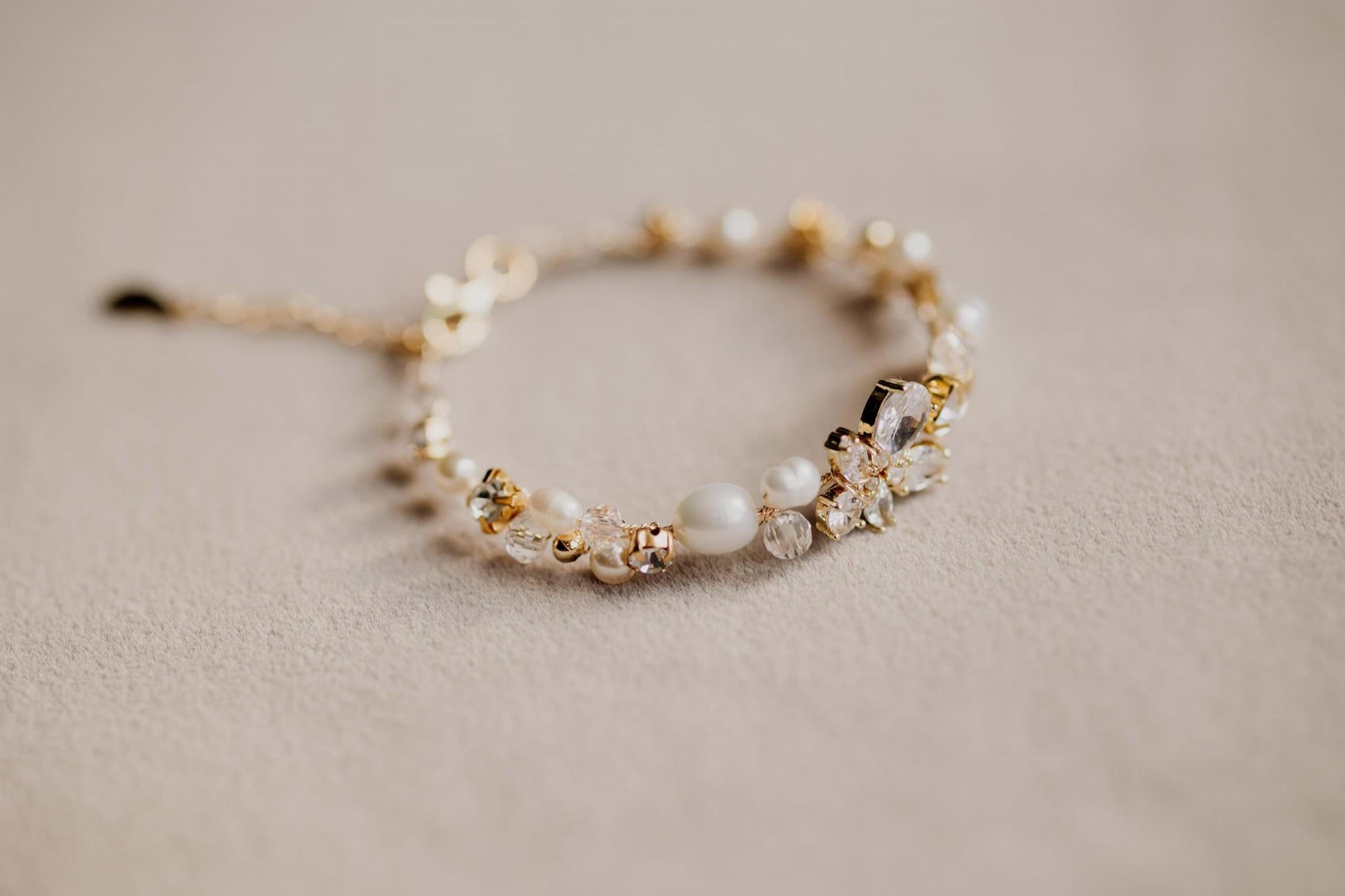 Das Hochzeitsarmband besticht durch den Glanz von Kristallen, Süßwasserperlen und vergoldeten Elementen und schmückt das Handgelenk der Braut auf charmante und einzigartige Weise. Der mühelose Chic unterstreicht perfekt den romantischen und klassischen Charakter des Hochzeitsstylings.