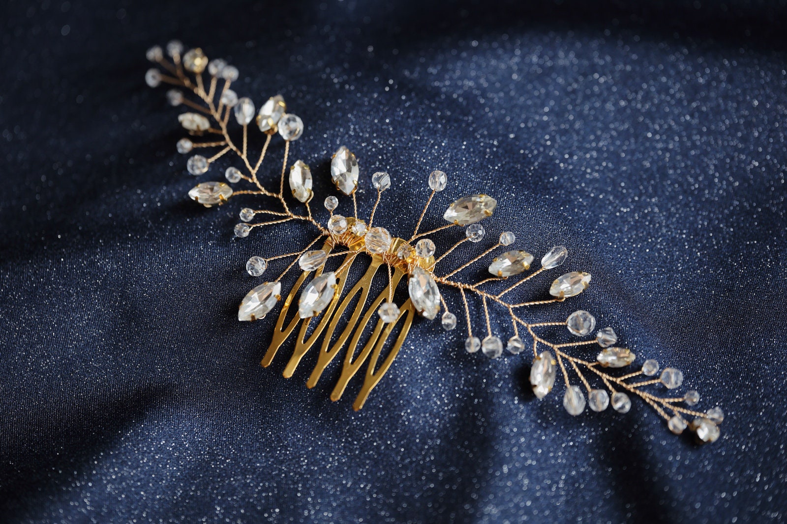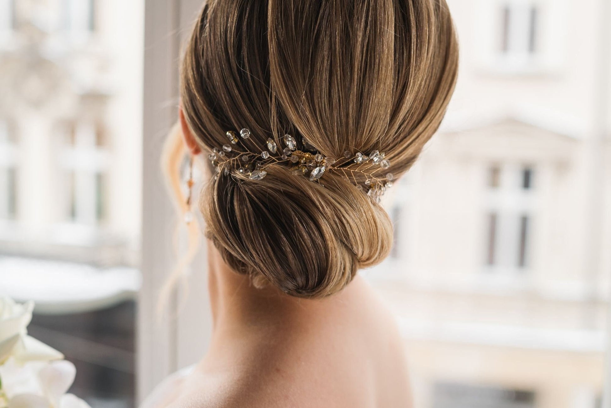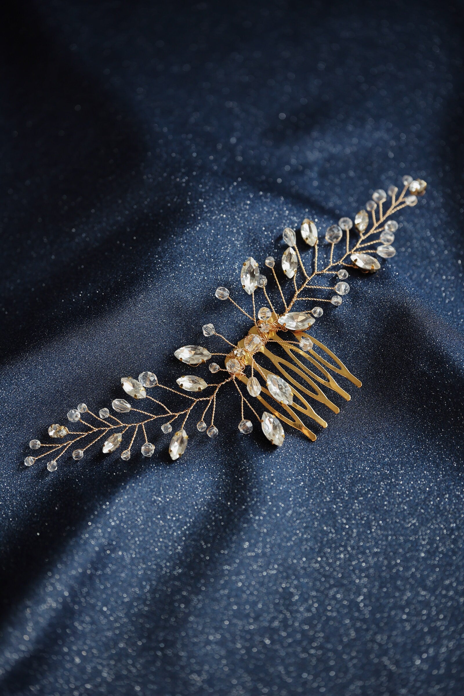 Ein dekorativer Hochzeitskamm voller Magie und funkelnden Kristallen ist die perfekte Ergänzung sowohl für romantische als auch für elegante Stile. Er eignet sich für leicht hochgesteckte Frisuren in einer romantischen Atmosphäre und verleiht klassischen Stilen Frische und einen ätherischen Charakter.