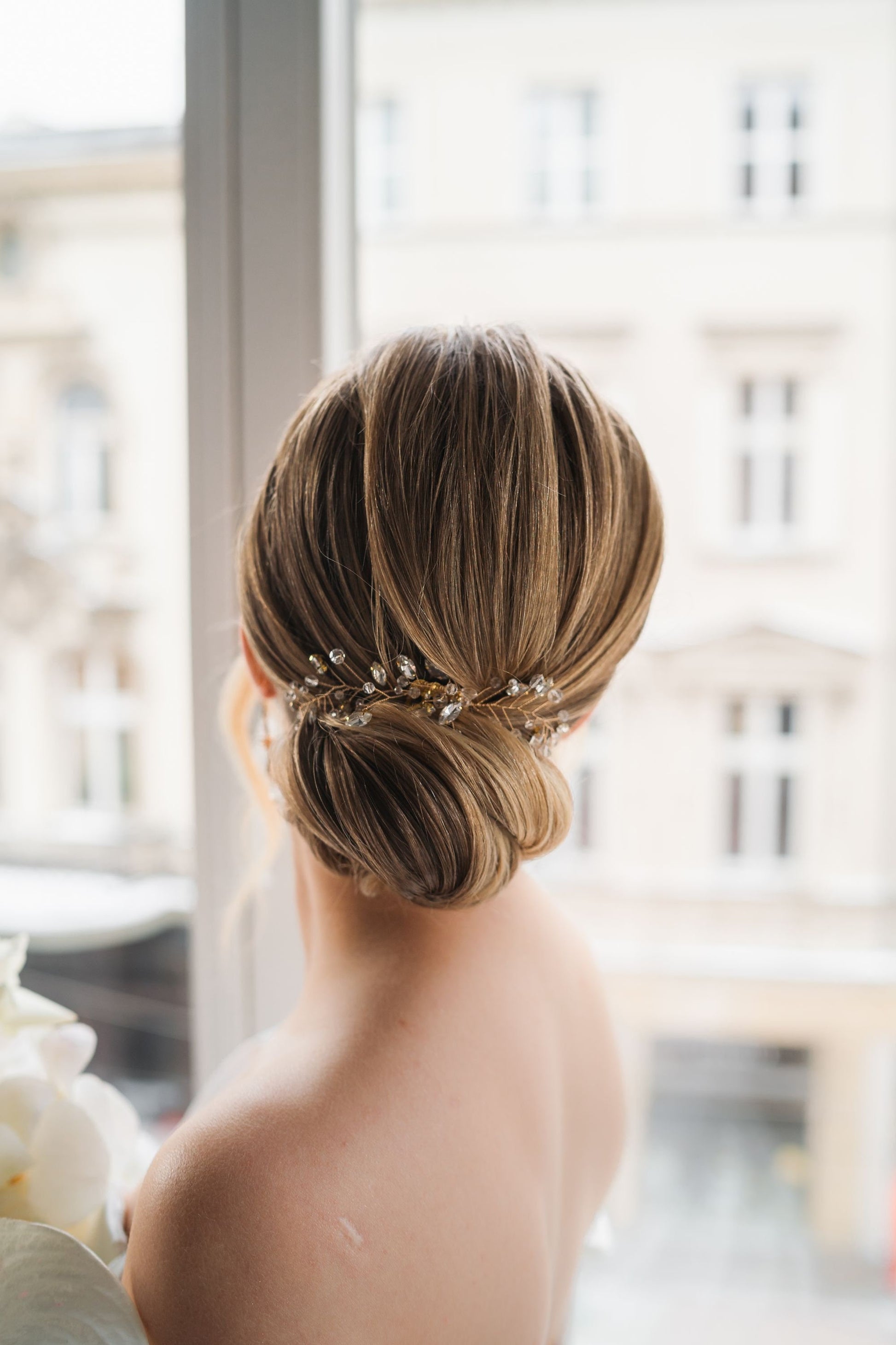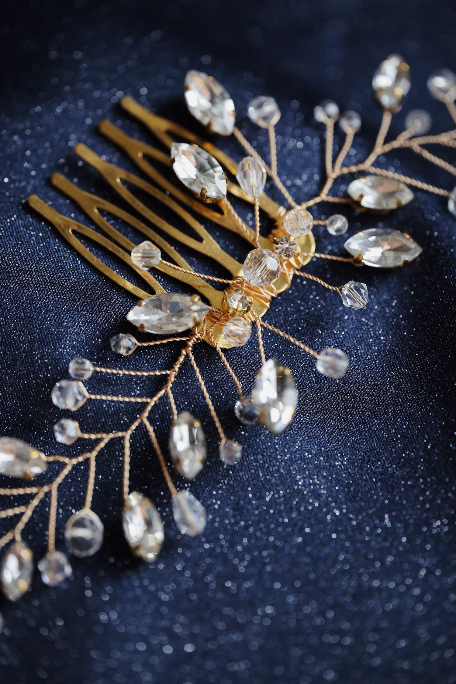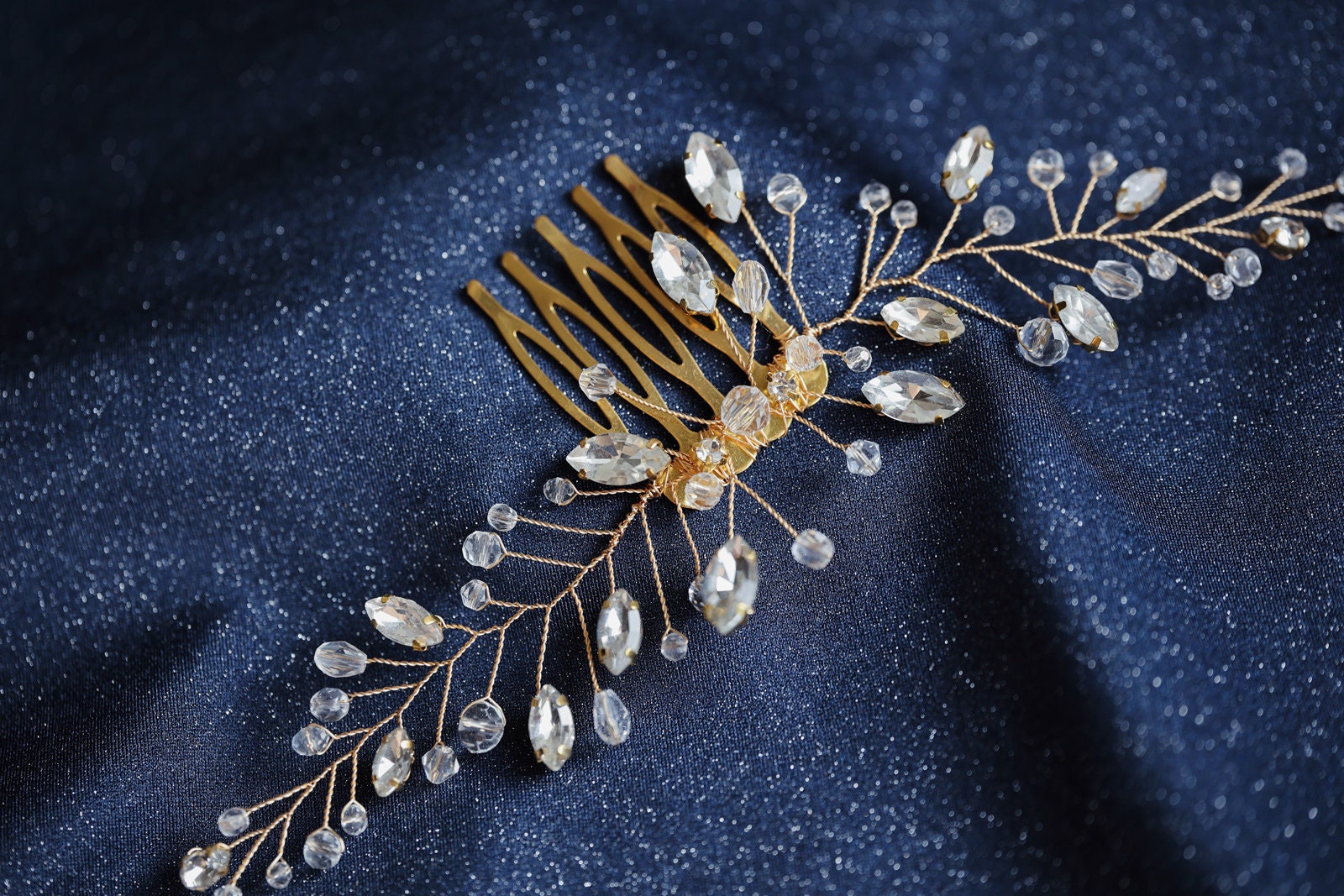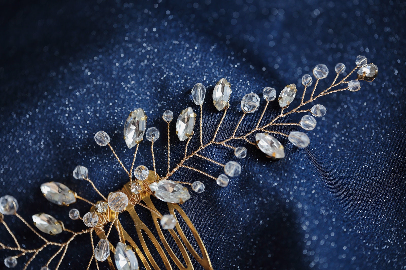 Ein dekorativer Hochzeitskamm voller Magie und funkelnden Kristallen ist die perfekte Ergänzung sowohl für romantische als auch für elegante Stile. Er eignet sich für leicht hochgesteckte Frisuren in einer romantischen Atmosphäre und verleiht klassischen Stilen Frische und einen ätherischen Charakter.
