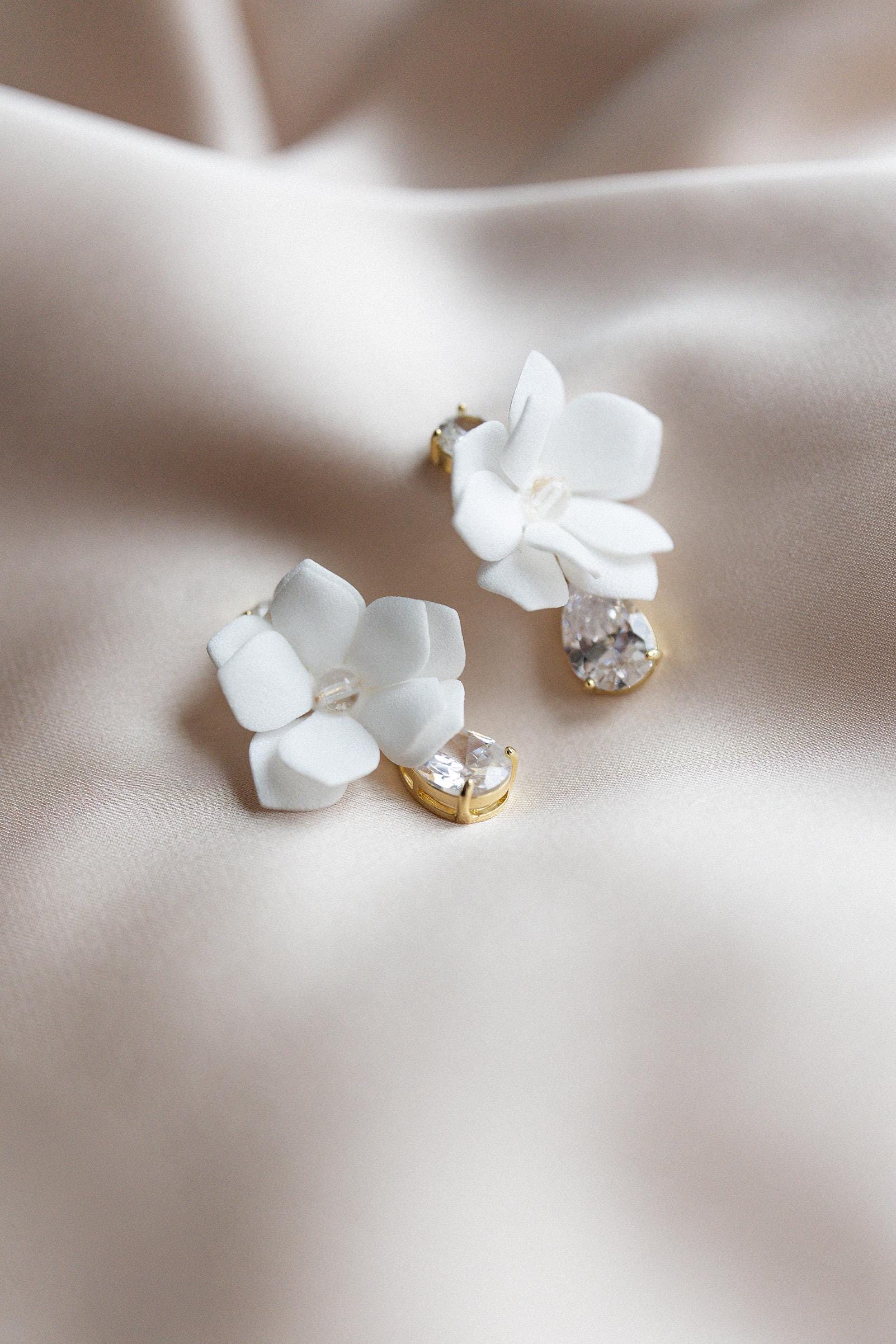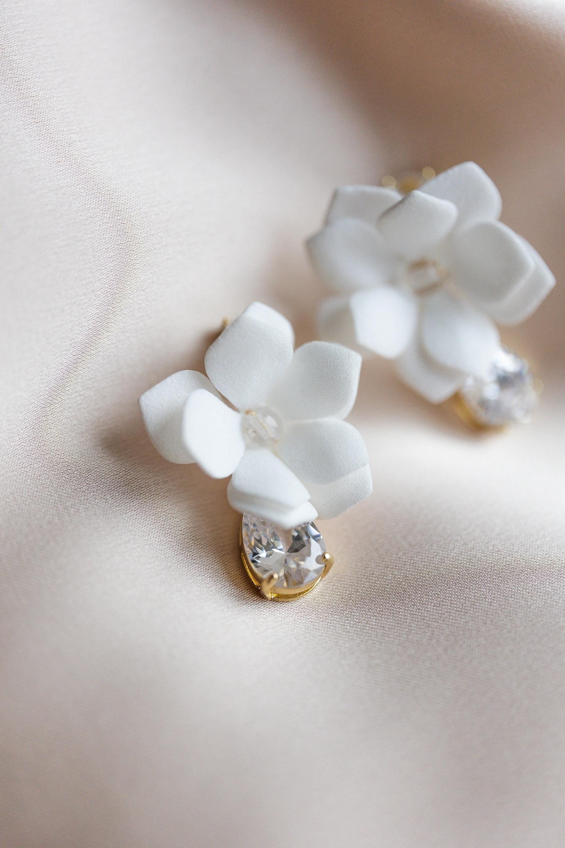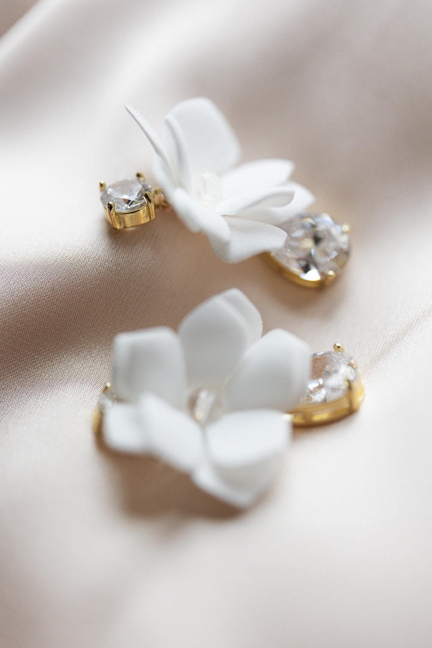 Handgefertigte Ohrringe, die durch ihre Zartheit und ihren Glanz begeistern. Weiße Blüten aus leichtem Schaum verschmelzen mit glänzenden Kristallen und spanischen Zirkonen zu Schmuckstücken voller Klasse. Dies ist die perfekte Wahl für Bräute, die ihrem Hochzeitsstyling zeitlosen Charme und romantische Finesse verleihen möchten.