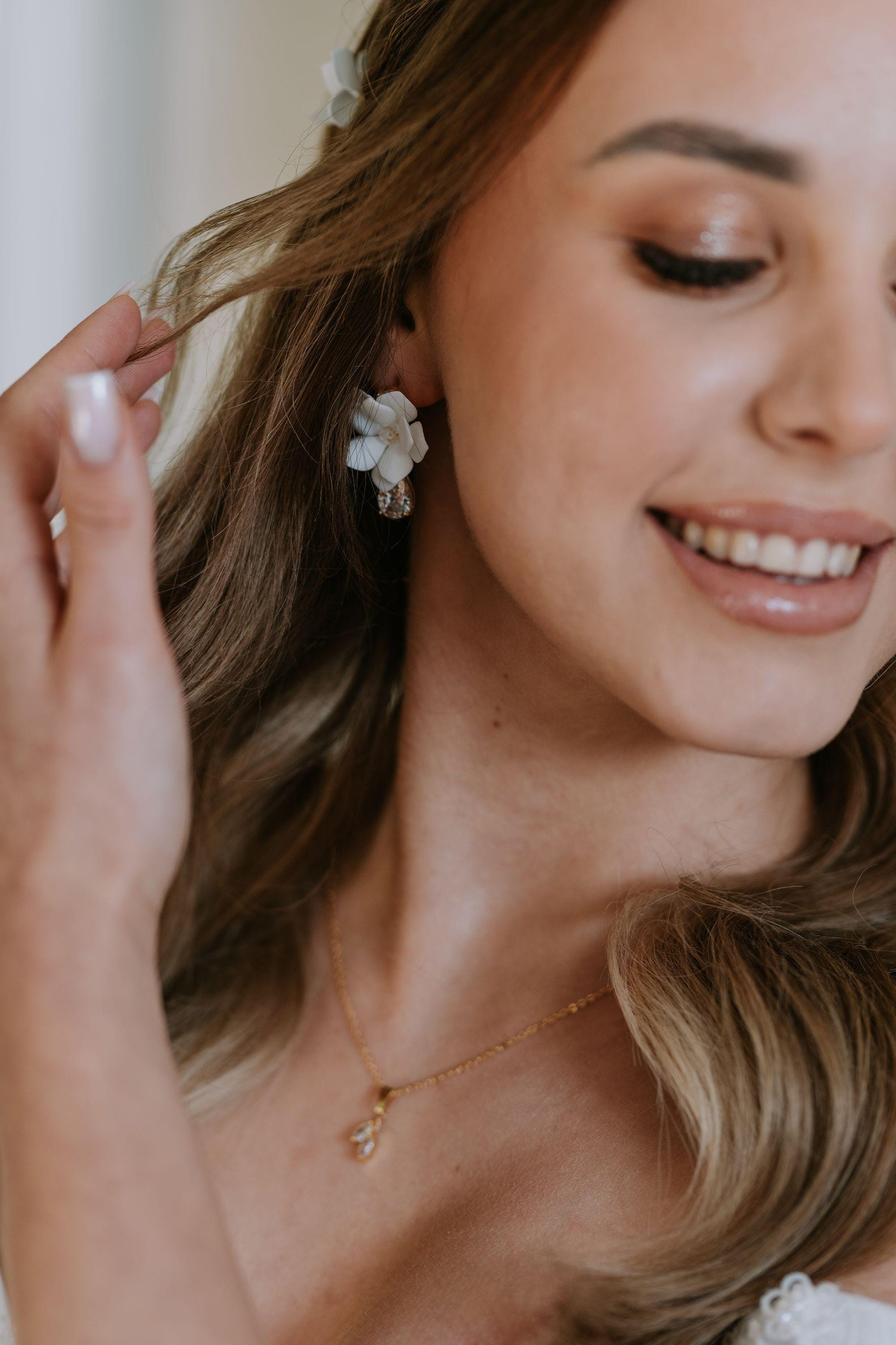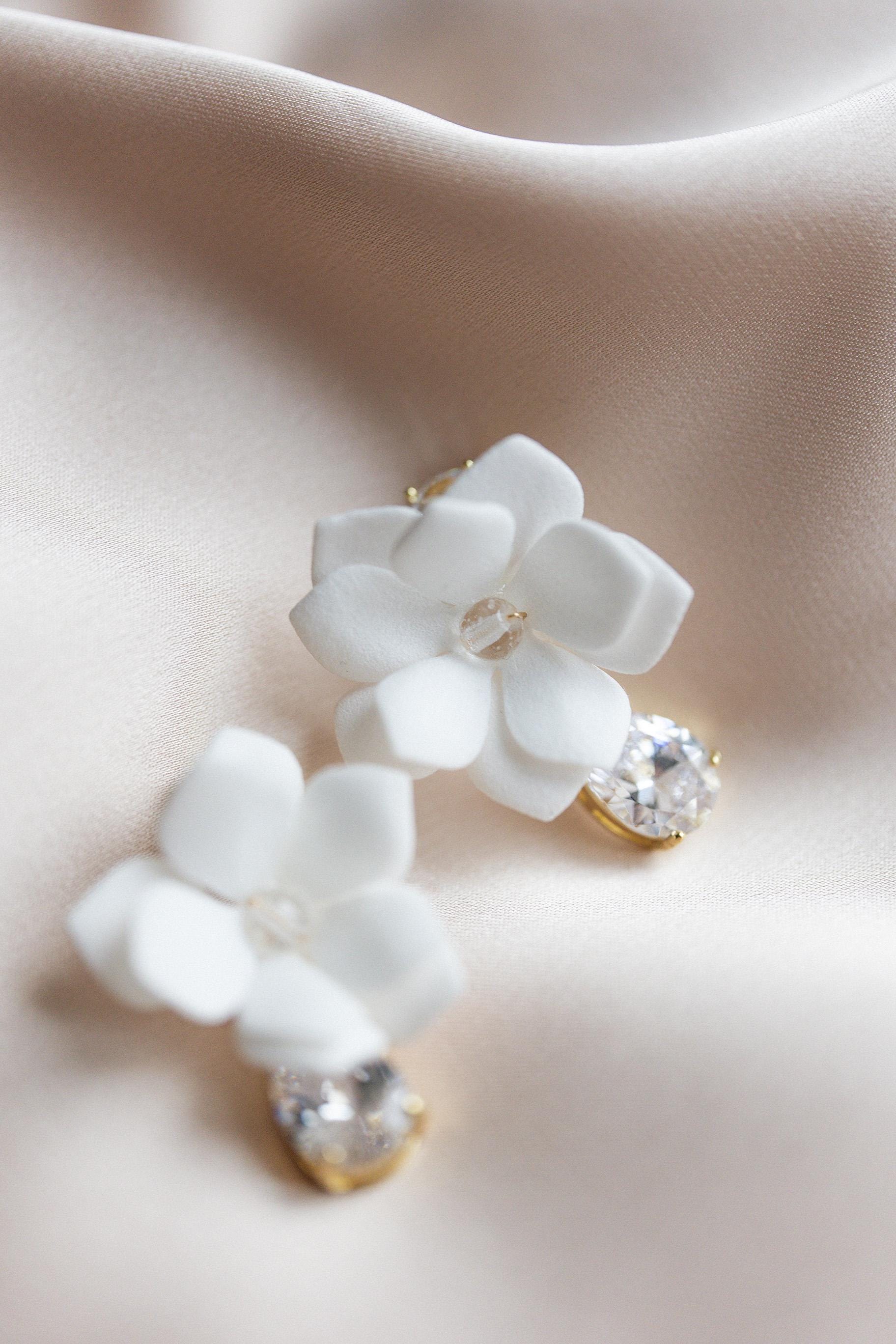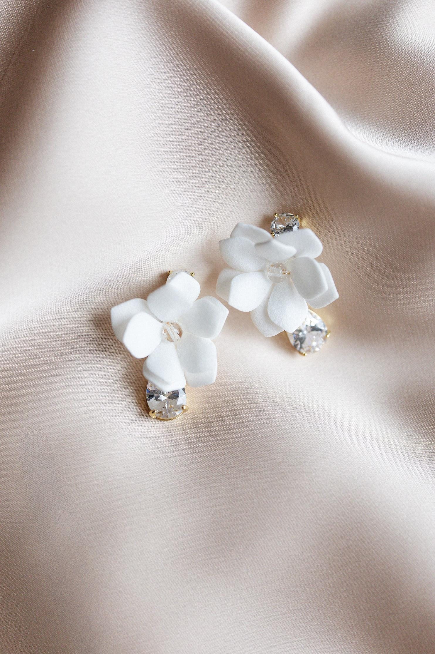 Handgefertigte Ohrringe, die durch ihre Zartheit und ihren Glanz begeistern. Weiße Blüten aus leichtem Schaum verschmelzen mit glänzenden Kristallen und spanischen Zirkonen zu Schmuckstücken voller Klasse. Dies ist die perfekte Wahl für Bräute, die ihrem Hochzeitsstyling zeitlosen Charme und romantische Finesse verleihen möchten.