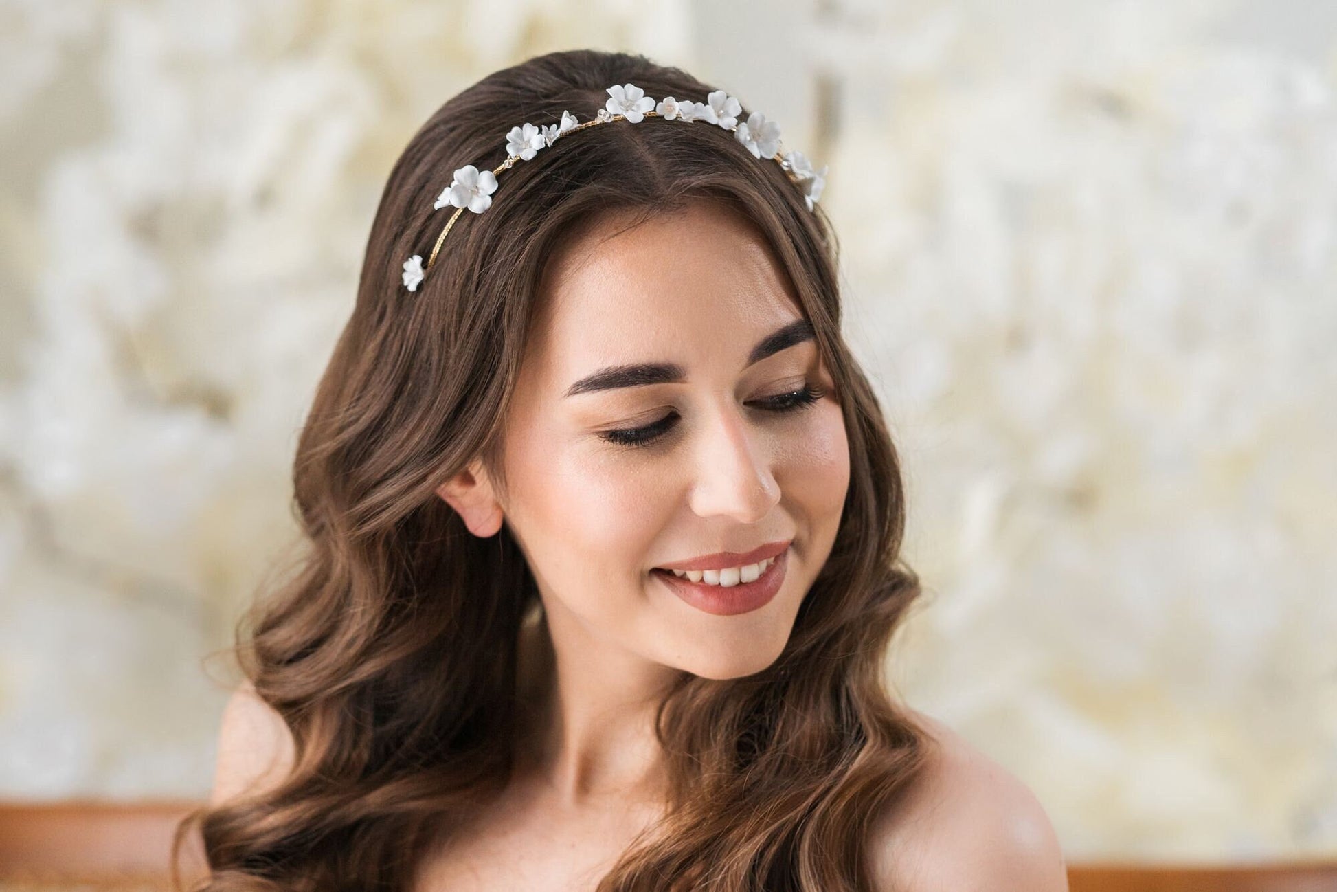 Ein wunderschönes und dezentes Hochzeitsstirnband aus weißen Blumen in verschiedenen Größen und Materialien, inspiriert von der Schönheit und Zartheit der Frauen. Es verleiht verschiedenen Hochzeitsstilen Charakter. Durch die Platzierung der Komposition auf einer festen Unterlage lässt es sich leicht mit offenem oder hochgestecktem Haar kombinieren und verleiht der gesamten Frisur einen schicken Look. Sein einzigartiger Charme verleiht sowohl romantischen als auch klassischen Stilen Charme.