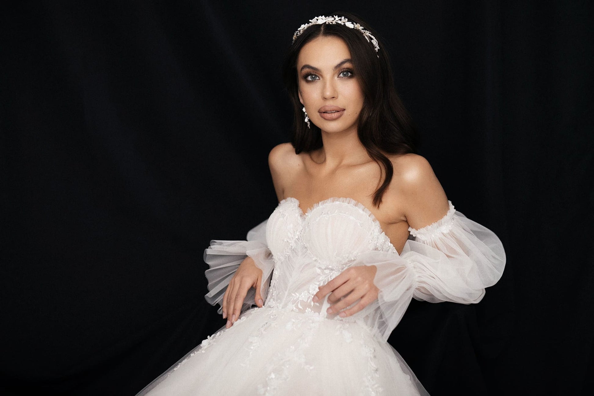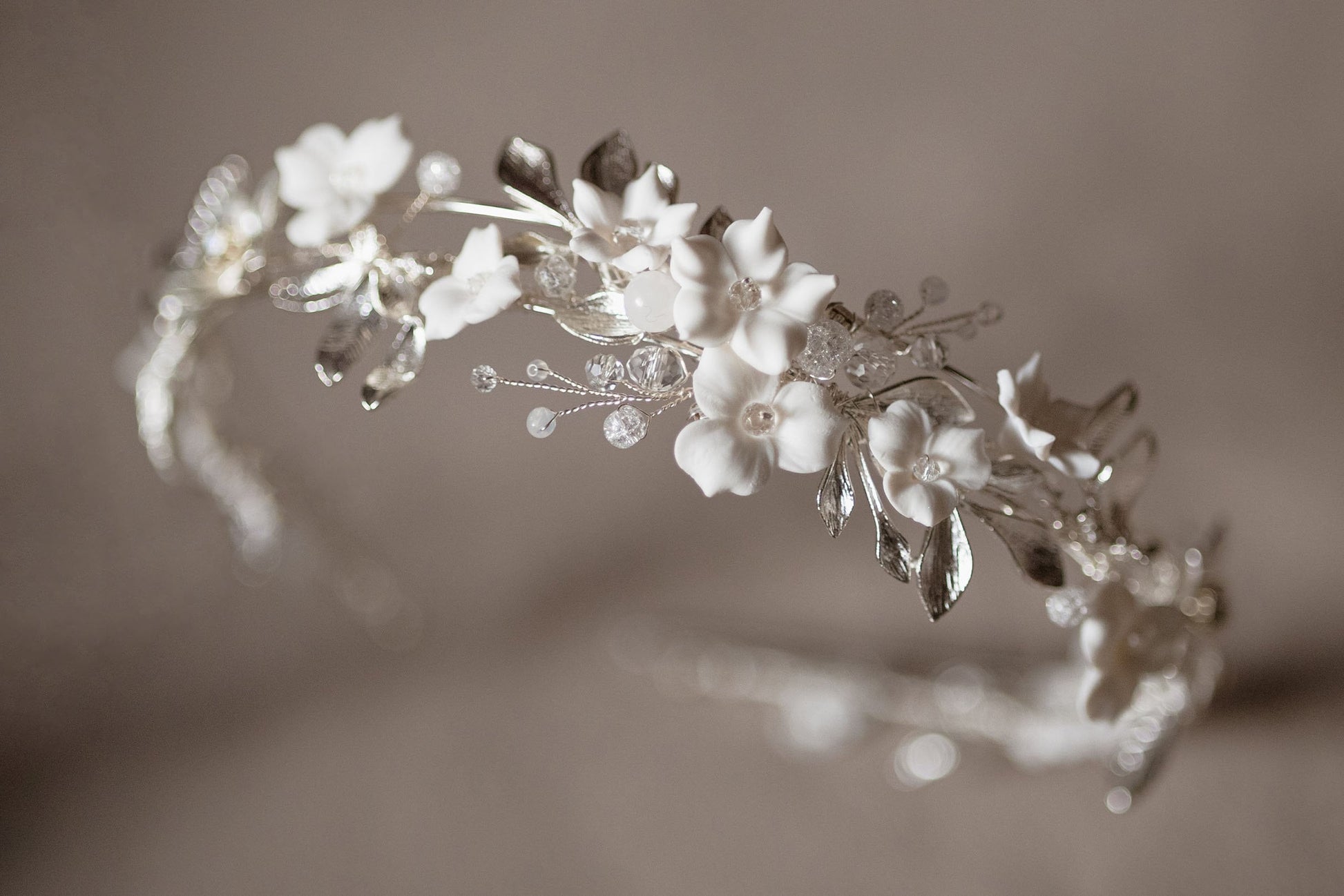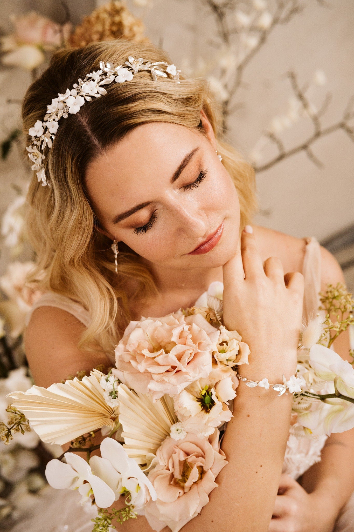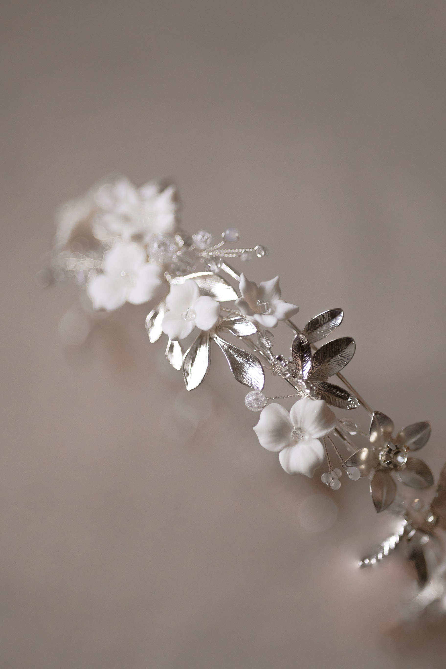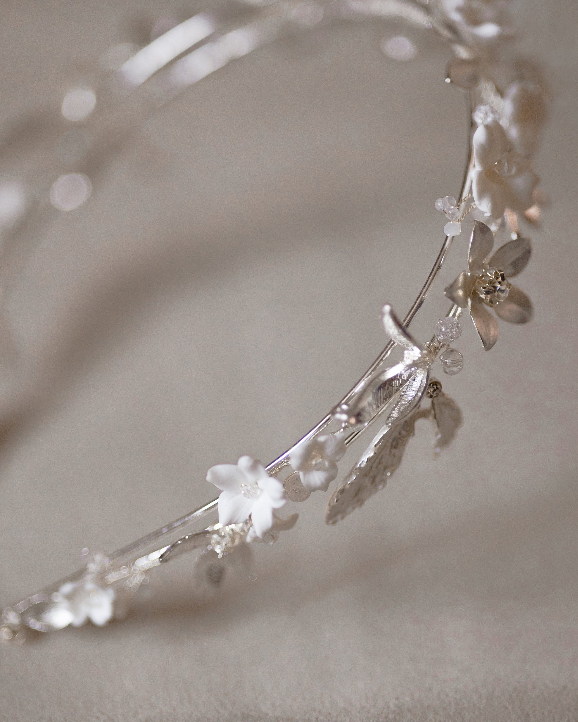 Die Hochzeitstiara, die mit ihrer Brillanz und ihrem Reichtum glänzt, ist eine wunderschöne Darstellung einer Kombination verschiedener Details. Weiße Blumen, Blätter unterschiedlicher Größe und glänzende Kristalle schaffen eine atemberaubende Dekoration, die sowohl den romantischen, Boho- als auch den klassischen Stil auffrischt.