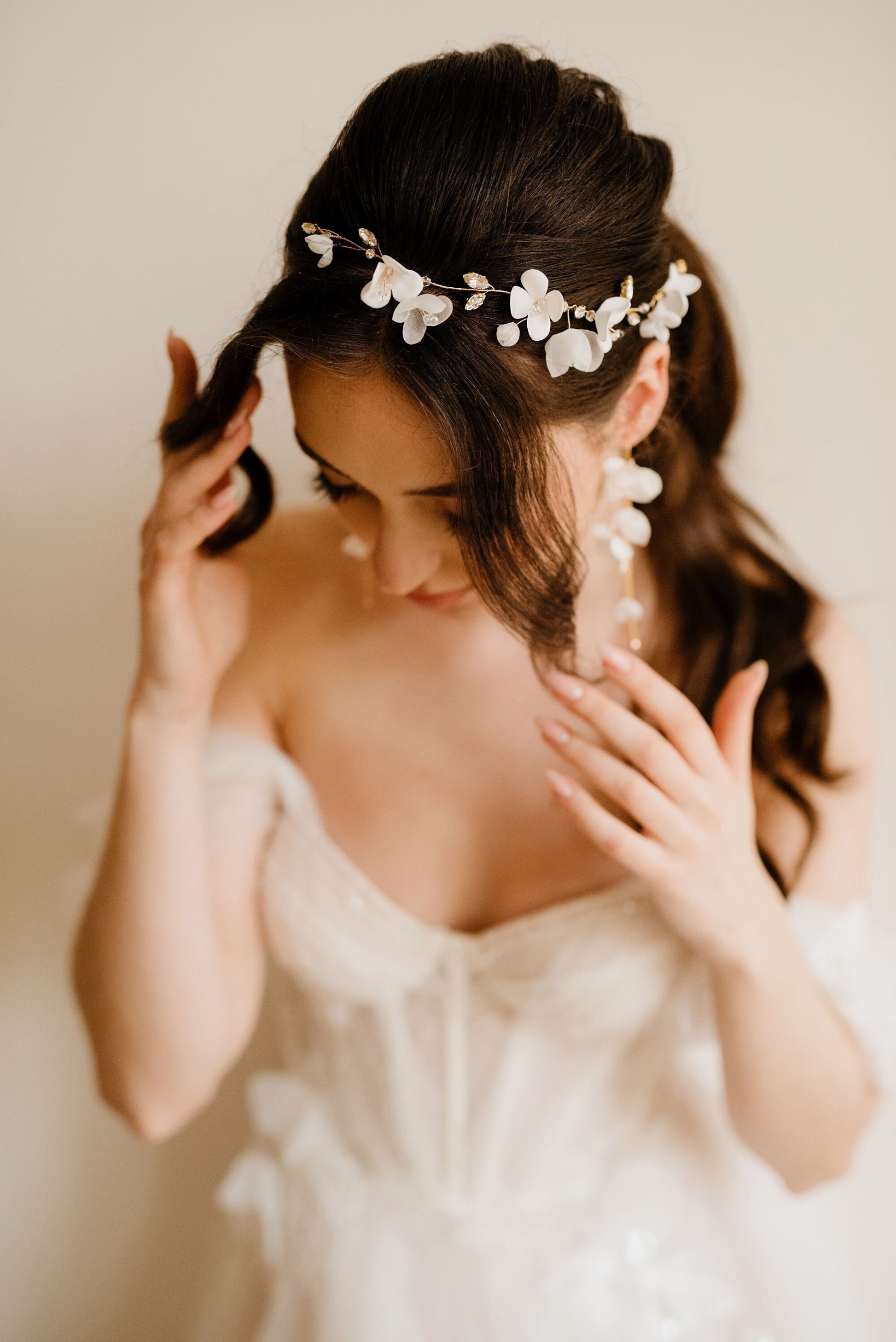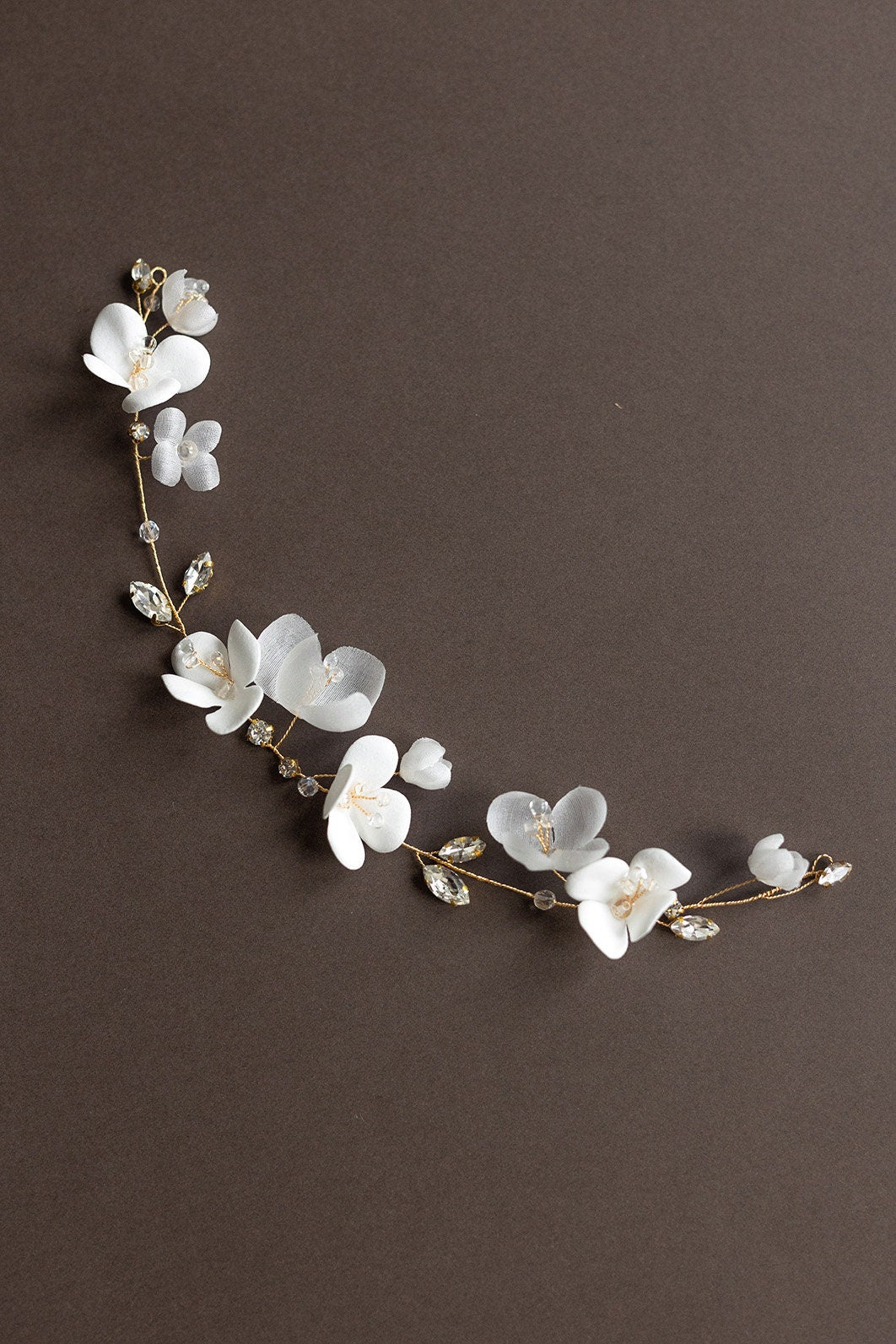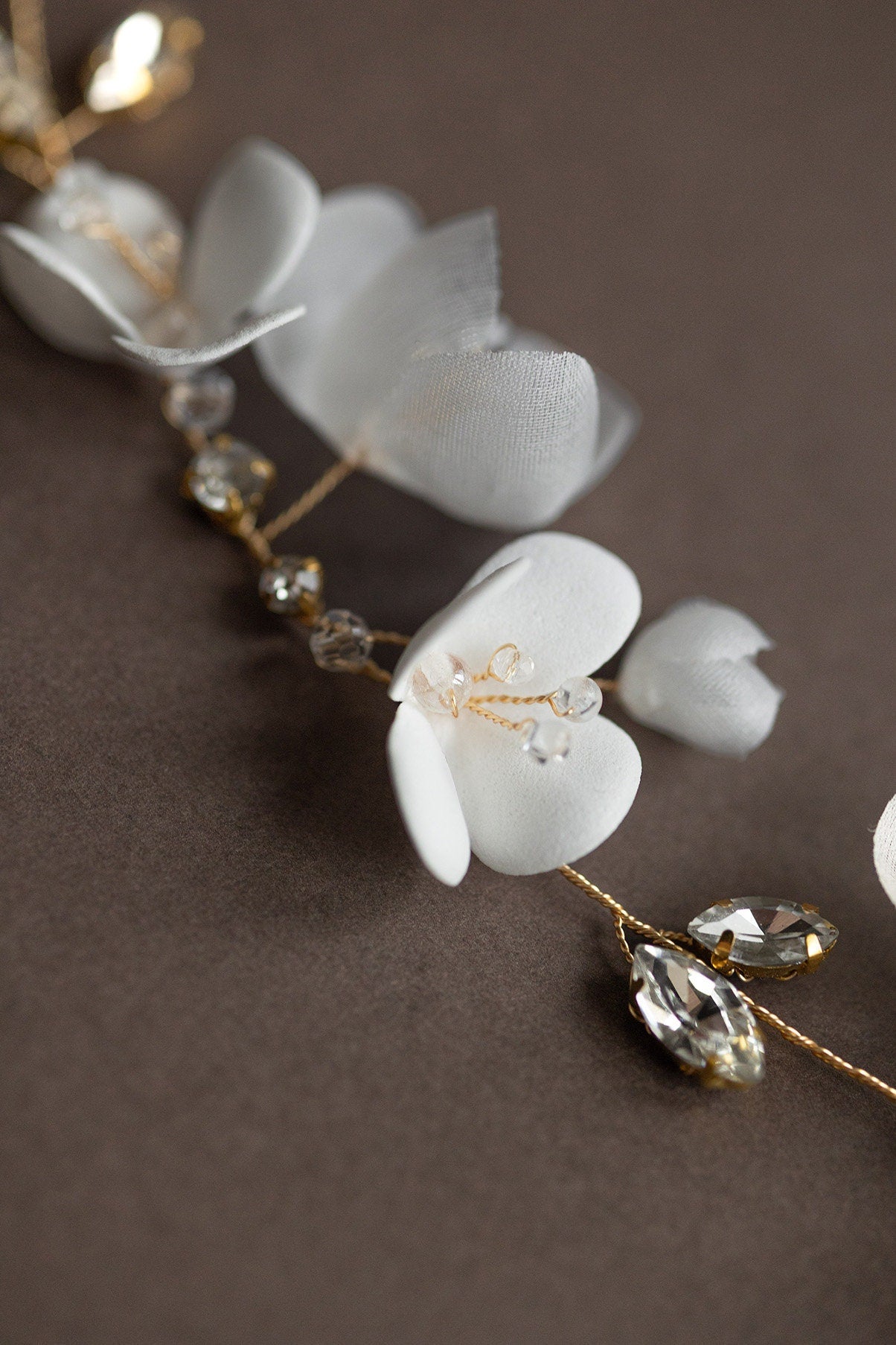 Ein dekorativer Hochzeitszweig, zart und auffällig zugleich. Die Fülle an weißem Samt und ätherischen Seidenblumen wird durch glänzende Kristalle und Zirkone ergänzt und schafft eine gepflegte Komposition, perfekt für die moderne Braut. Der Schmuck kann am Hinterkopf am Schleier befestigt oder als Halbkranz vorne frisiert werden und so das gesamte Styling schmücken.