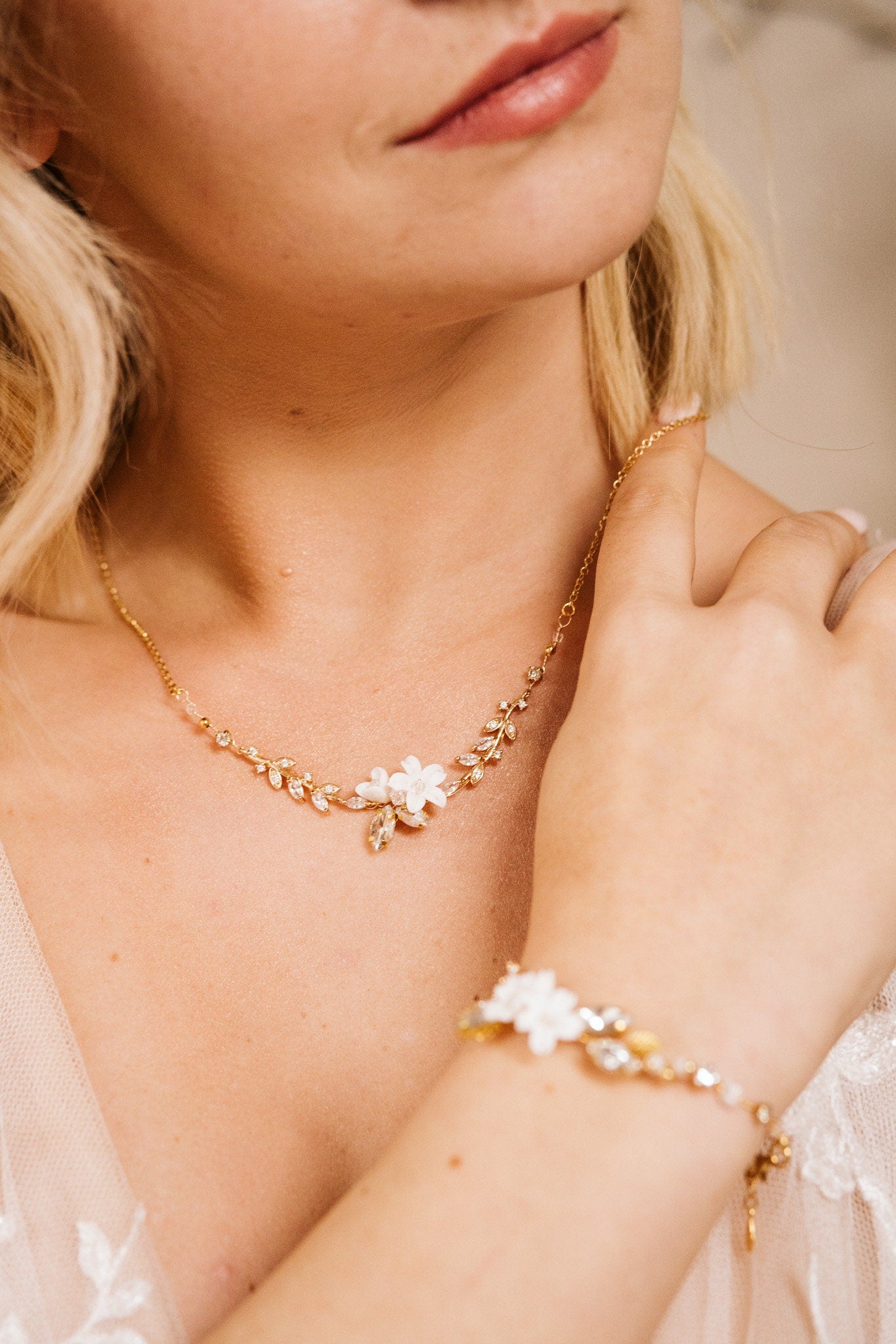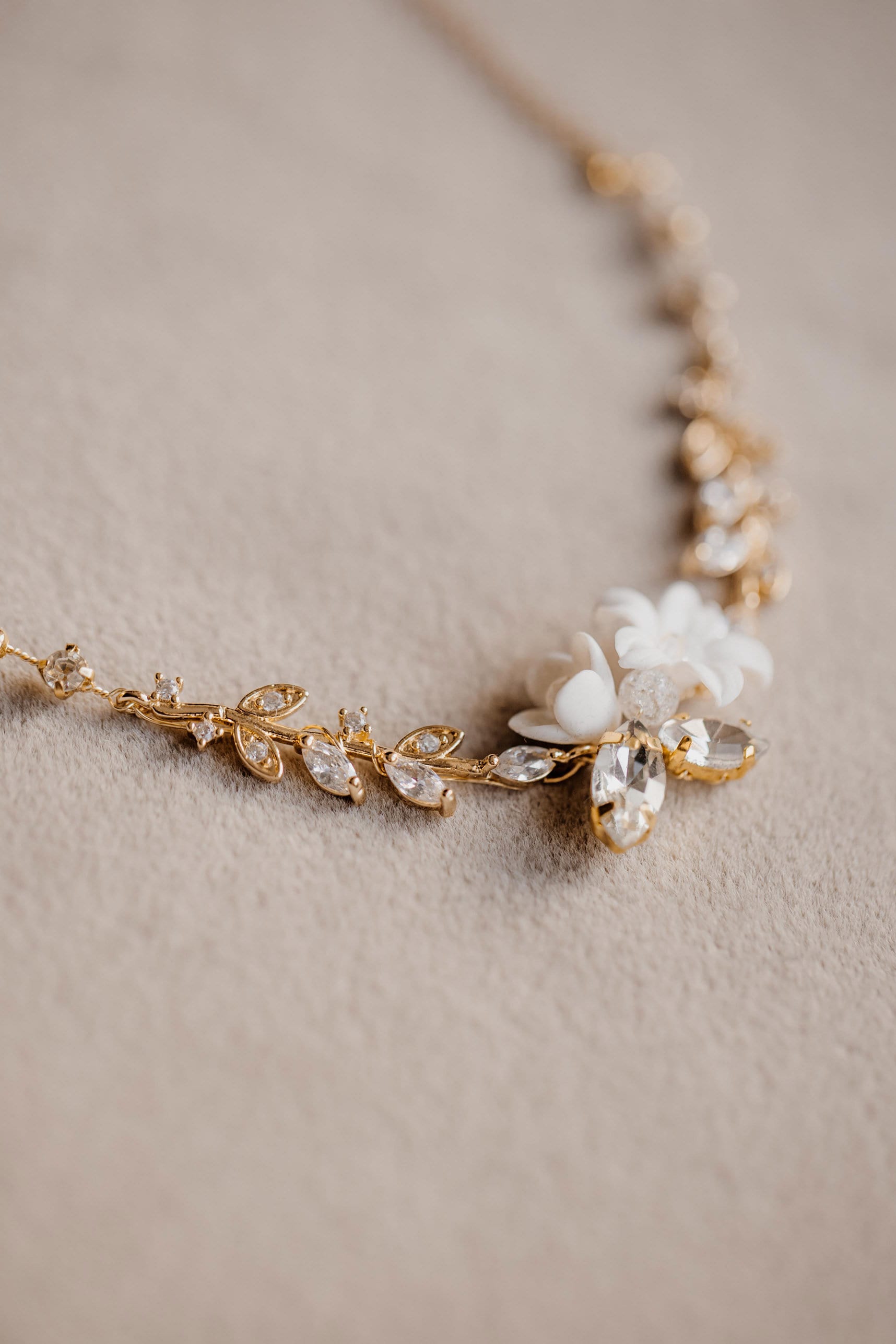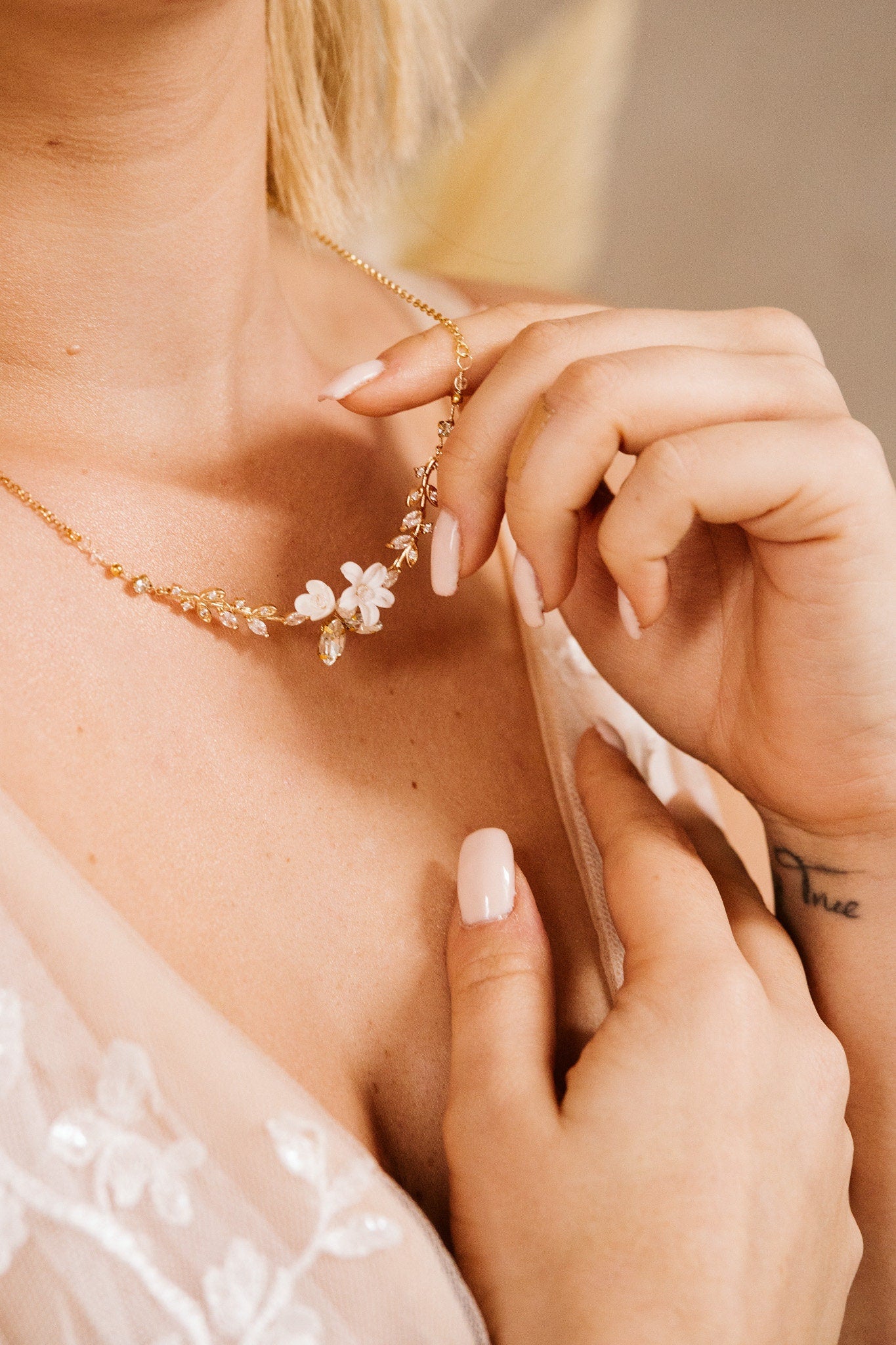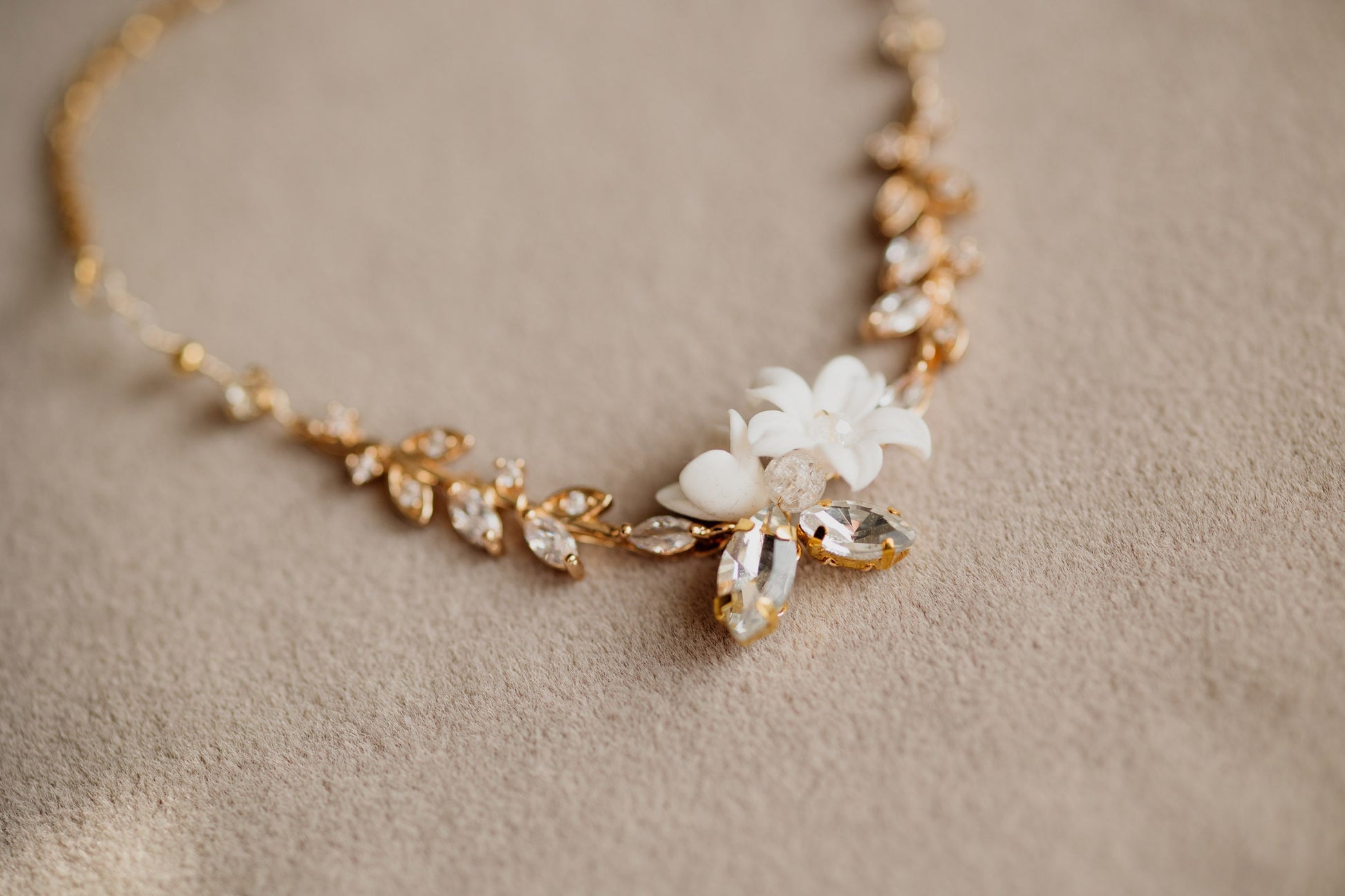 Eine kleine Komposition voller Finesse und strahlendem Glanz aus Zirkonen und weißen Blumen schmückt das Dekolleté der Braut auf originelle Weise und macht das gesamte Hochzeits-Styling komplett und einzigartig.