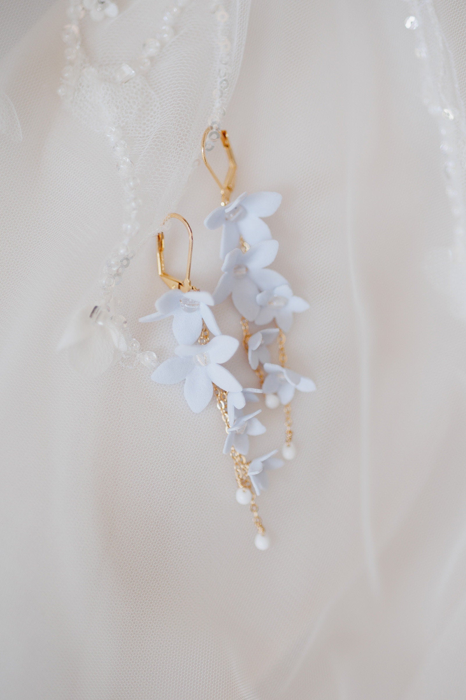 Wunderschöne, feminine und sinnliche Hochzeitsohrringe, inspiriert von der Natur. Die in einer Kaskade an zarten Ketten aufgehängten Blumen bewegen sich sanft und erzeugen einen romantischen Look, der die Schönheit des Brautkleides oder der Frisur nicht überwältigt.