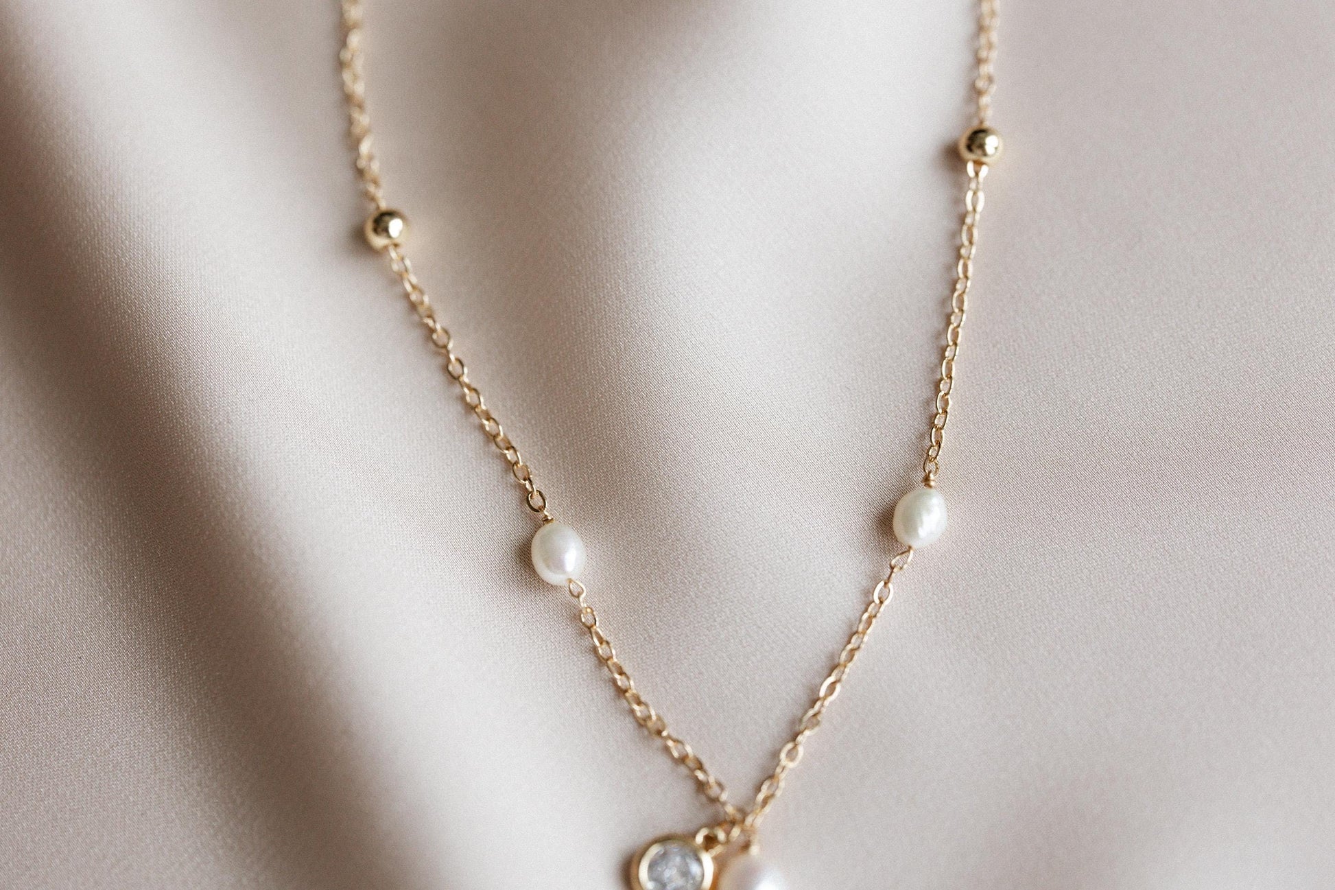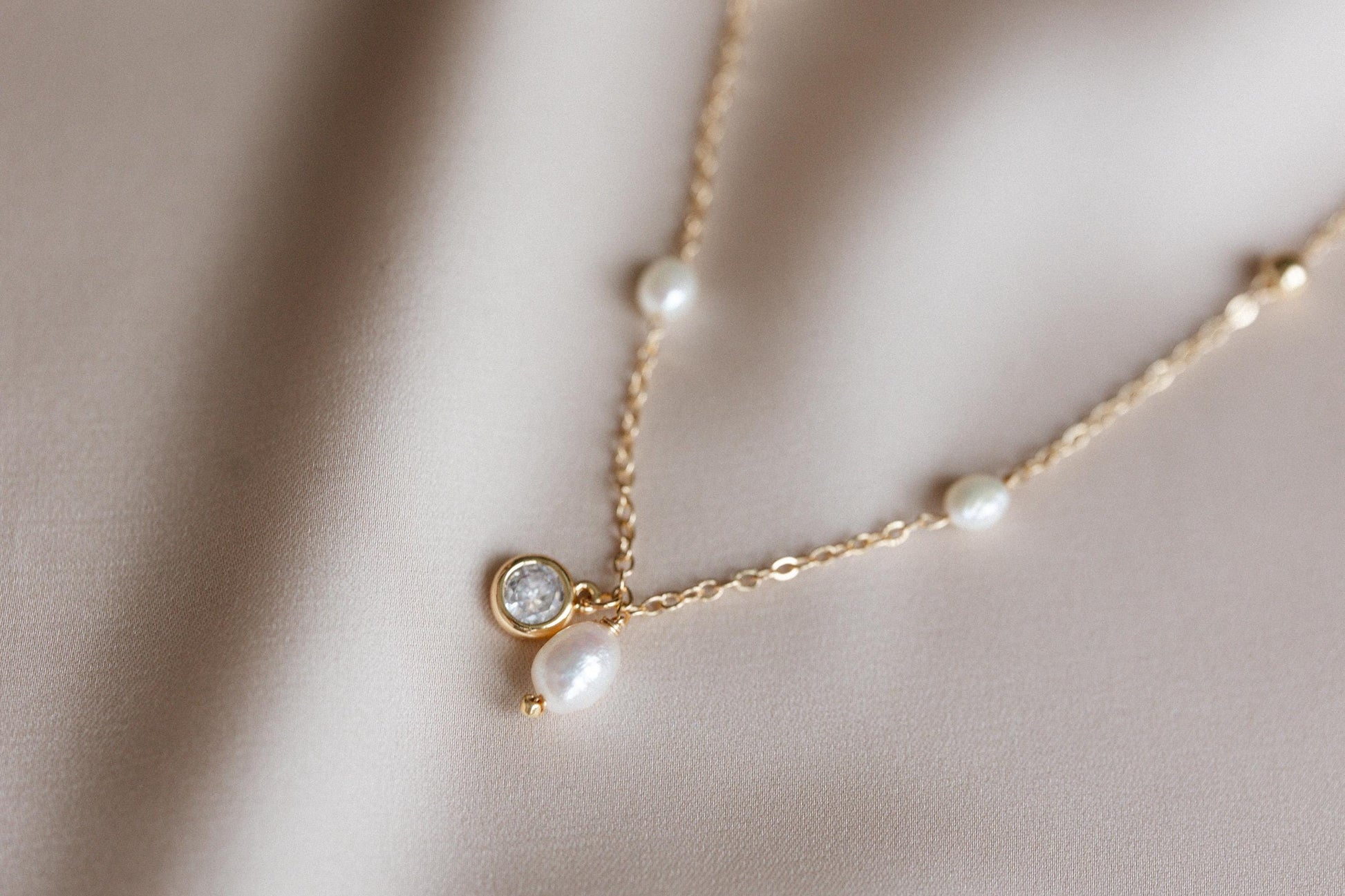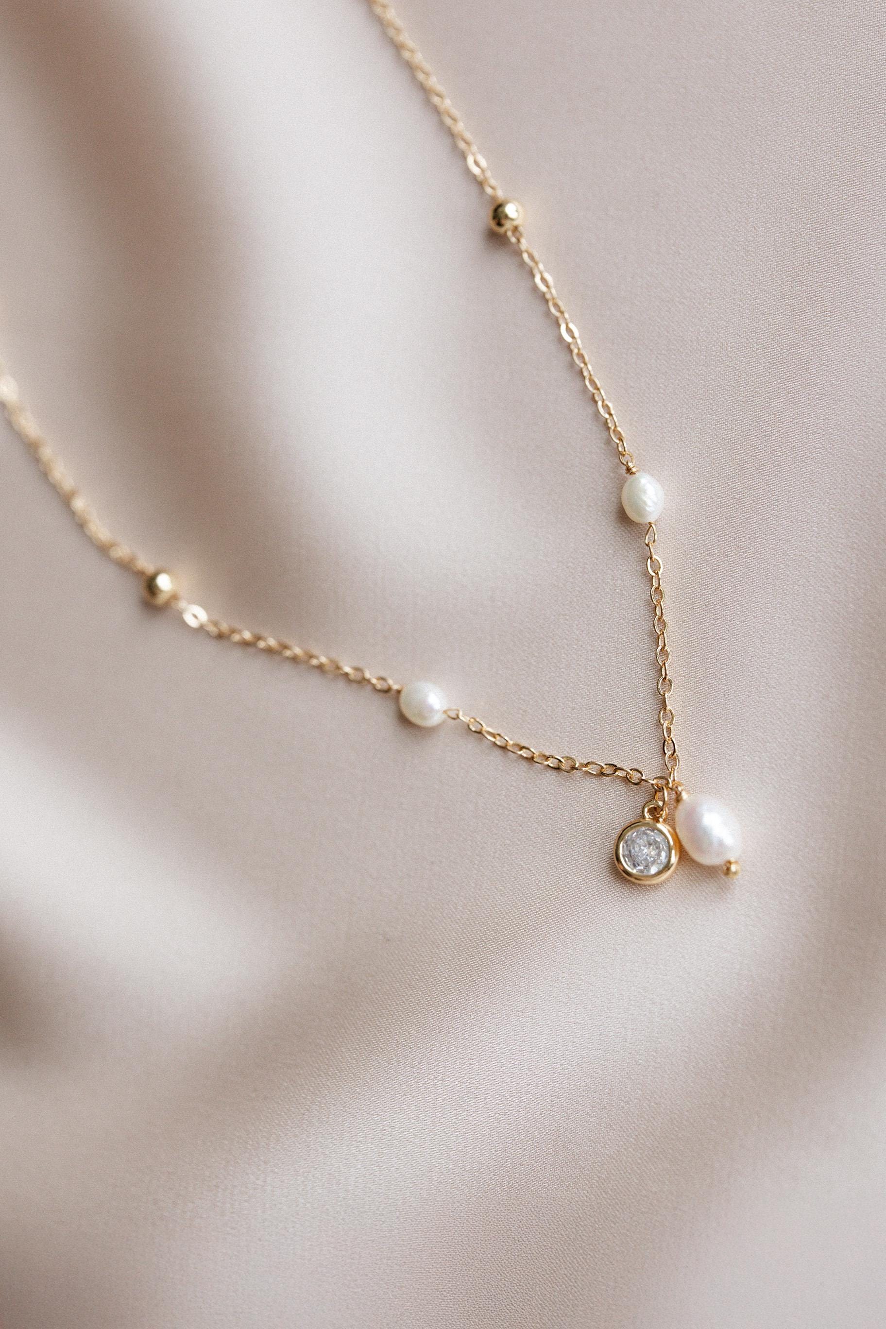 Entdecken Sie eine einzigartige Hochzeitskette mit Perlen, die Ihrem Stil einen einzigartigen Charme verleiht. Die zarte Goldkette ist mit Naturperlen verziert und schafft eine zeitlose Komposition. Leicht und elegant – perfekt für die Braut, die phänomenal, aber nicht übertrieben aussehen möchte.