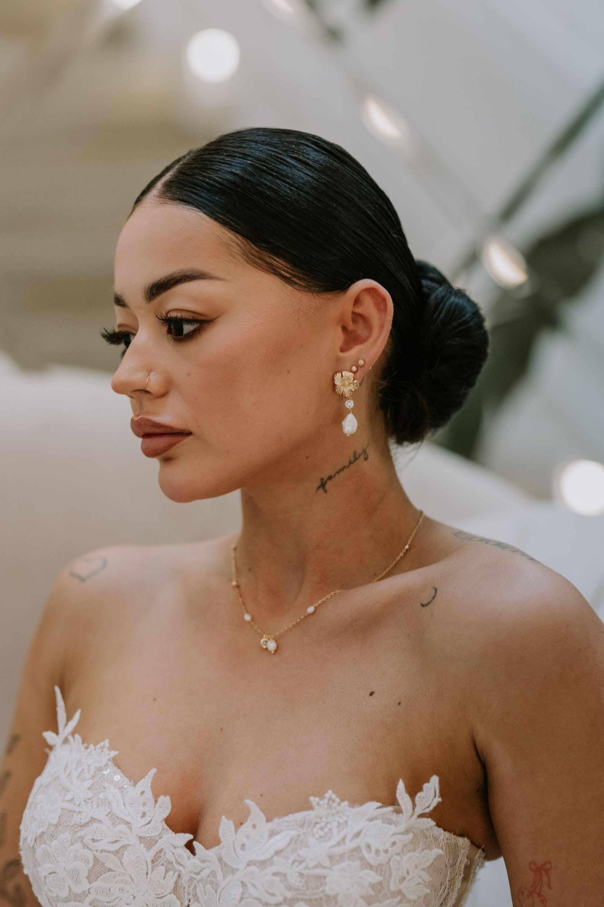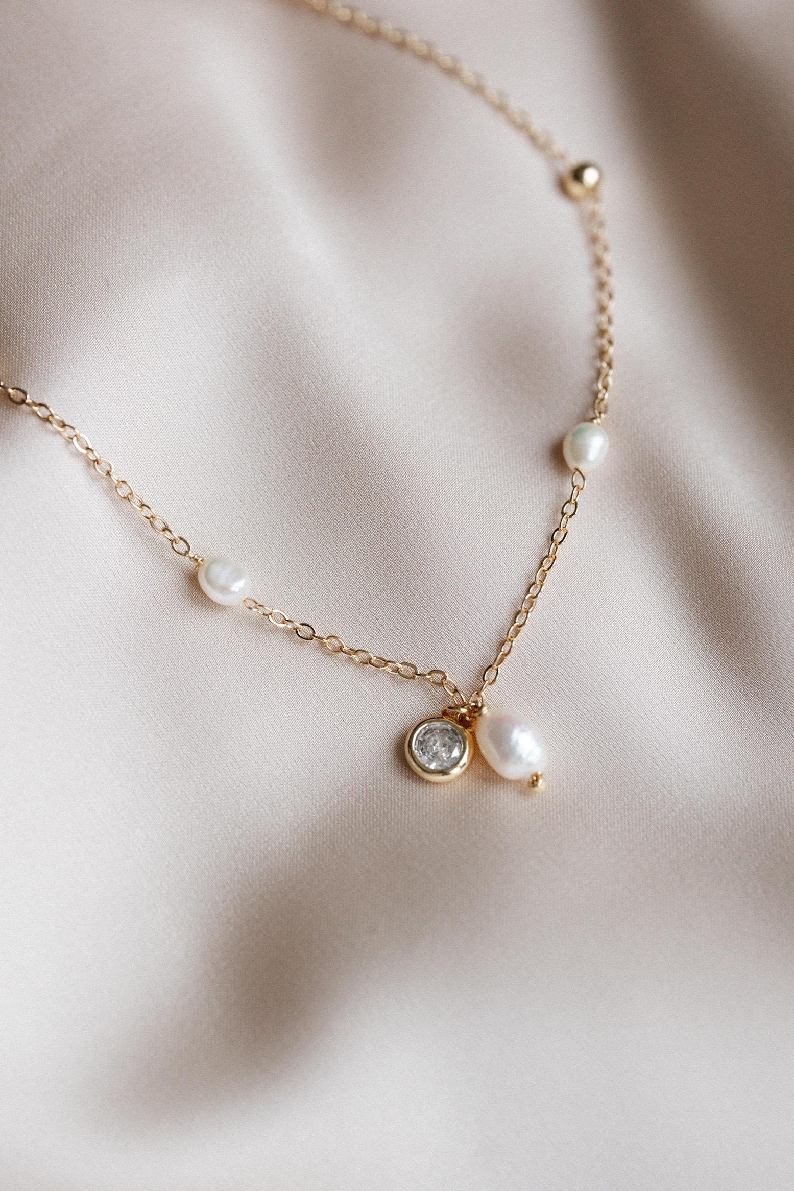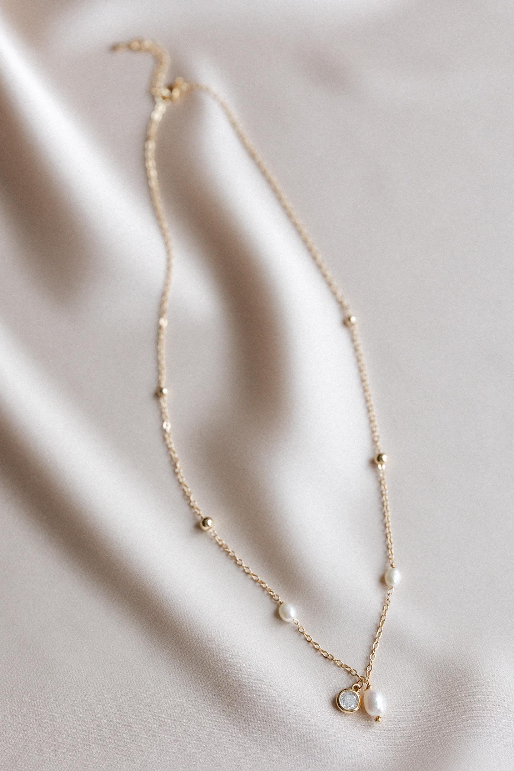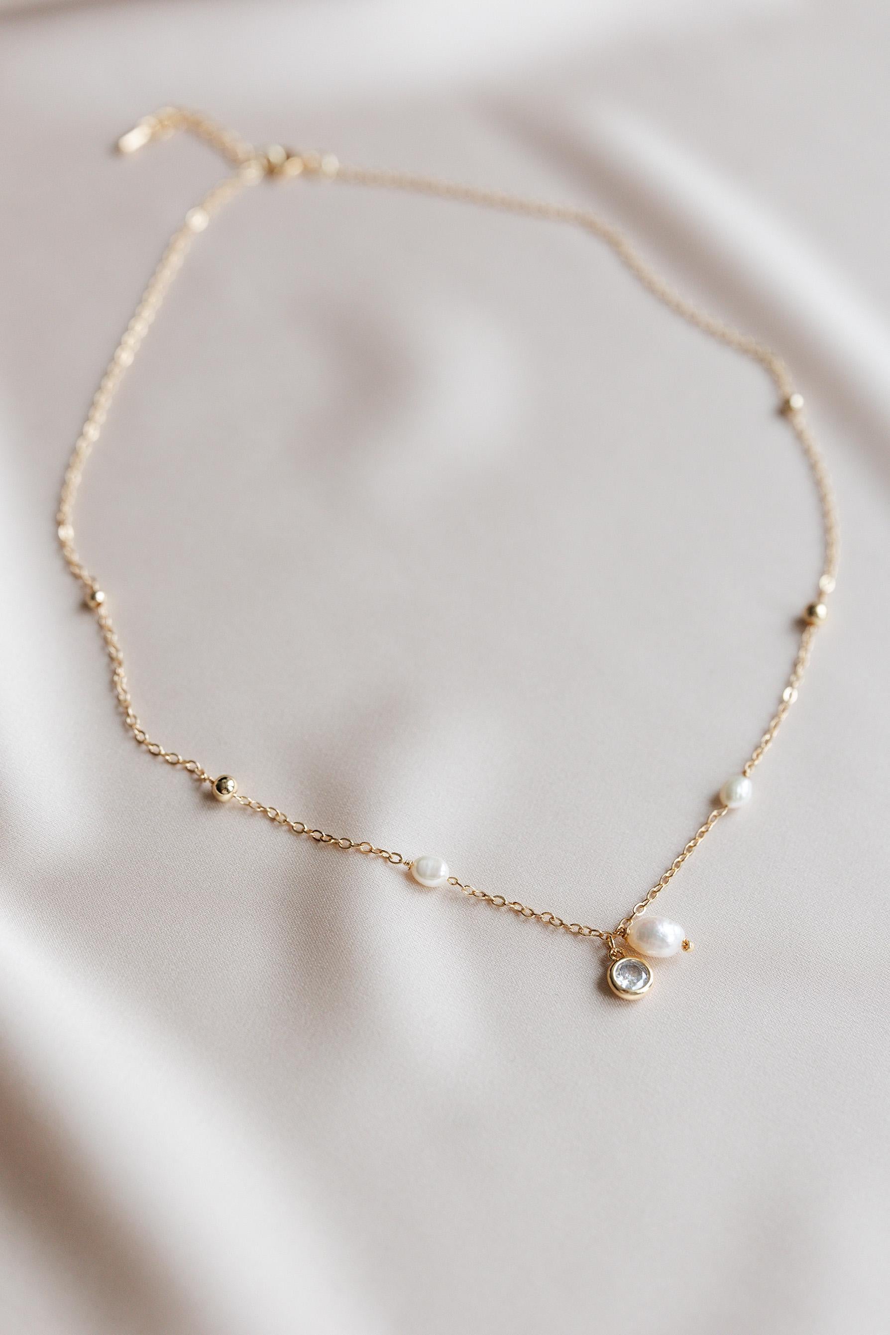 Entdecken Sie eine einzigartige Hochzeitskette mit Perlen, die Ihrem Stil einen einzigartigen Charme verleiht. Die zarte Goldkette ist mit Naturperlen verziert und schafft eine zeitlose Komposition. Leicht und elegant – perfekt für die Braut, die phänomenal, aber nicht übertrieben aussehen möchte.