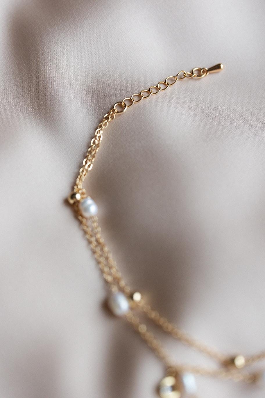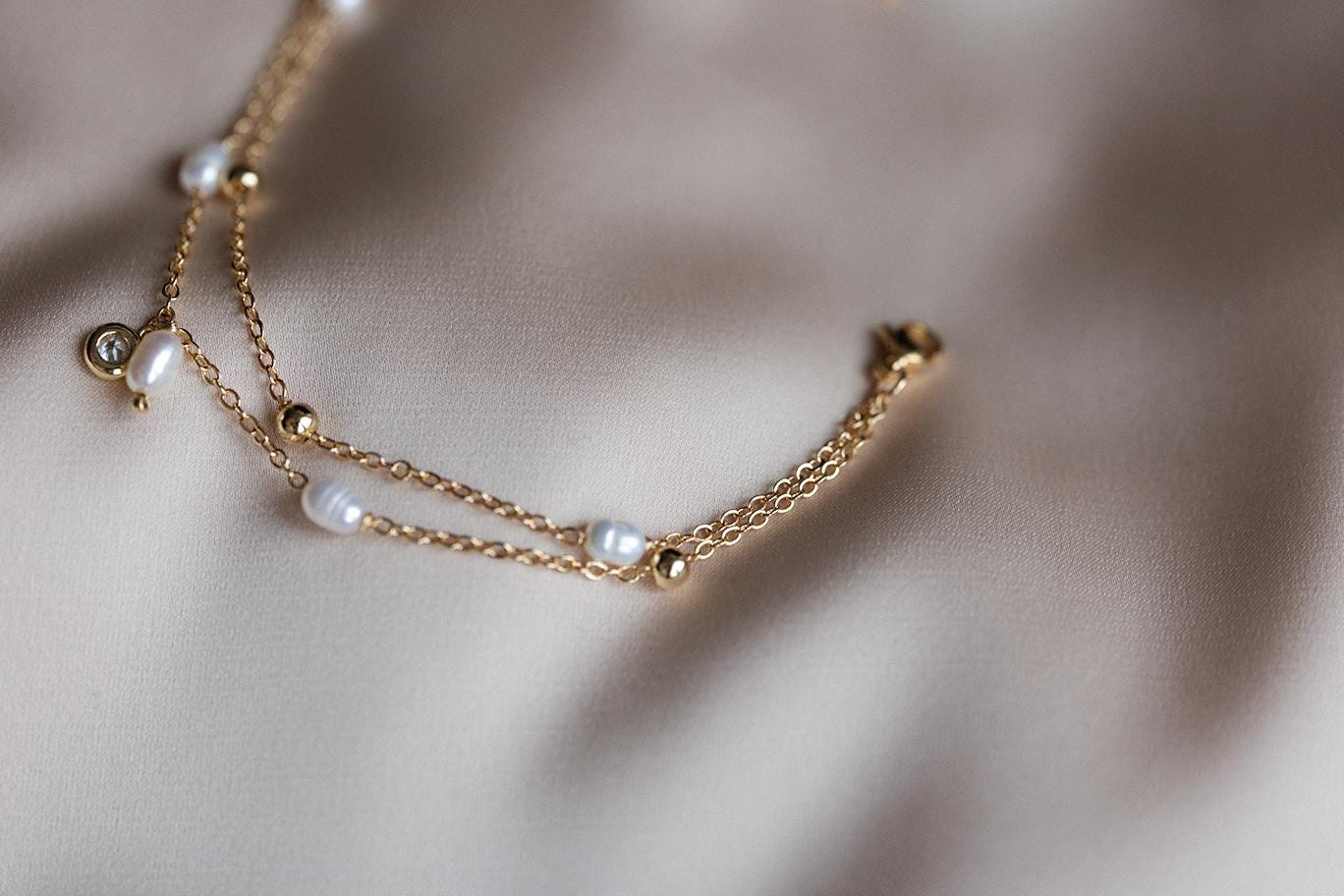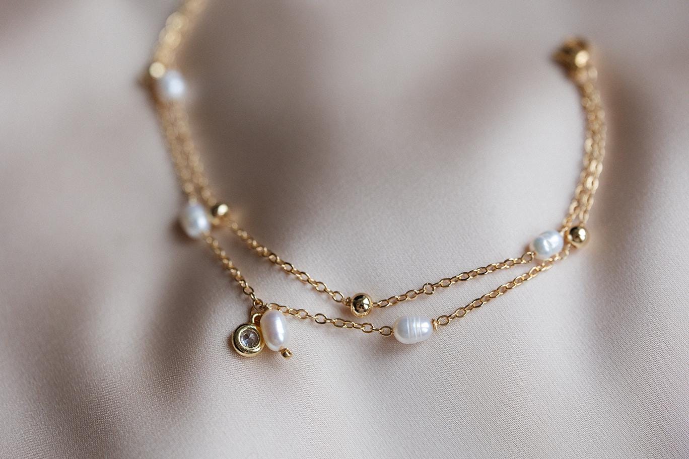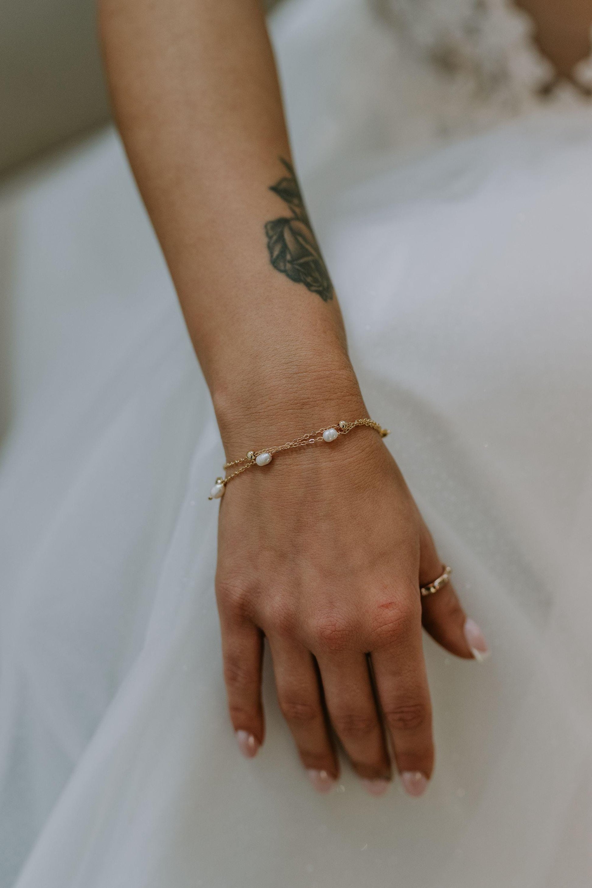 Ein dezentes und feminines Hochzeitsarmband mit Perlen ist die perfekte Ergänzung zum Styling der Braut. Handgefertigt aus kleinen Süßwasserperlen und goldenen Details passt es wunderbar zu klassischen und romantischen Kleidern. Seine leichte Form sorgt für hohen Tragekomfort. Es passt perfekt zu anderem Hochzeitsschmuck in Gold- oder Silbertönen.