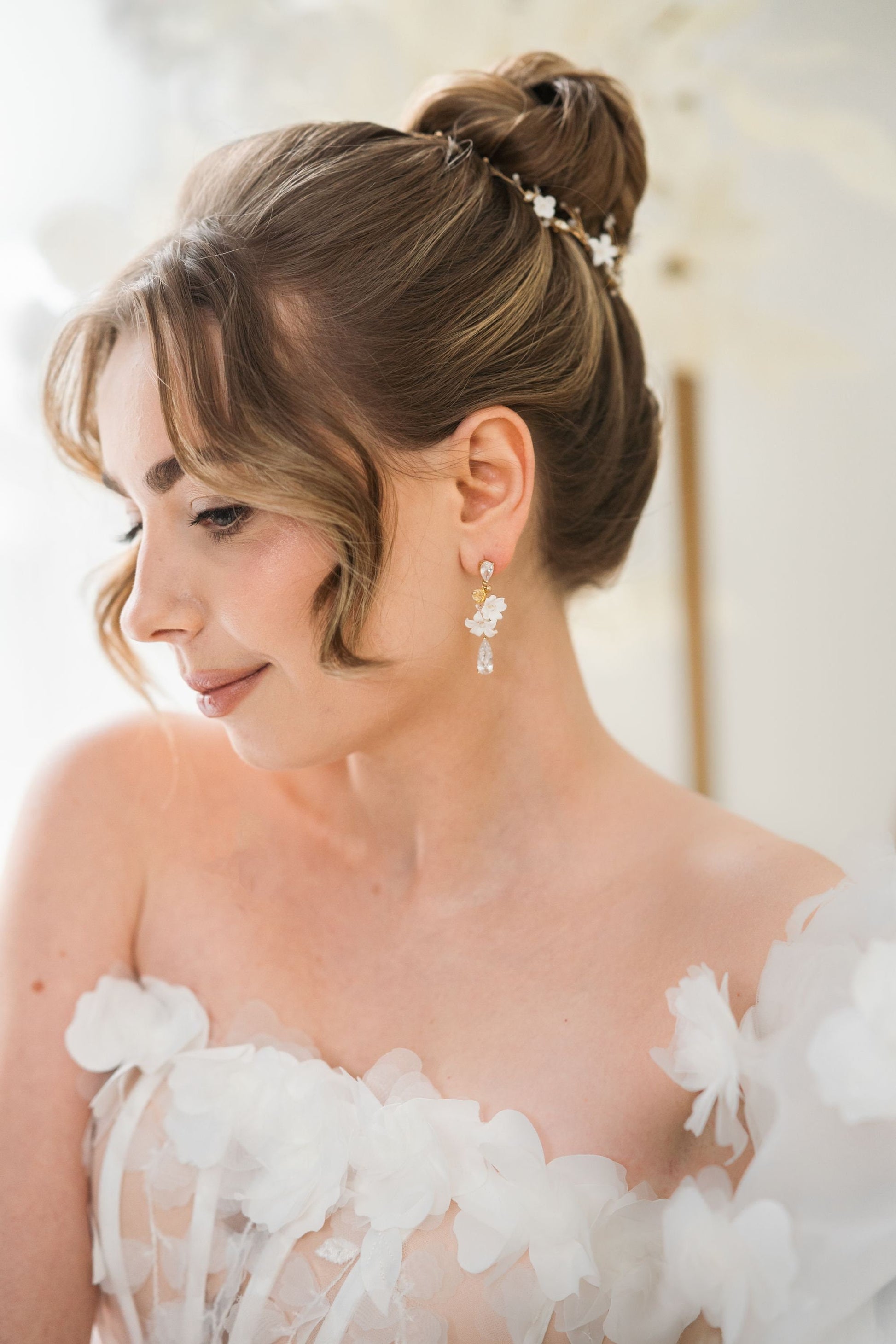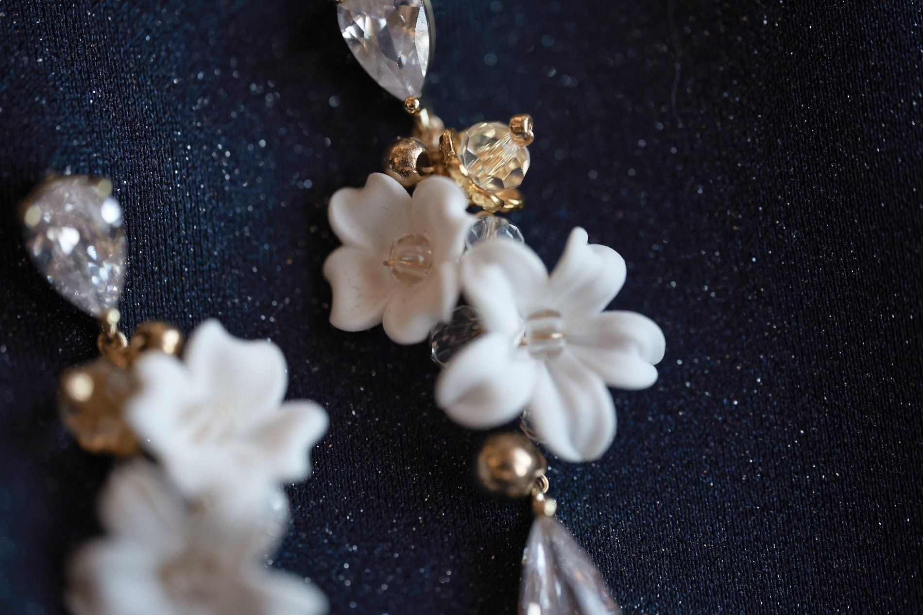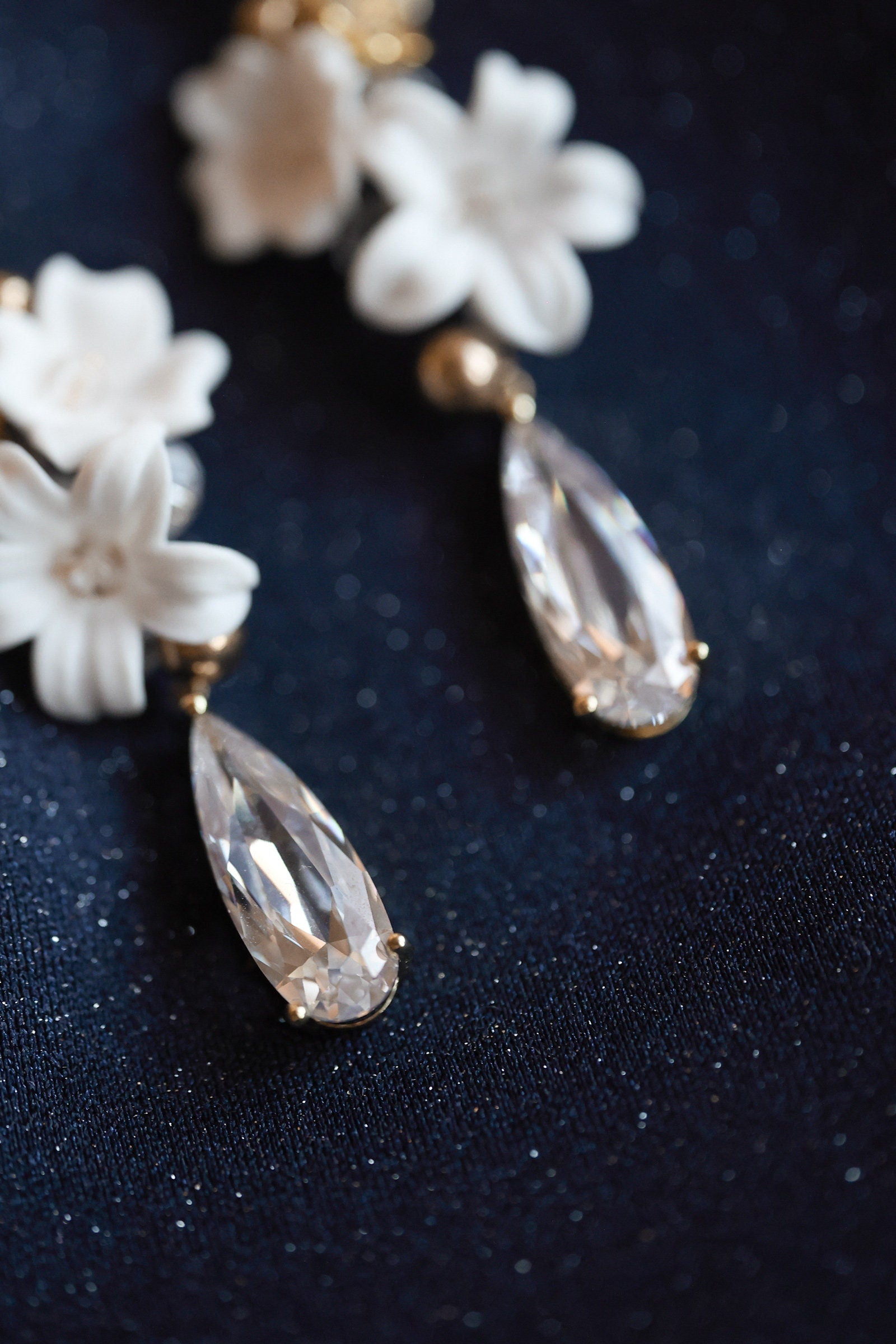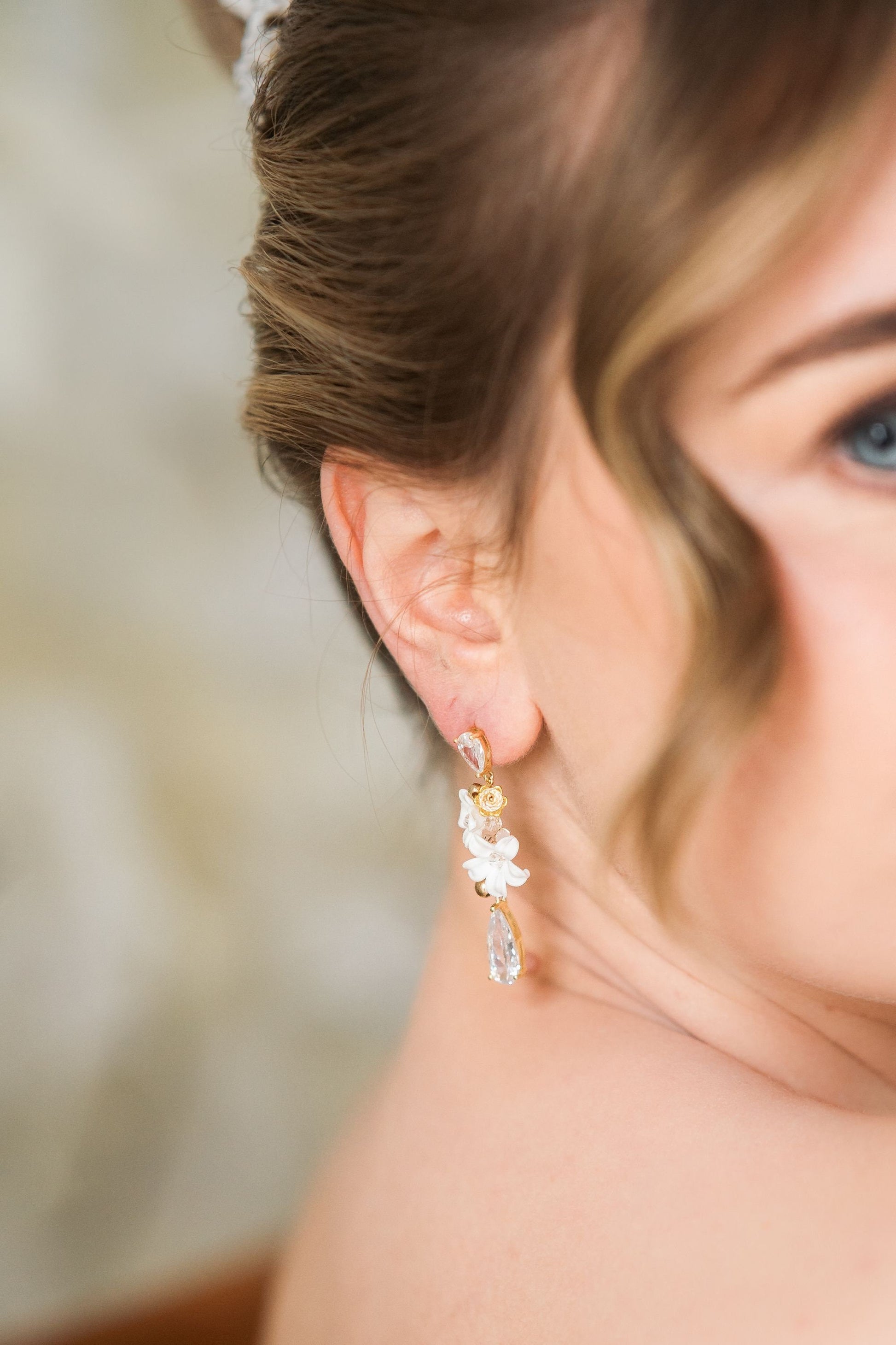 Schöne Blumen kombiniert mit funkelnden Kristallen ergeben subtile und elegante Ohrringe. Ihr Charme und Charme betonen sowohl romantische als auch klassische Stile. Und sie verleihen Bräuten einzigartigen Chic.