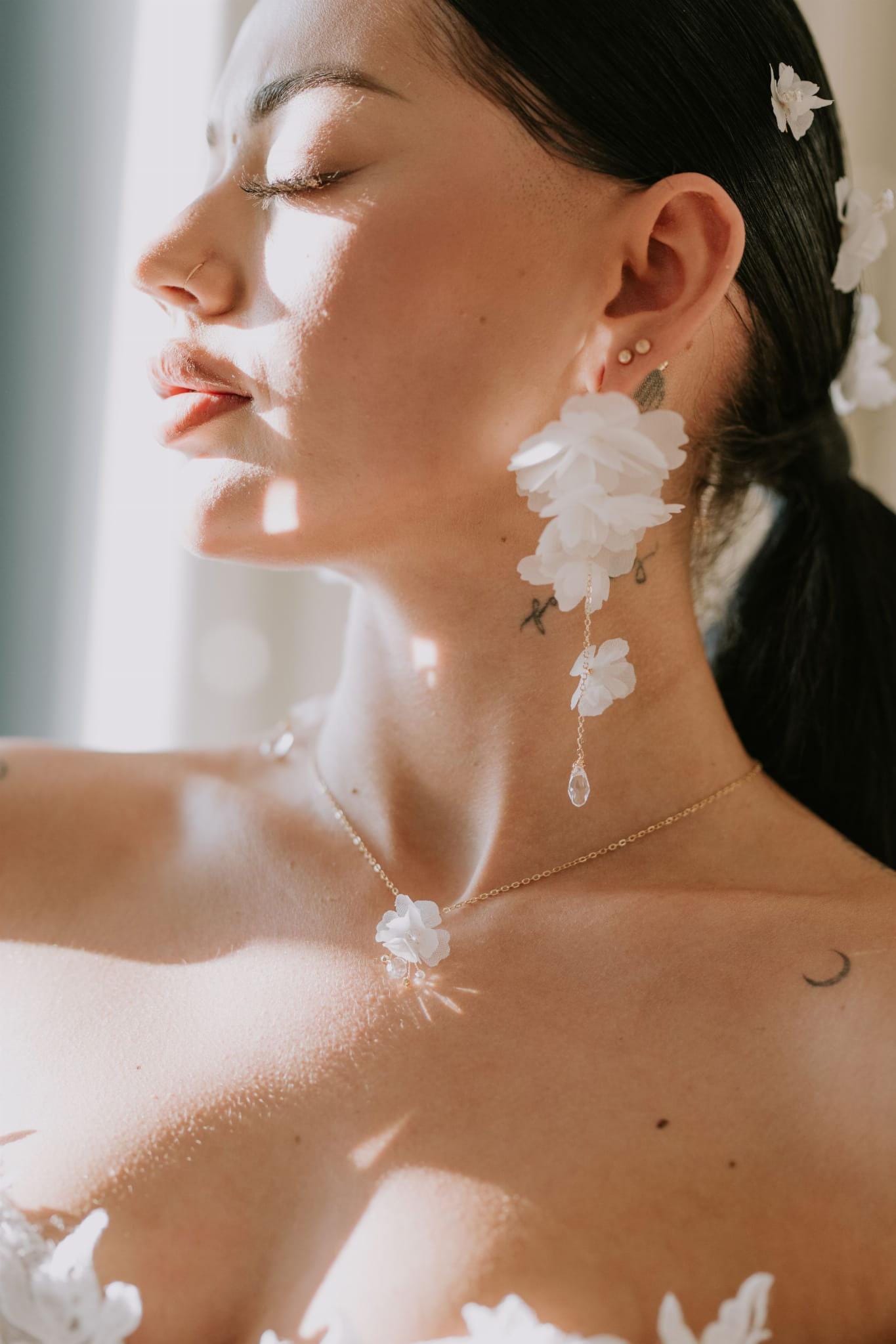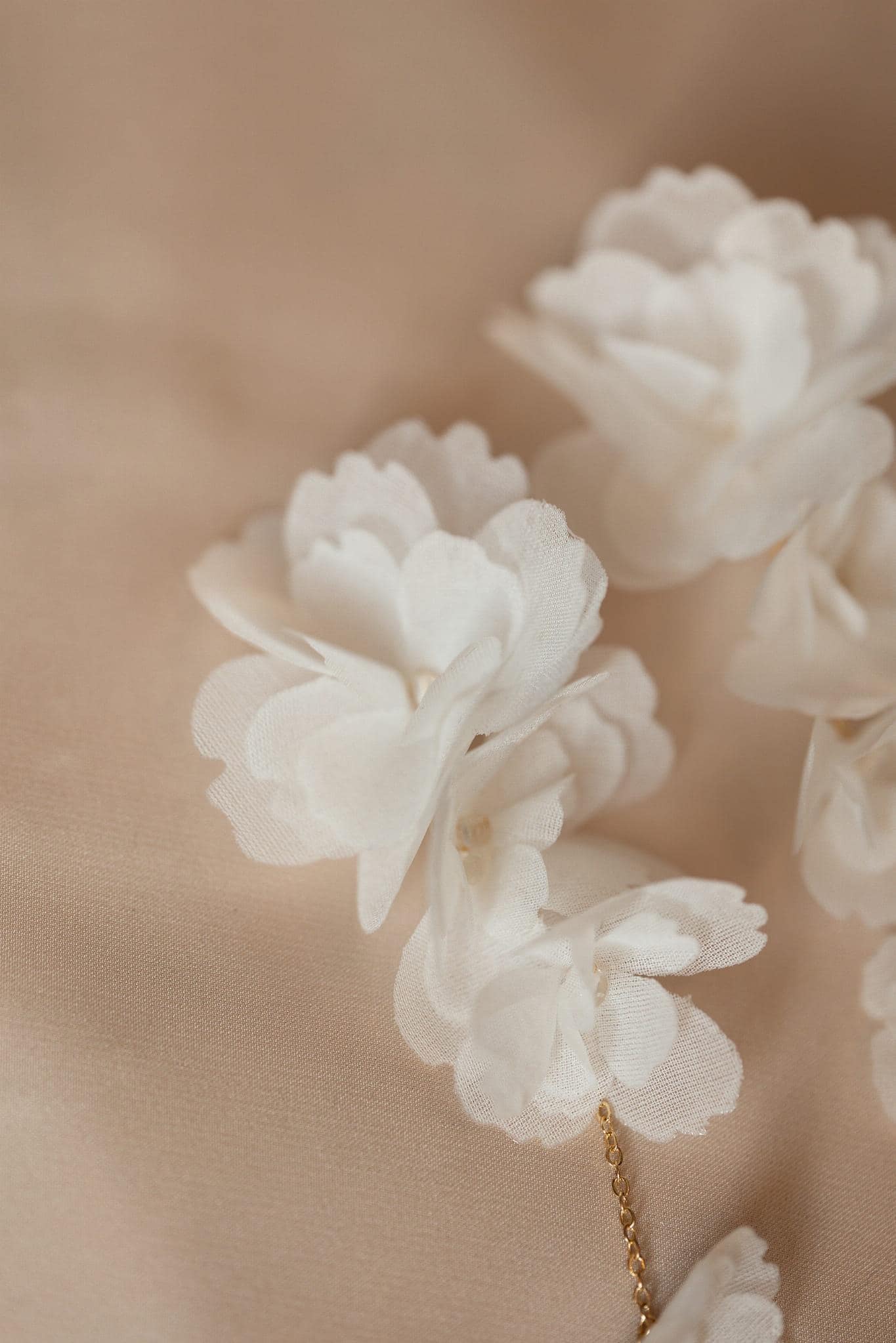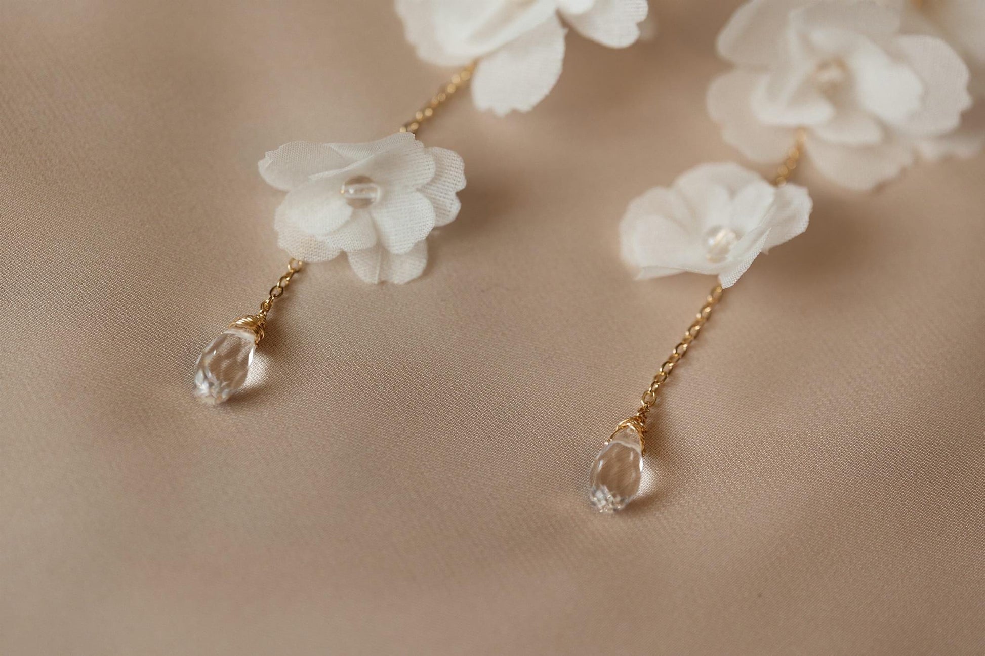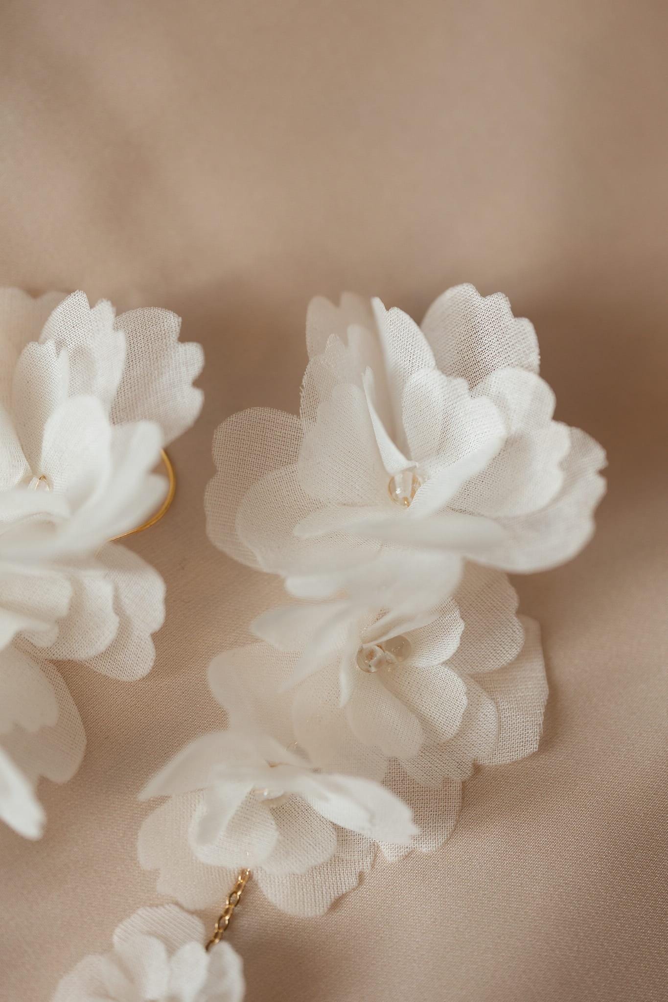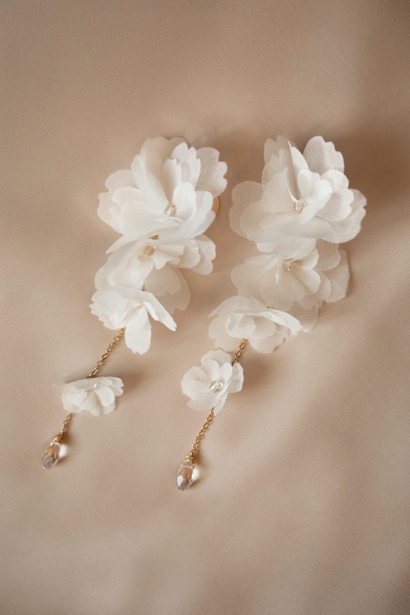 Hochzeitsohrringe aus Seidenblumen sind ein Muss für die Braut, die Wert auf Subtilität und einzigartigen Stil legt. Ihr ätherischer Look macht sie sowohl für romantische Boho-Stile als auch für klassische und elegante Kreationen geeignet.
