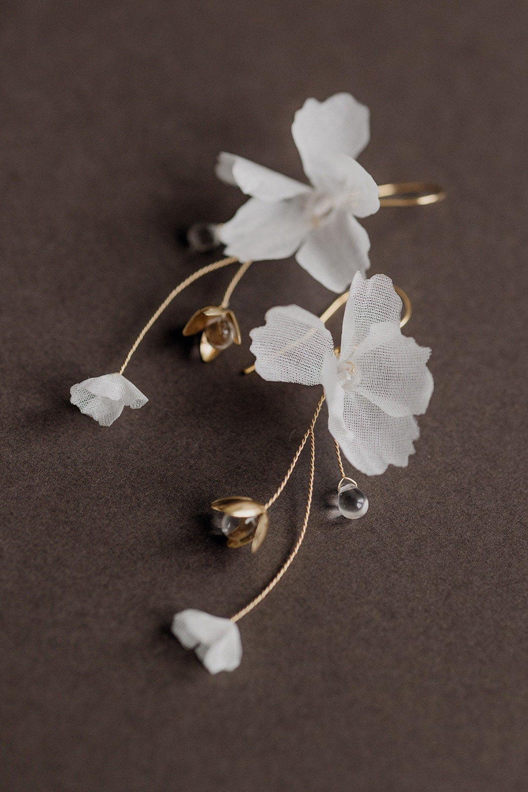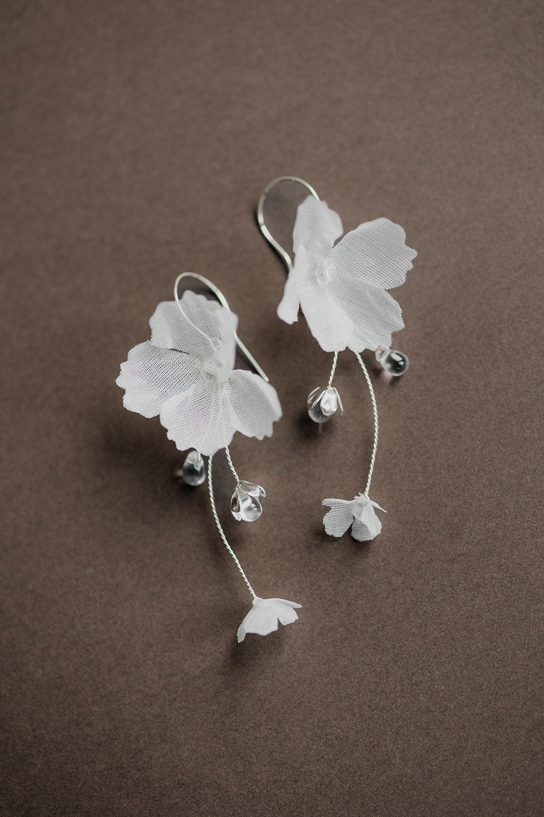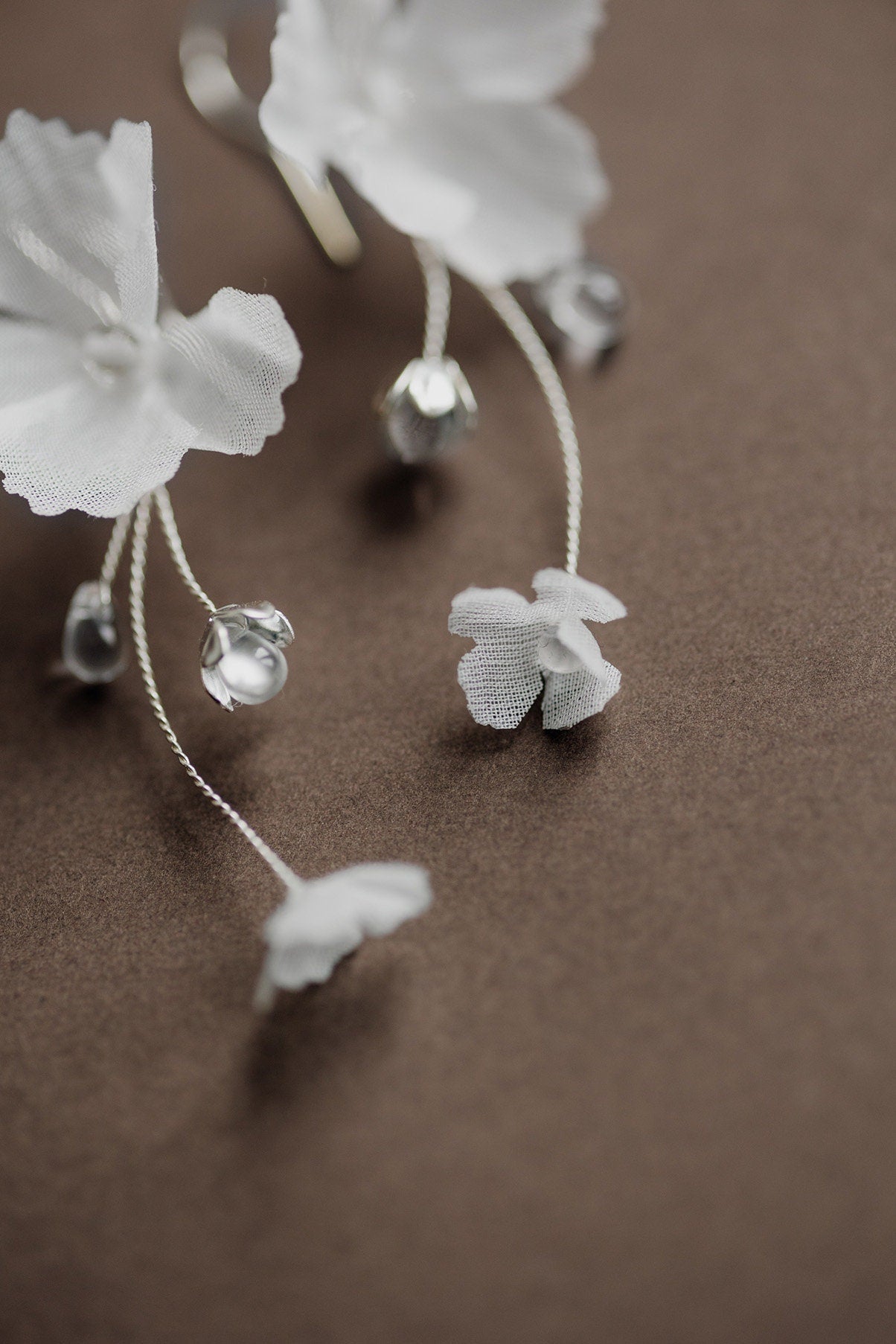 Wunderschöne, anmutige und luftige Hochzeitsohrringe aus Seidenblumen. Sie ziehen mit ihrer Zartheit die Aufmerksamkeit auf sich und sind eine großartige Ergänzung für rustikale Stile, verleihen aber auch romantischen und klassischen Stilen Frische und Eleganz.