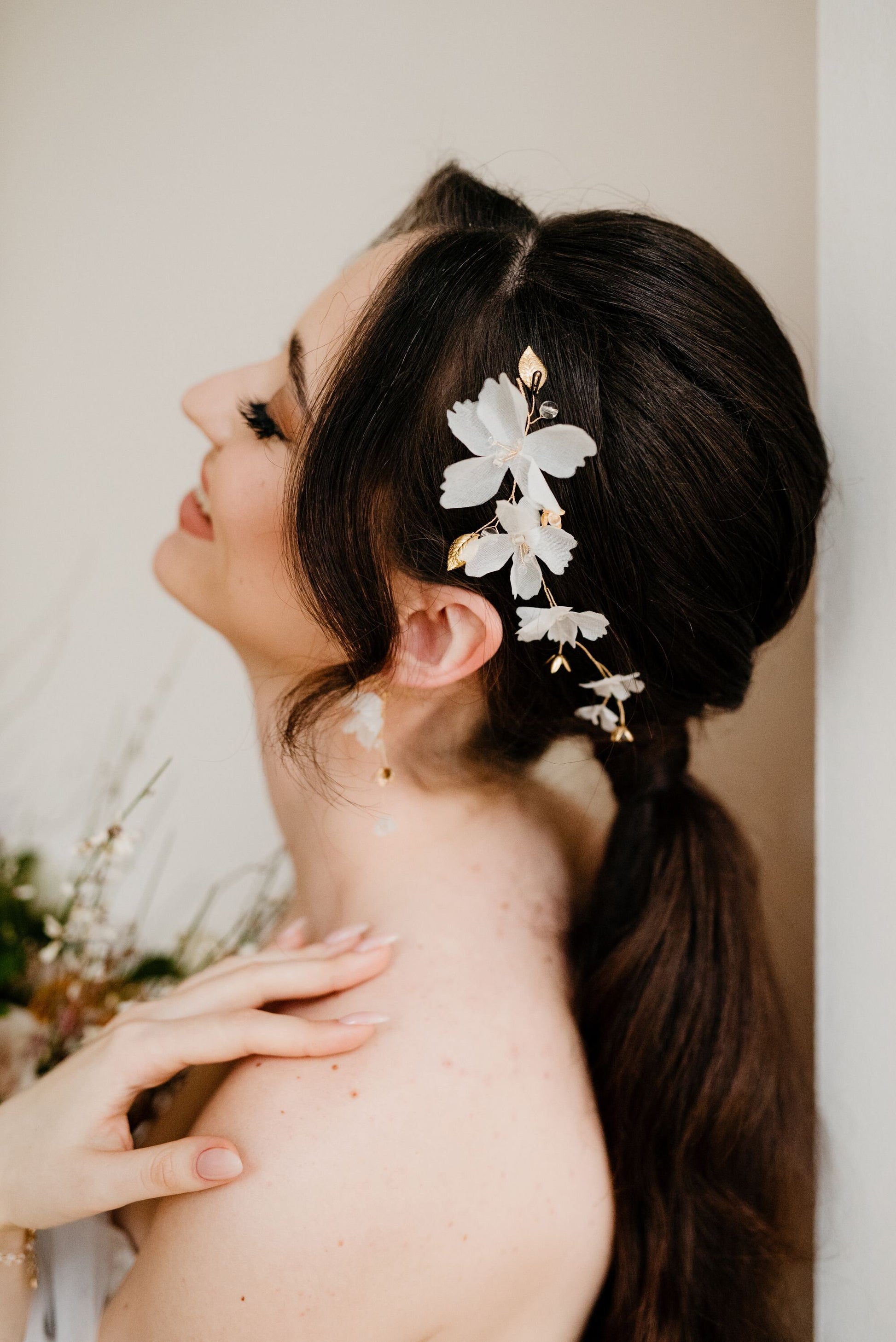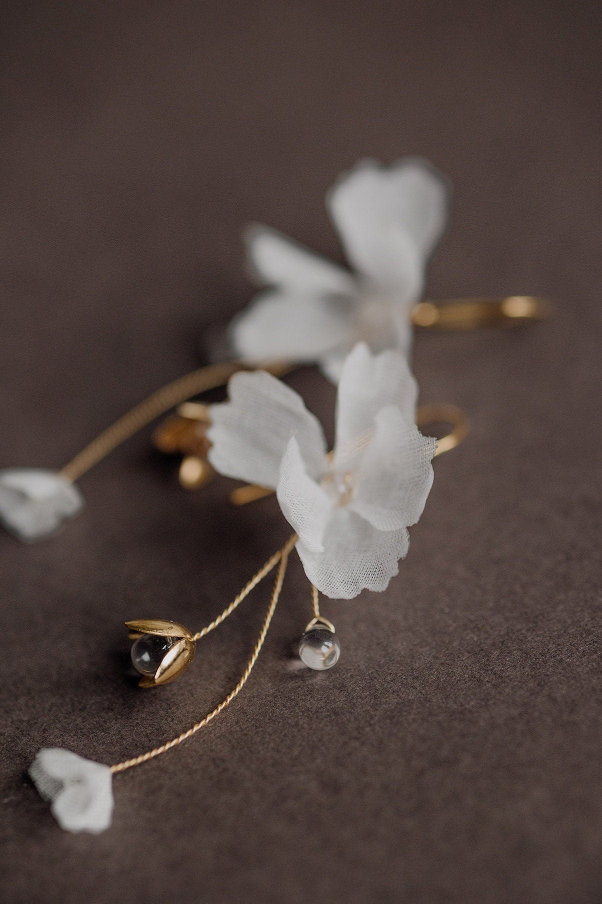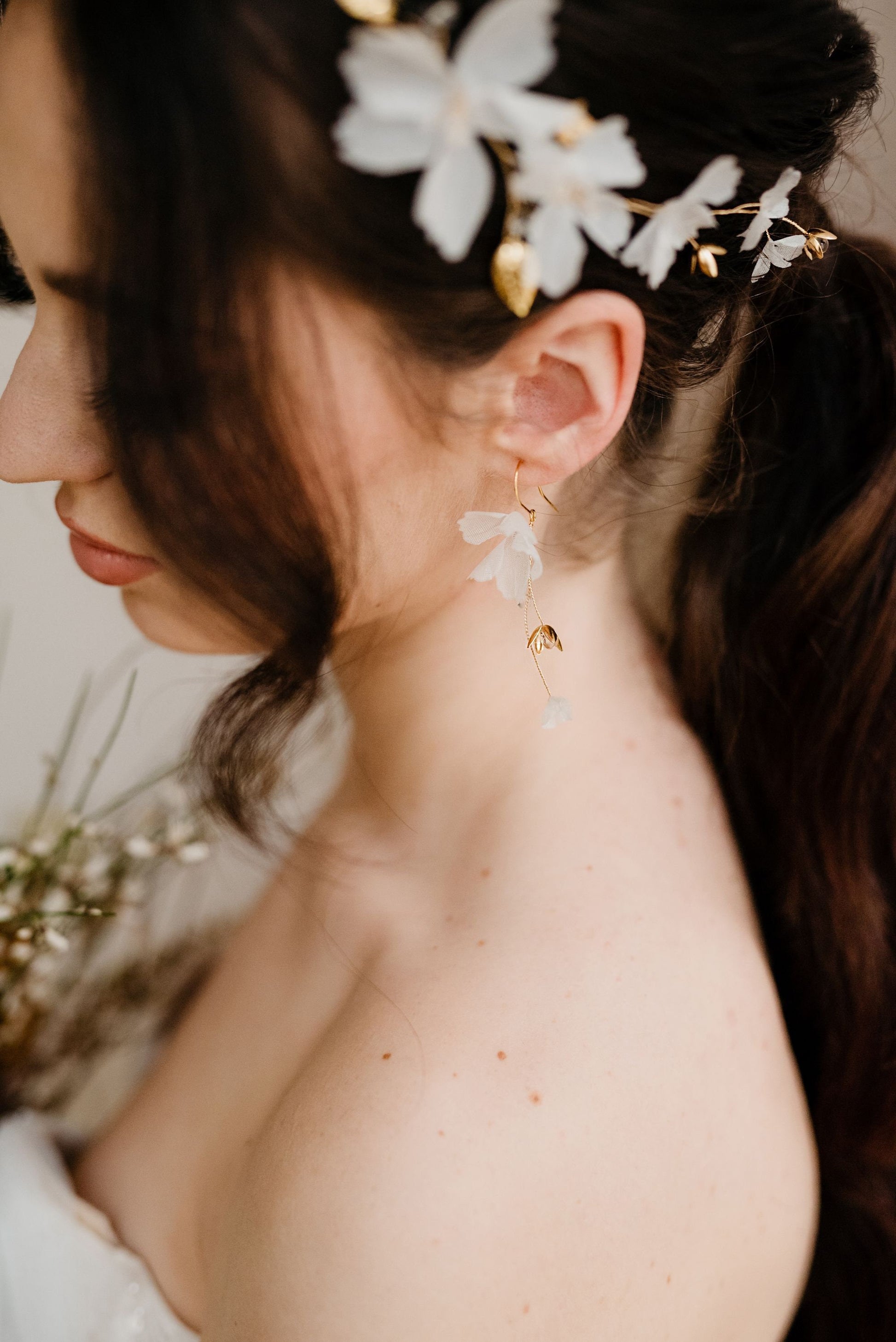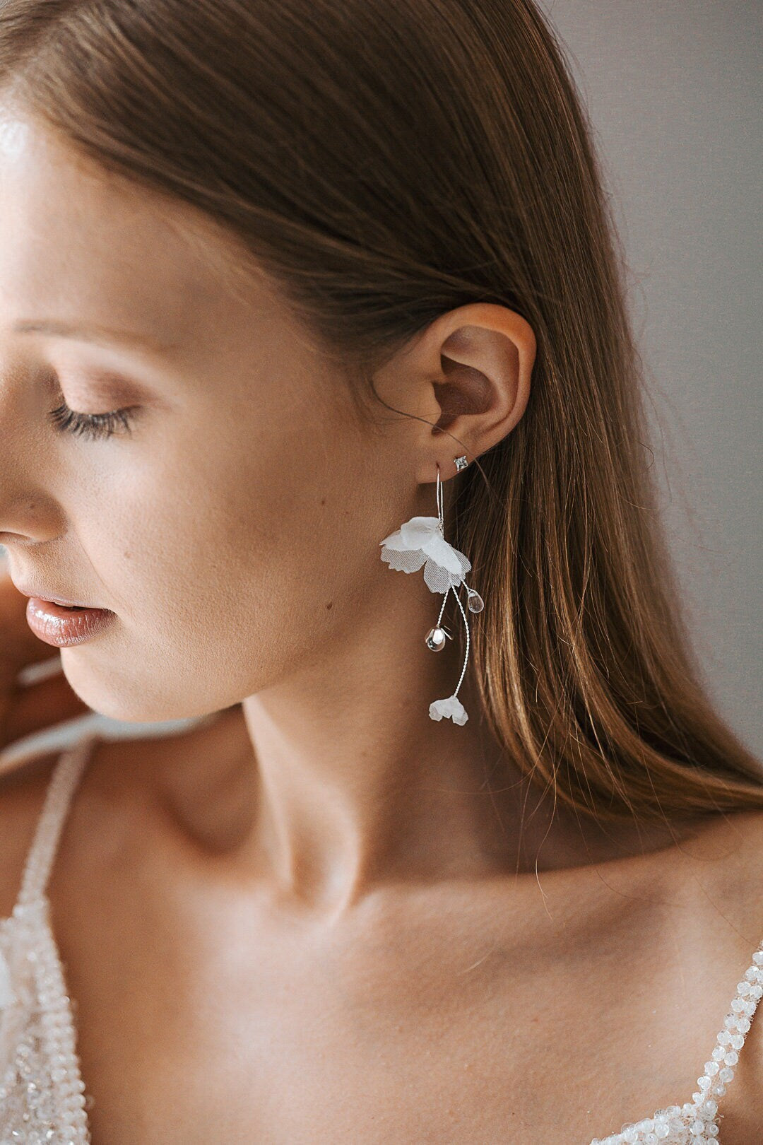 Wunderschöne, anmutige und luftige Hochzeitsohrringe aus Seidenblumen. Sie ziehen mit ihrer Zartheit die Aufmerksamkeit auf sich und sind eine großartige Ergänzung für rustikale Stile, verleihen aber auch romantischen und klassischen Stilen Frische und Eleganz.