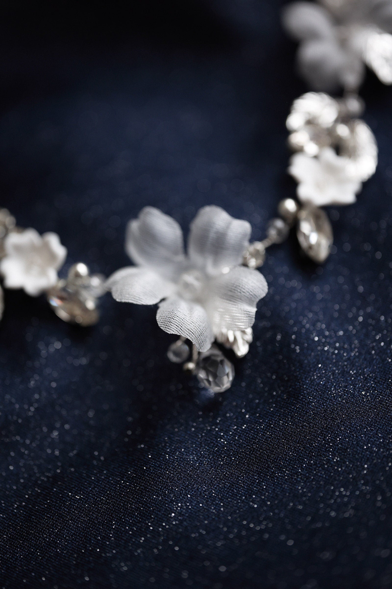 Eine zarte und feminine Hochzeitskette steckt voller subtiler Details, die den ätherischen Charakter jedes Stylings betonen. Seidenblumen verweisen auf den romantischen Stil, während glänzende Kristalle, Blätter und Zirkone Eleganz und zeitlosen Chic verleihen.