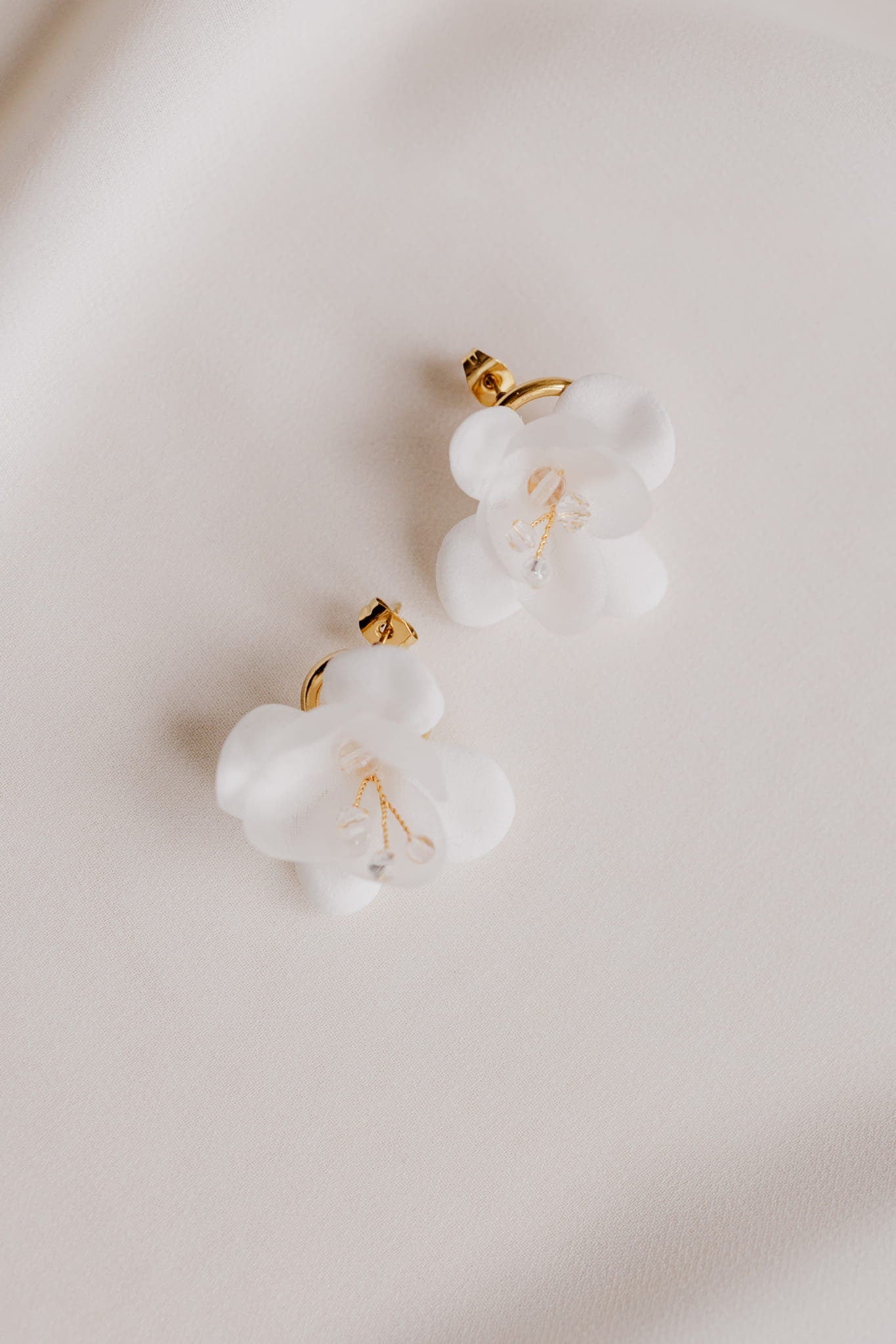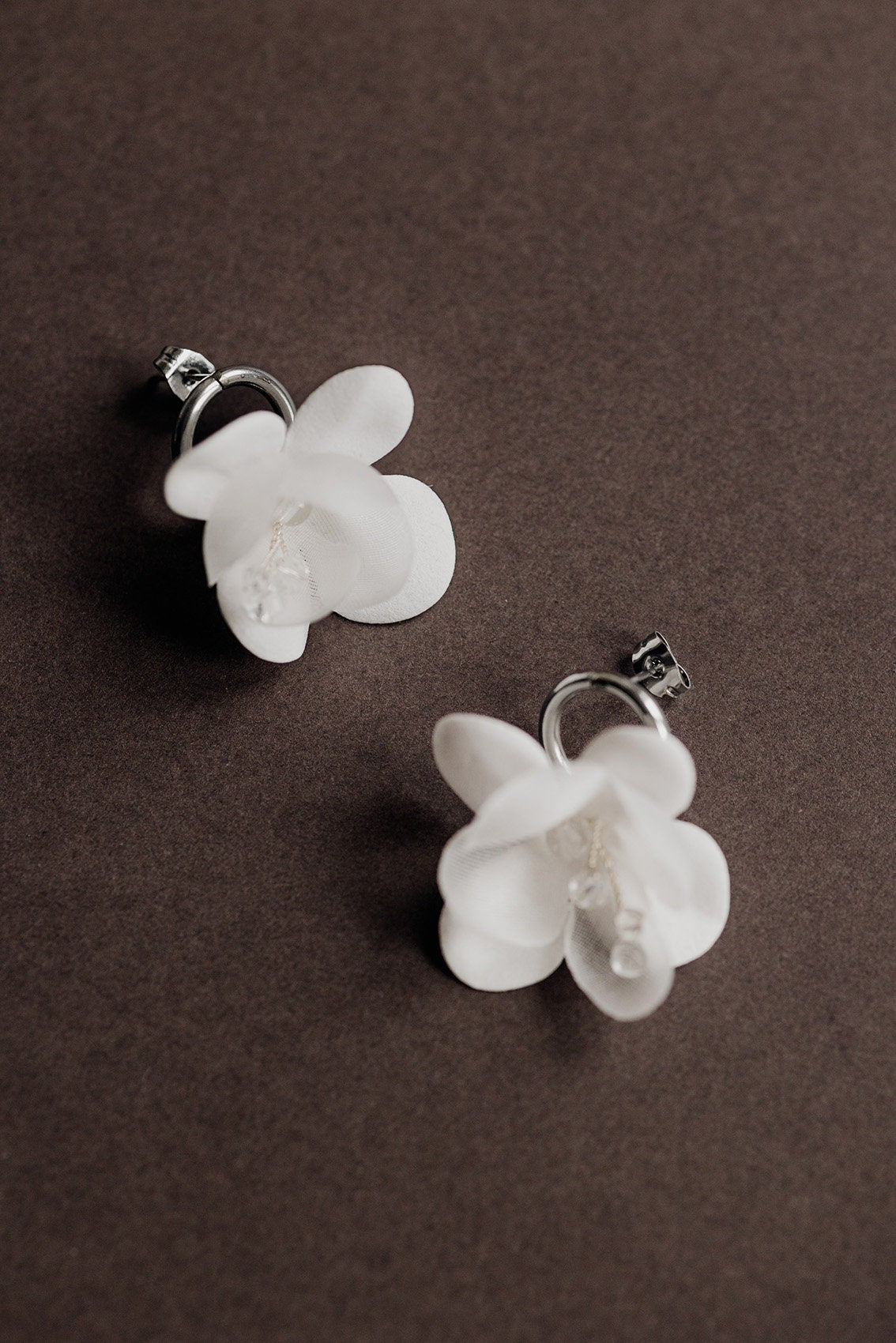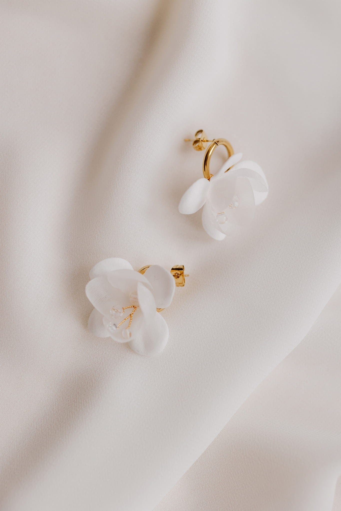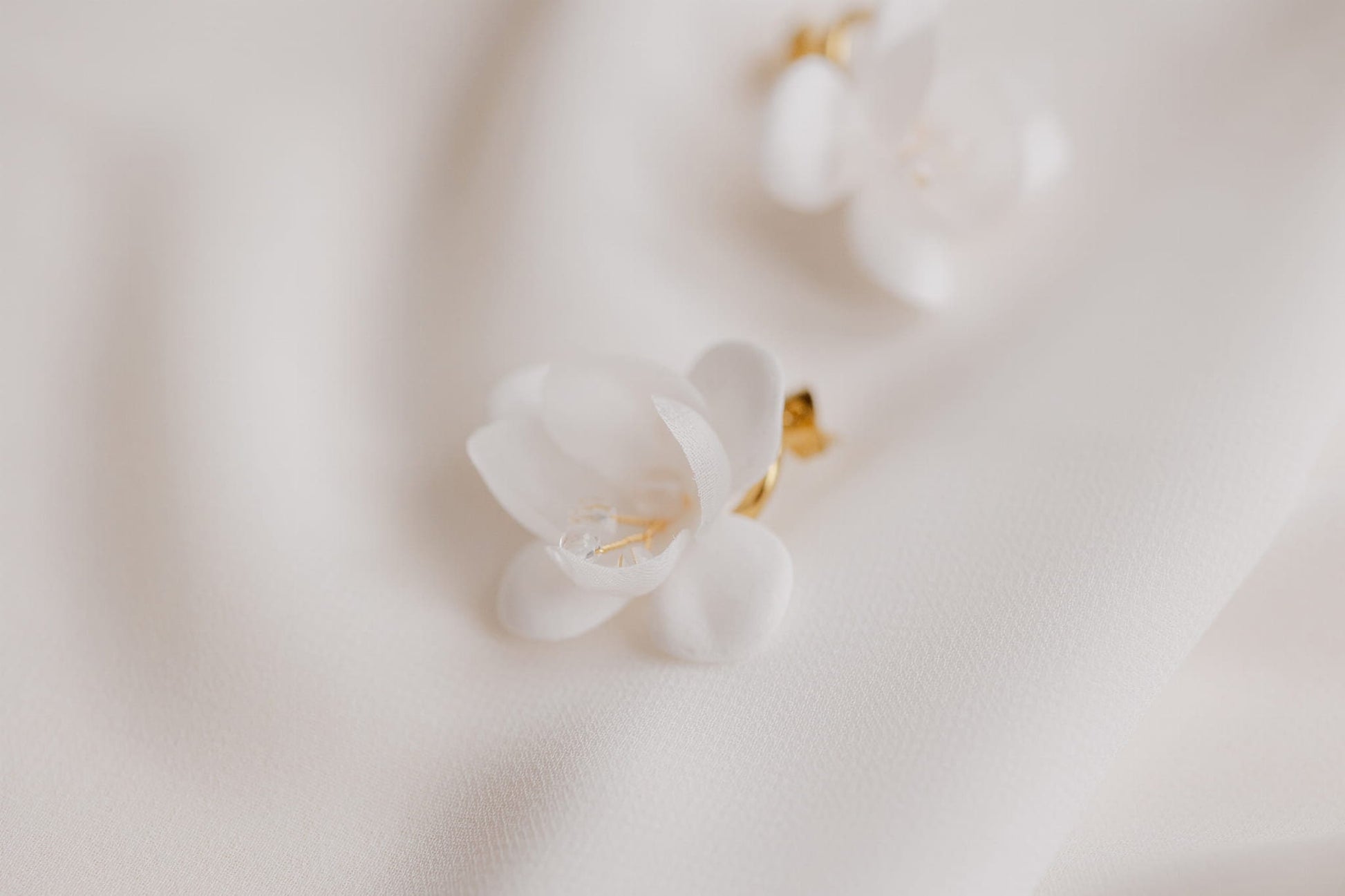 Weiße, samtig weiche und zarte Seidenblumen fügen sich harmonisch in einen kleinen Kreis ein und ergeben so dezente Hochzeitsohrringe. Ihr Charme unterstreicht jedes Hochzeitsstyling und verleiht ihm einen einzigartigen Look.