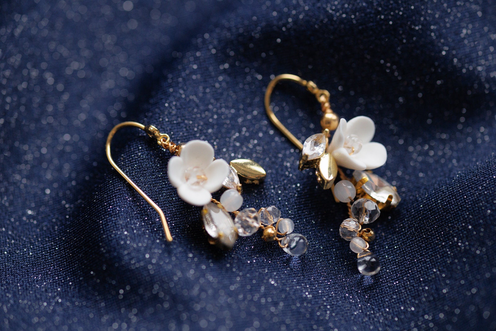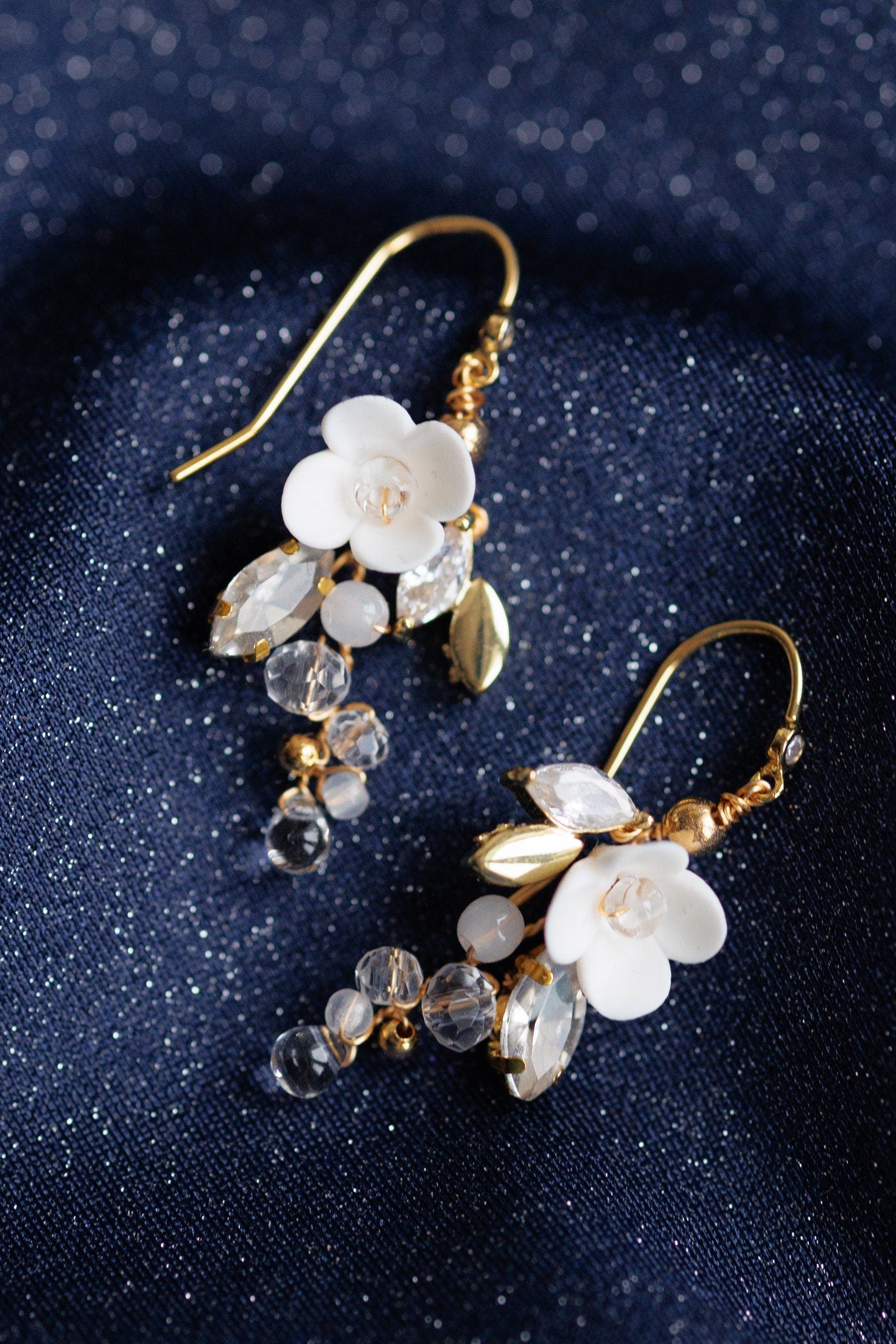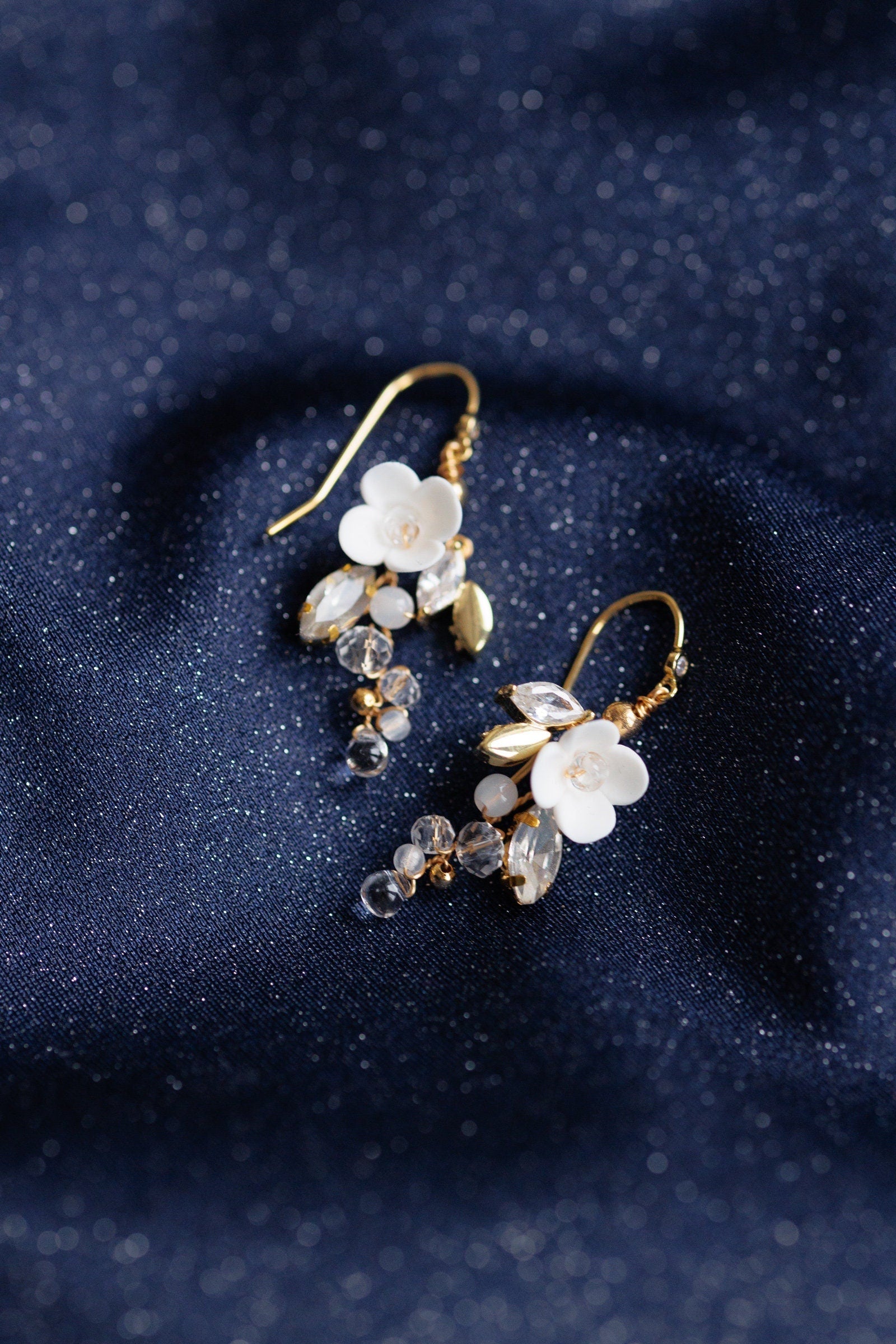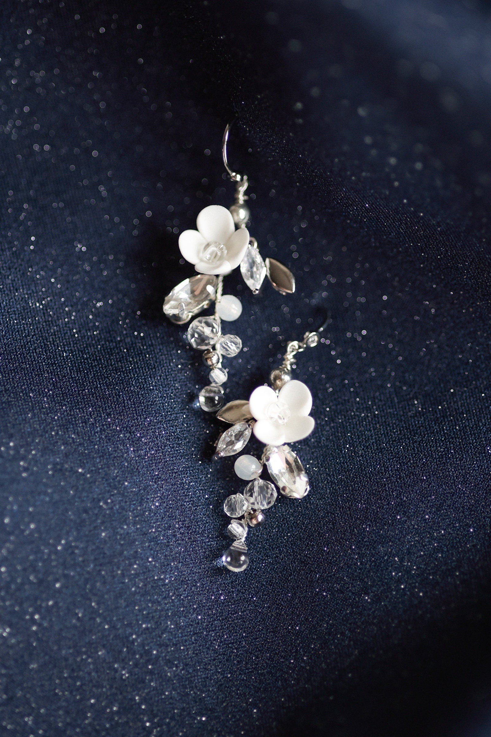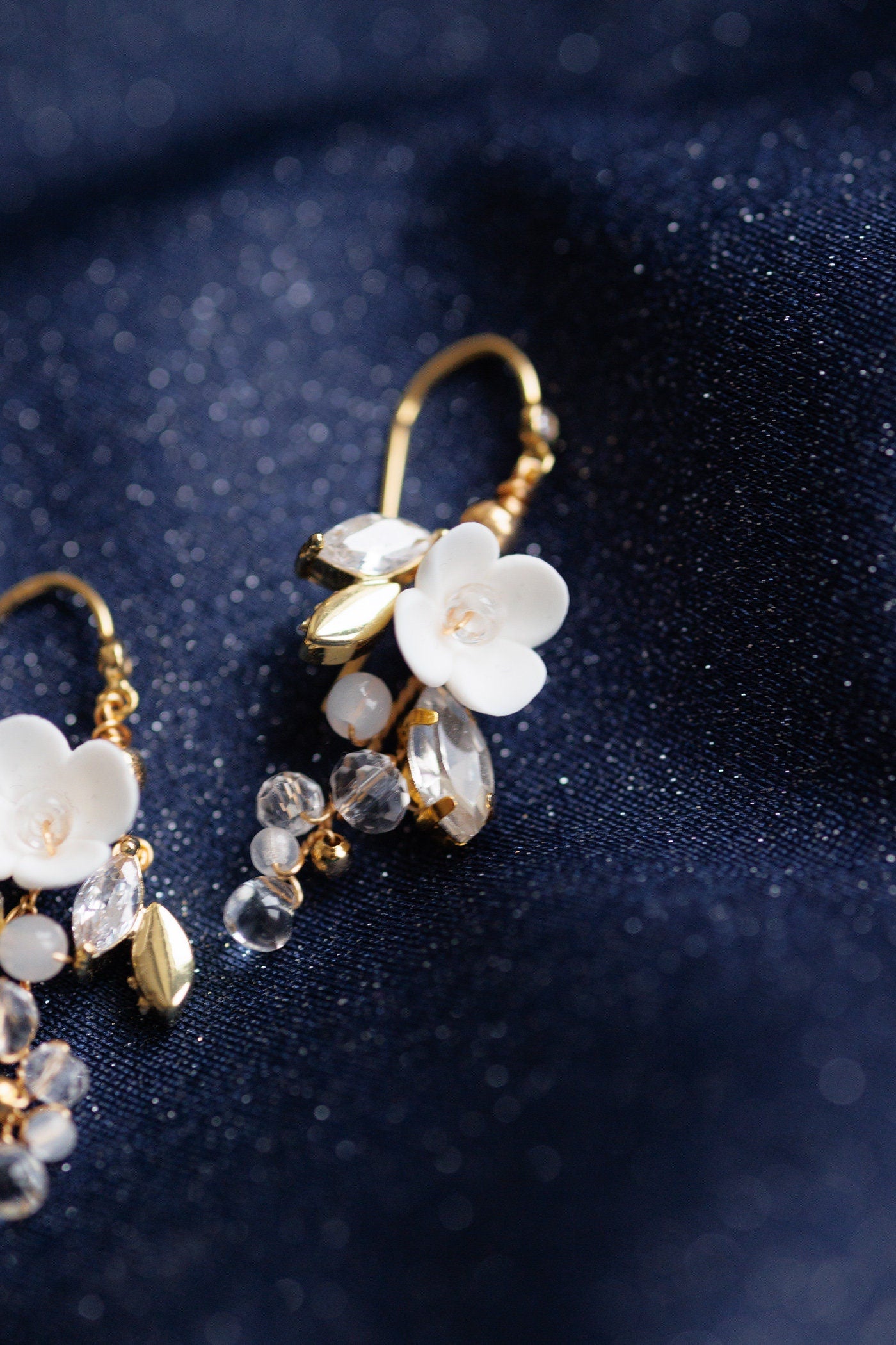 Hochzeitsohrringe, zart und anmutig, mit kleinen Elementen aus Blumen und Kristallen, verführen durch ihre Komposition. Sie betonen wunderschön und mühelos die Schönheit der Braut und harmonieren mit verschiedenen Stilen, zum Beispiel romantisch und feminin, klassisch oder elegant.