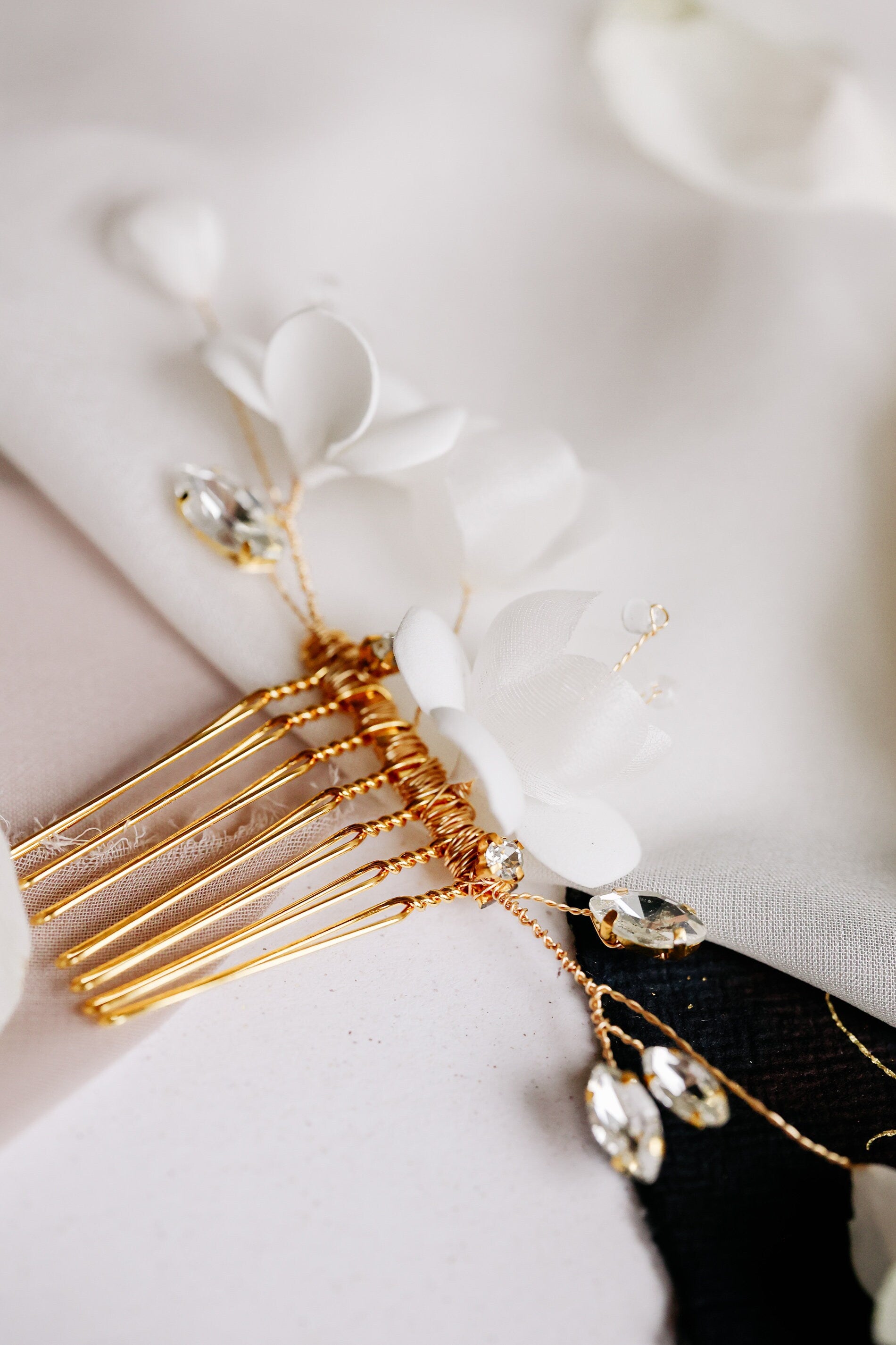 Voller Charme und subtiler Eleganz schmückt der Haarkamm verschiedene Hochzeitsfrisuren. Die Komposition aus weißem Samt und Seidenblumen, verziert mit dem Glanz glänzender Kristalle, passt sowohl zu Dutts als auch zu Hollywood-Wellen.