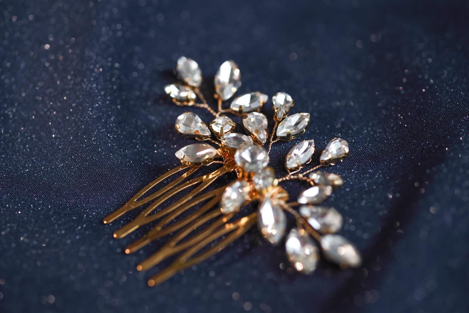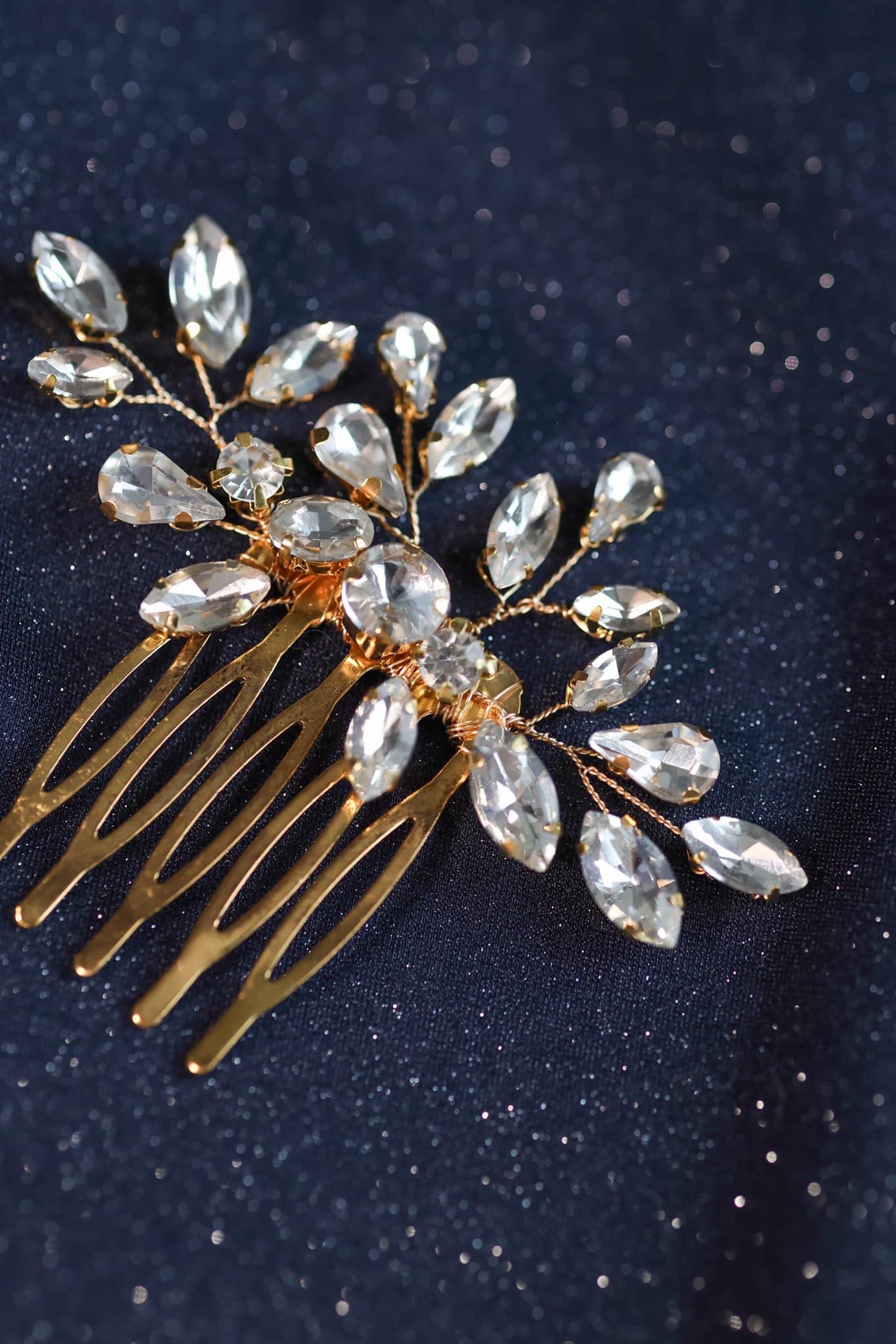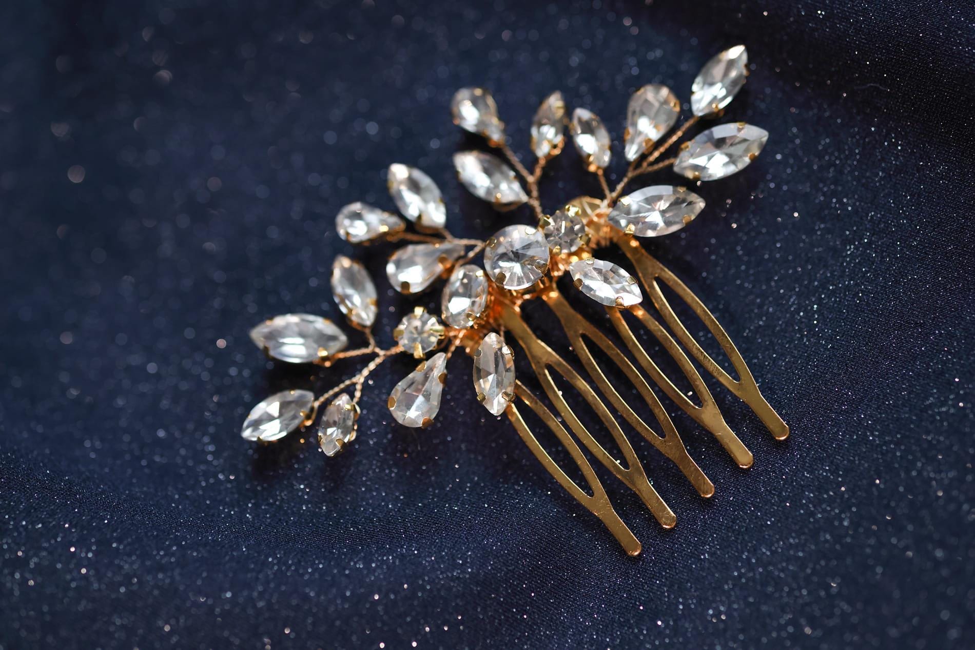 Funkelnde Kristalle ergeben einen magischen Kamm für Hochsteckfrisuren, z. B. Hollywood-Wellen oder verschiedene Dutt-Typen. Sein einzigartiger Chic und Charme verleihen romantischen Frisuren Charme und betonen den eleganten Stil klassischer Frisuren.