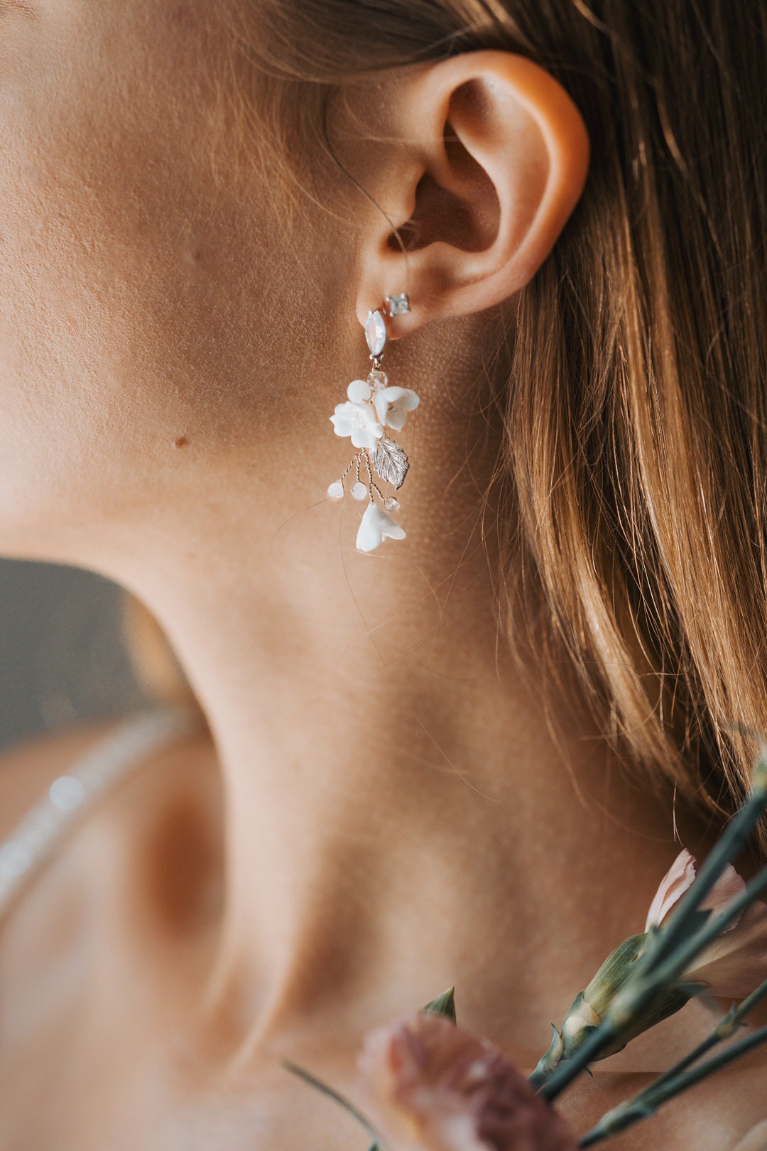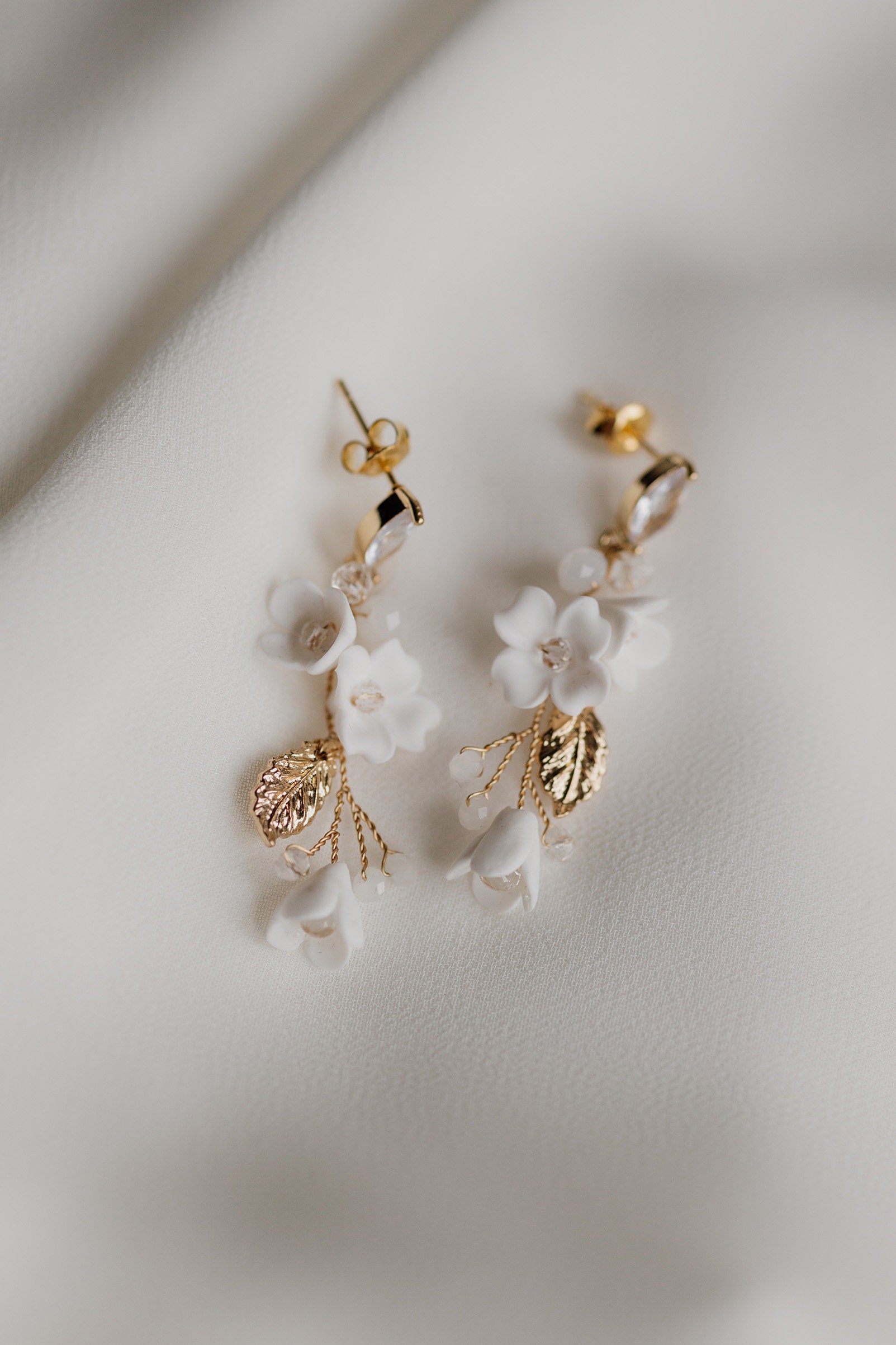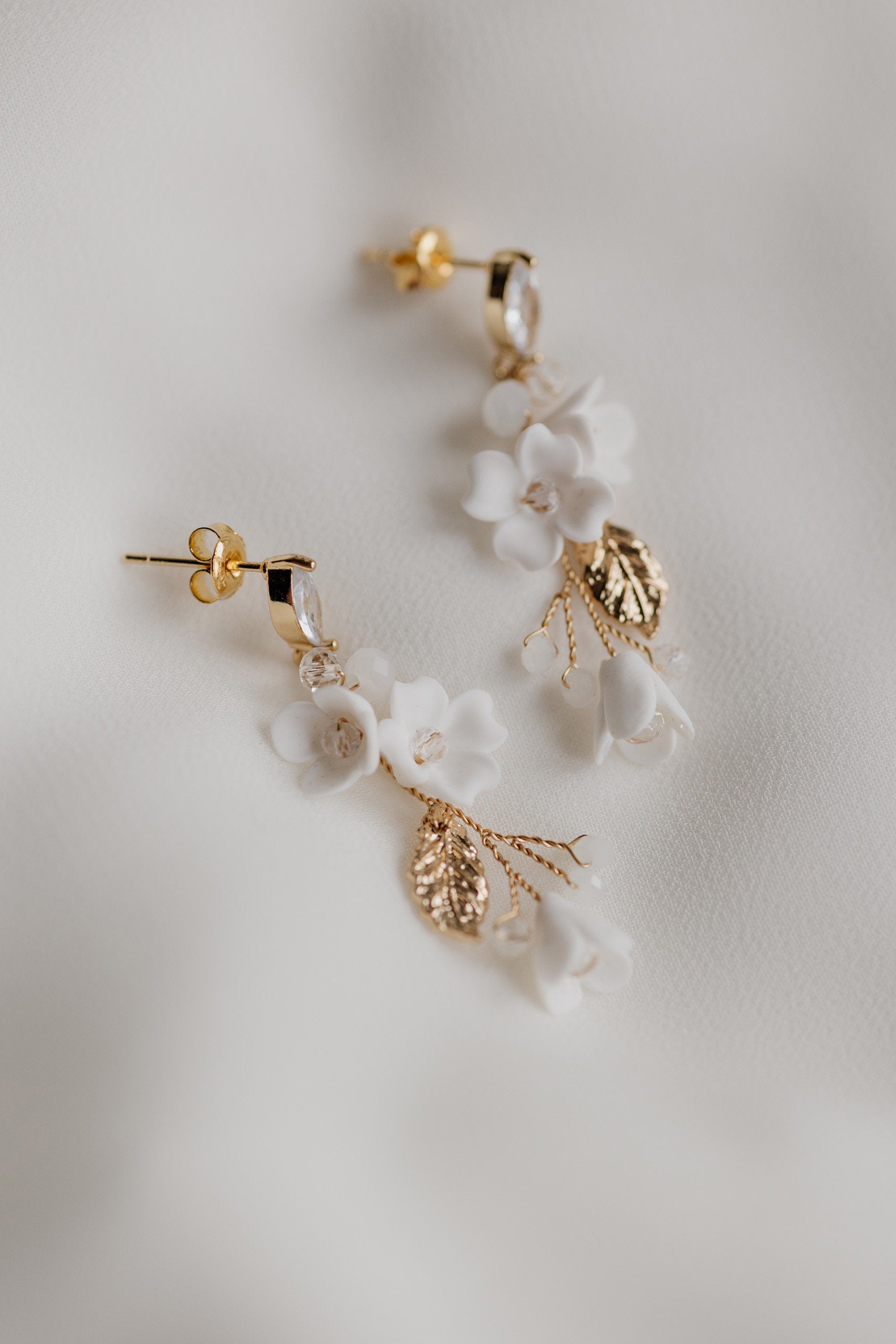 Zarte und anmutige Hochzeitsohrringe betonen auf ungezwungene Weise die Schönheit der Braut. Hergestellt aus weißen Blumen, glänzenden Blättern und verschiedenen Kristallen in kleiner Form, fügen sie sich perfekt in romantische und rustikale Stile ein und verleihen den klassischen eine erfrischende Note und Finesse.
