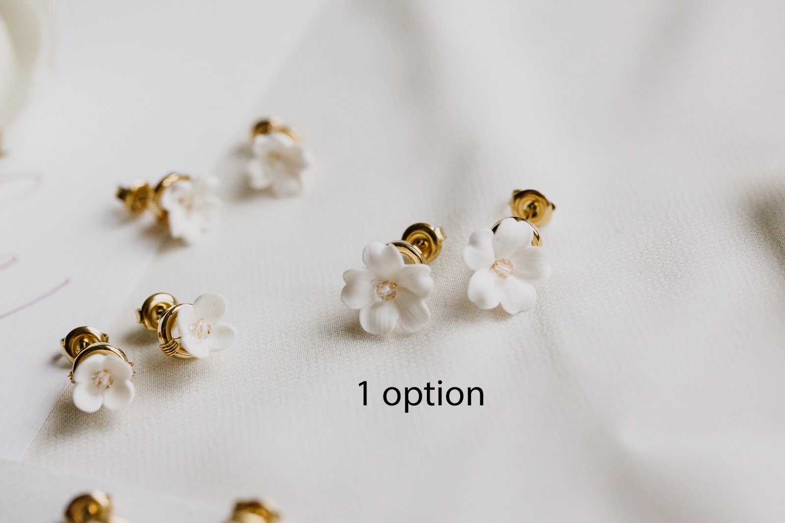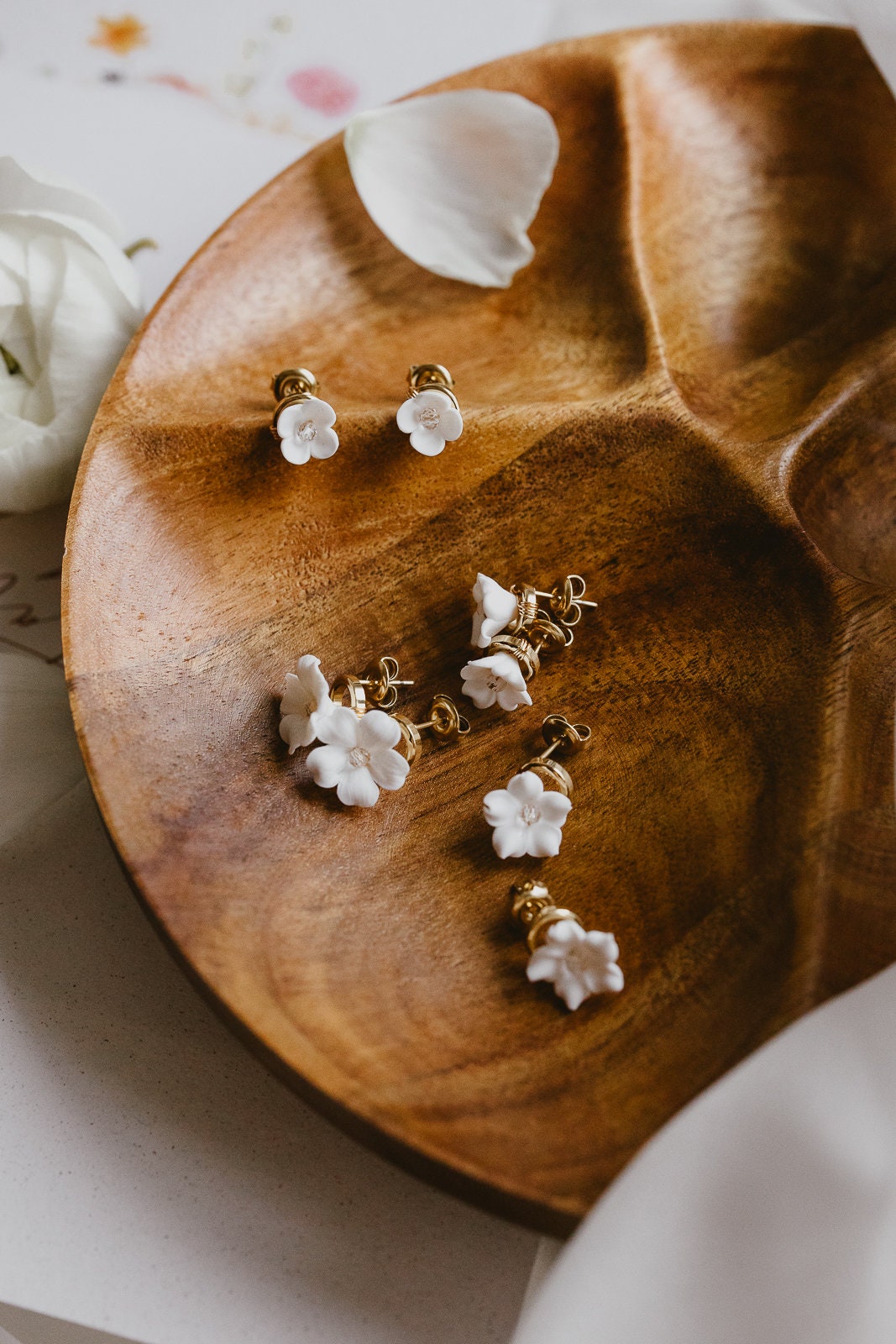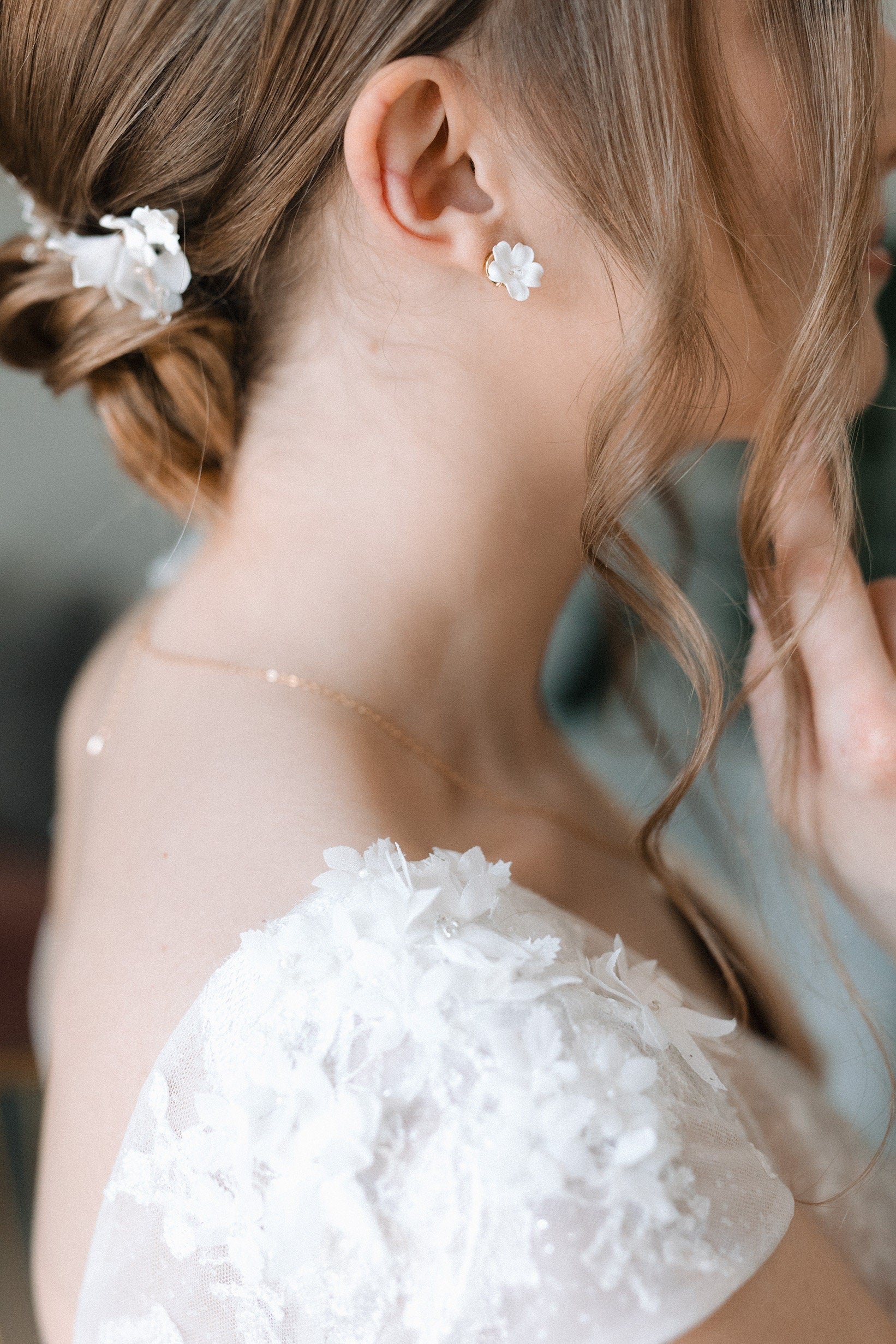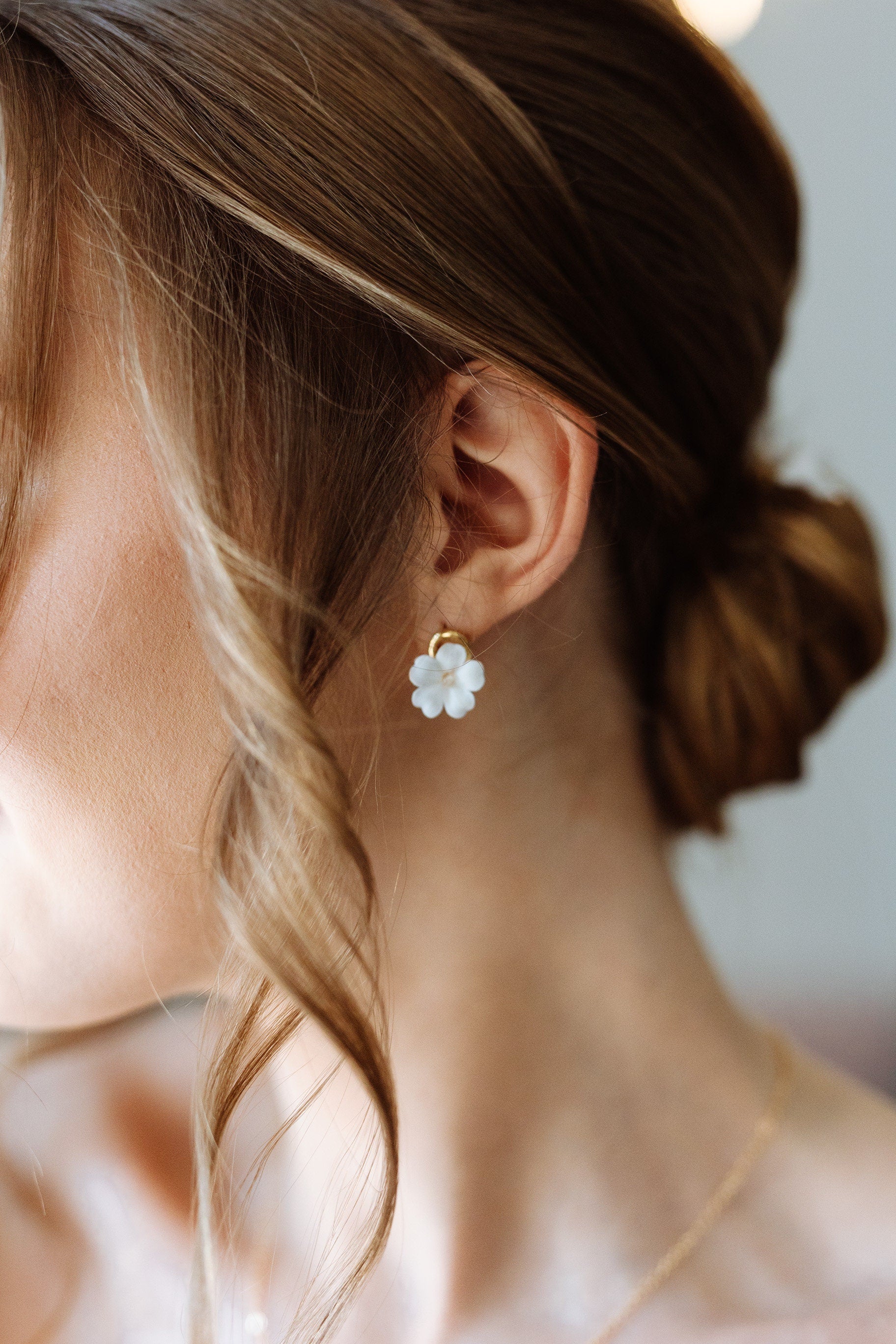 Hochzeitsohrringe, zart und anmutig, mit winzigen Blumen auf einem kleinen Stab, verführen durch ihre Natürlichkeit. Sie betonen subtil und mühelos die Schönheit der Braut und sind ein perfekter Akzent für romantische, rustikale und klassische Hochzeitsstylings.