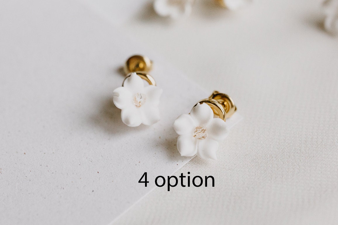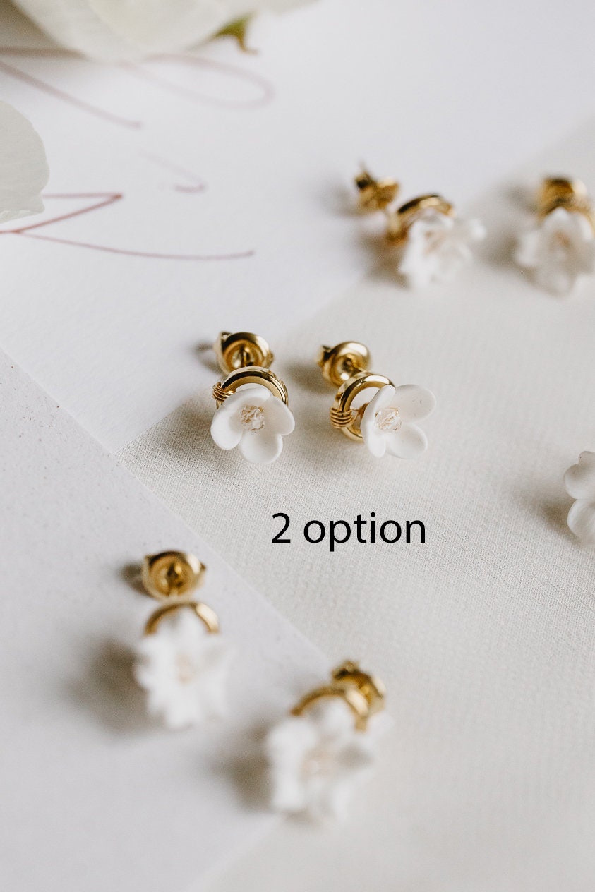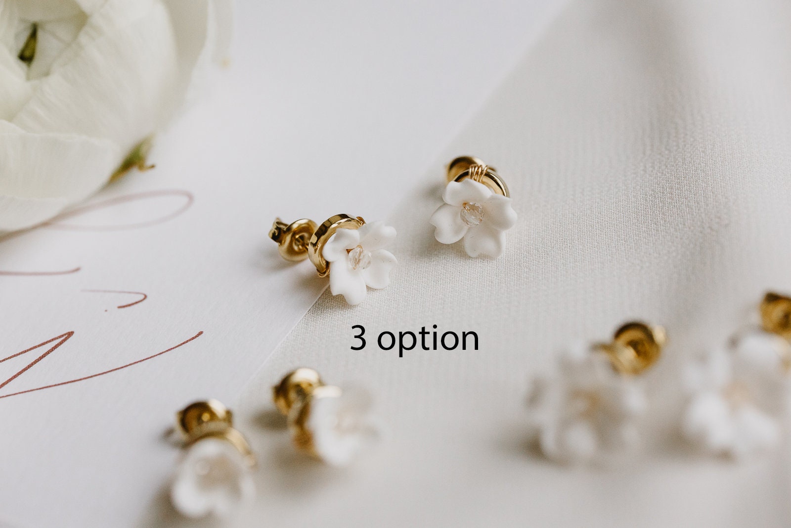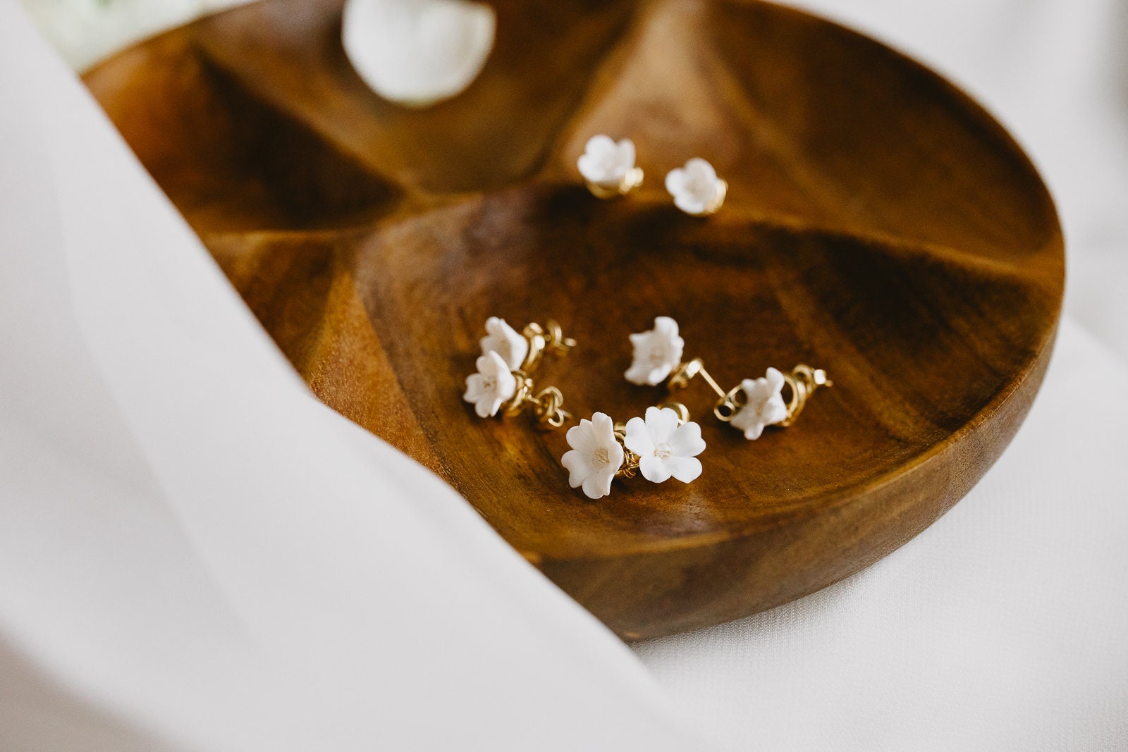 Hochzeitsohrringe, zart und anmutig, mit winzigen Blumen auf einem kleinen Stab, verführen durch ihre Natürlichkeit. Sie betonen subtil und mühelos die Schönheit der Braut und sind ein perfekter Akzent für romantische, rustikale und klassische Hochzeitsstylings.