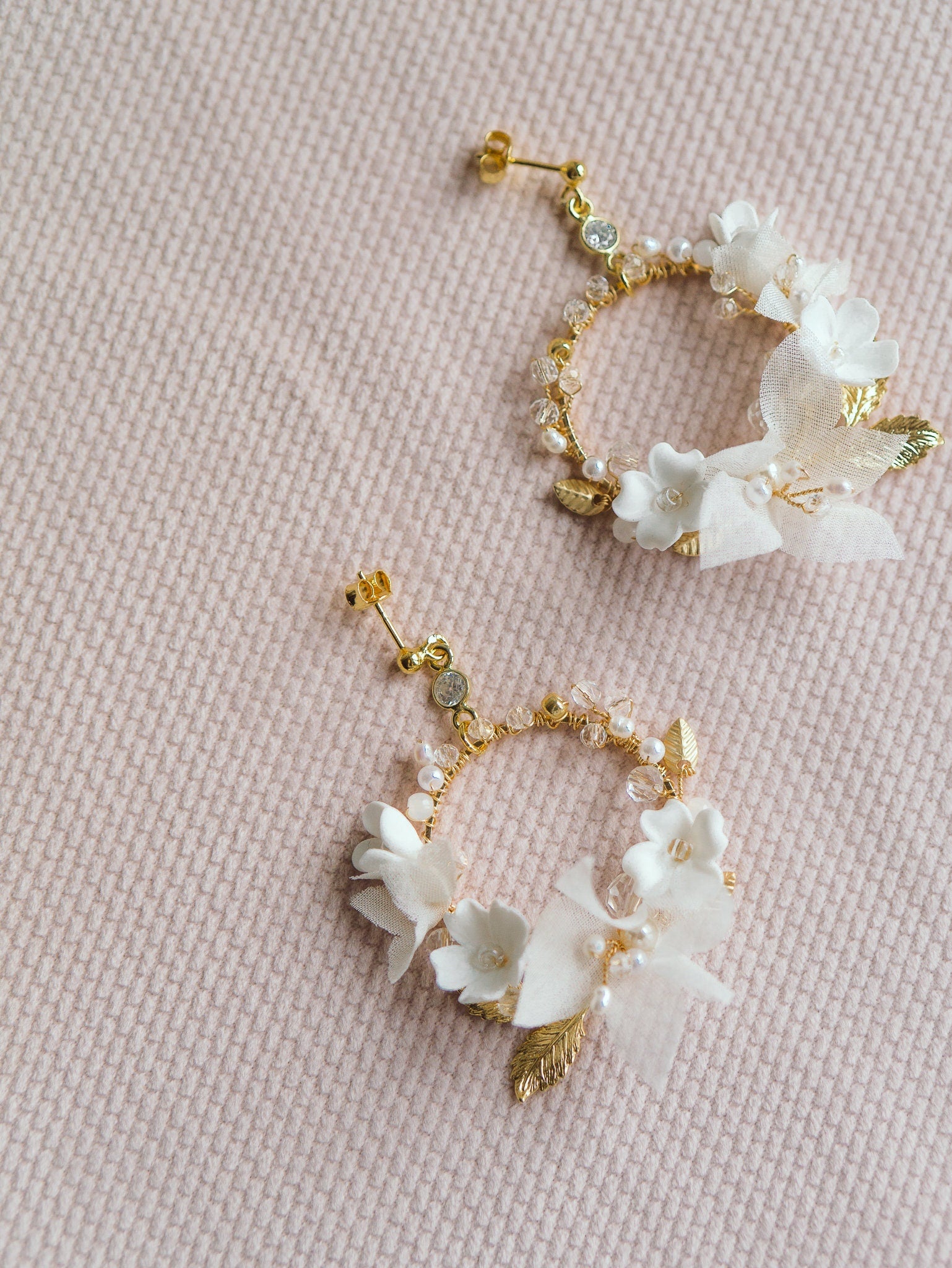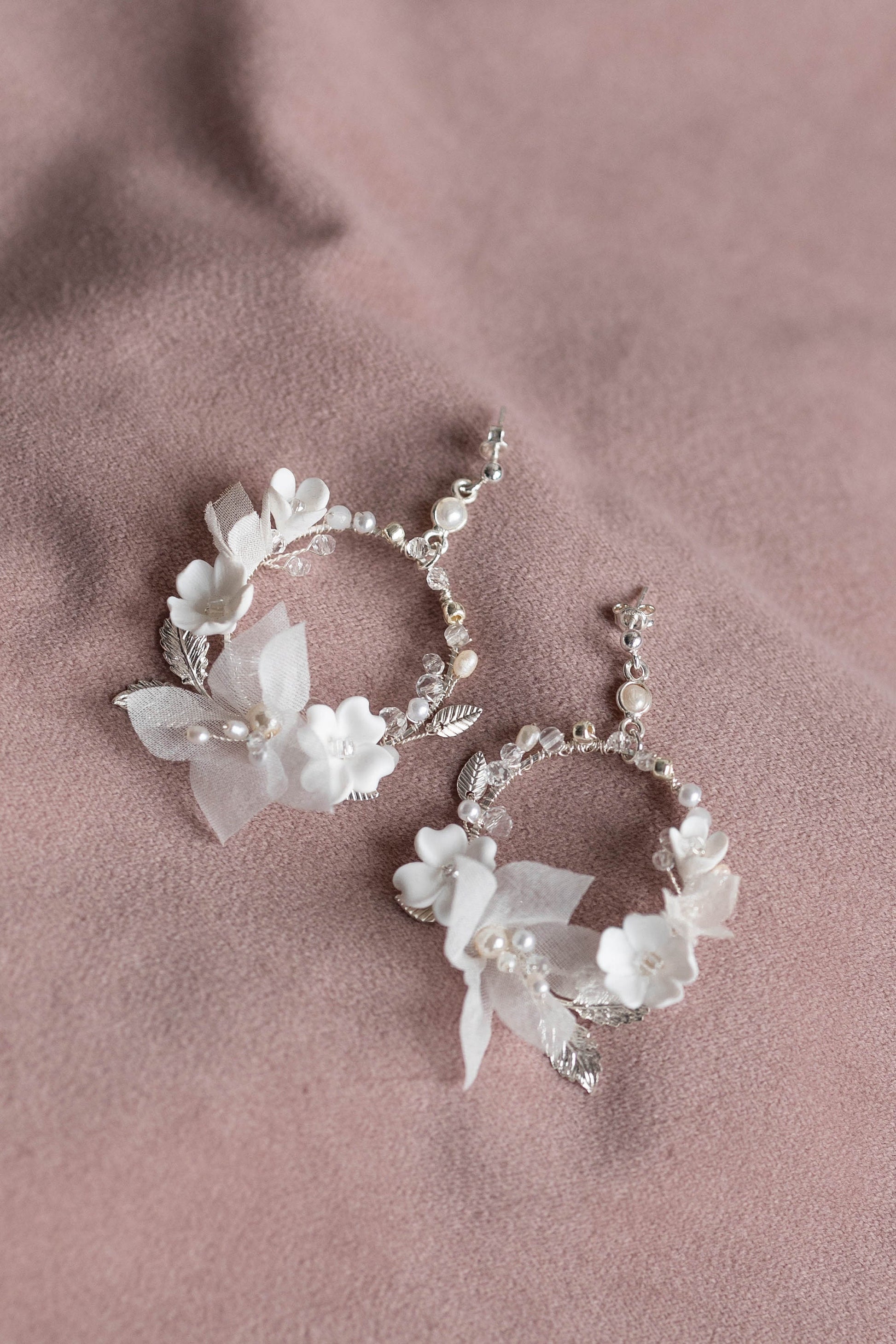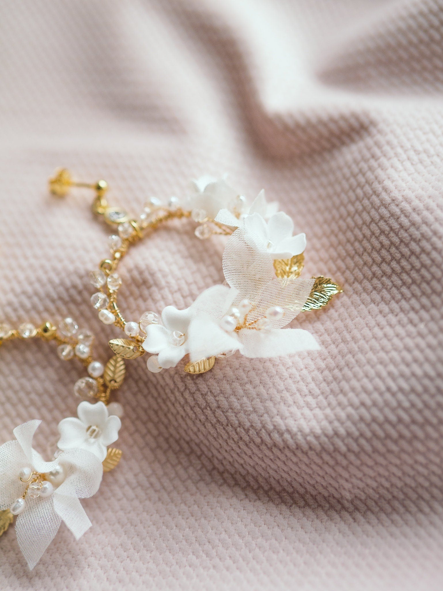 Hochzeitsohrringe im Boho-Stil mit Seidenblumen und weißen Knospen, verflochten mit Kristallen, Perlen und zarten Blättern.