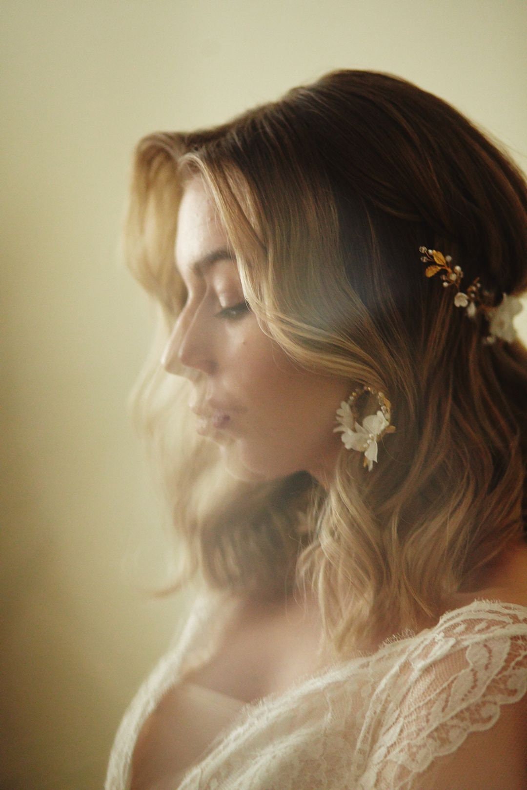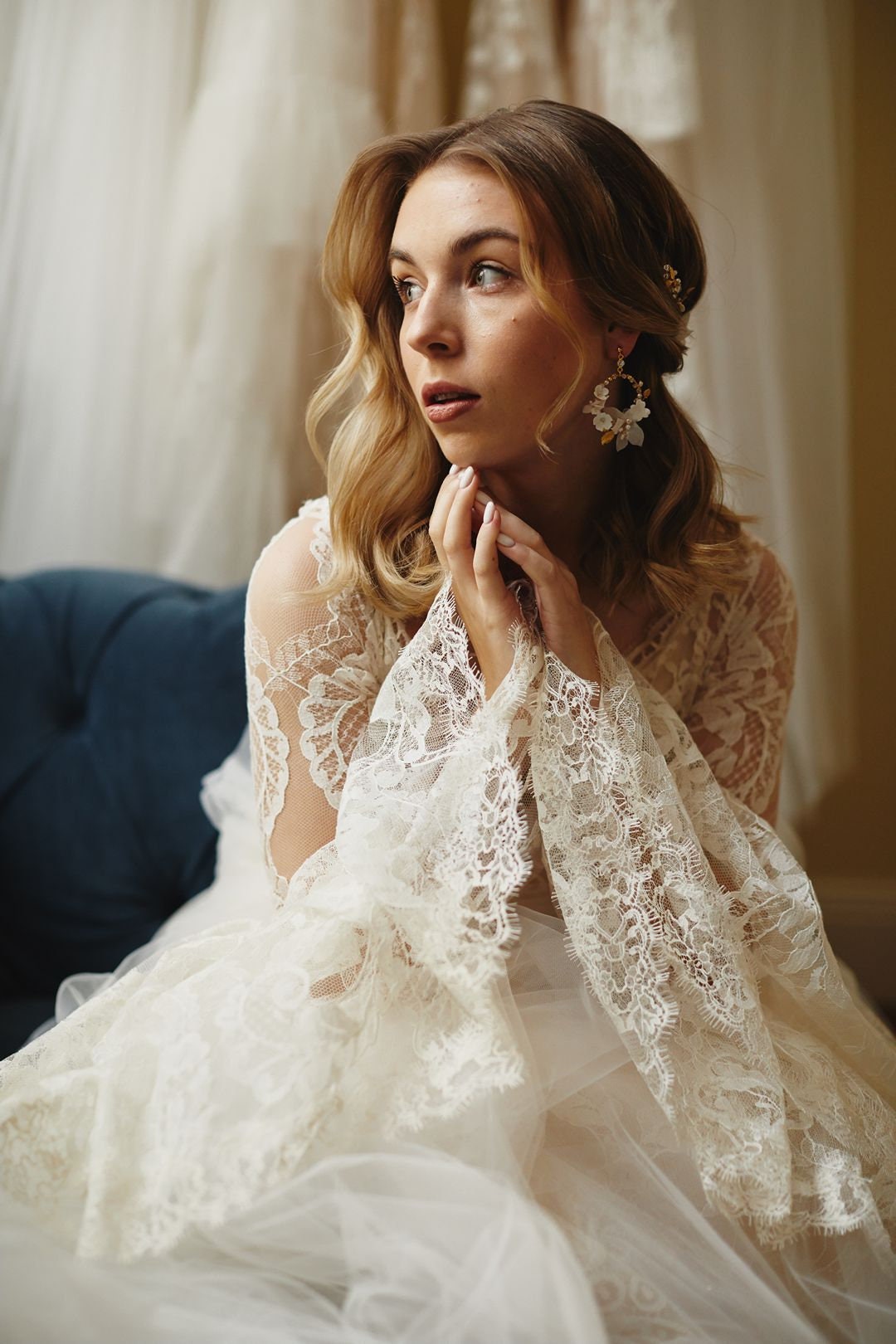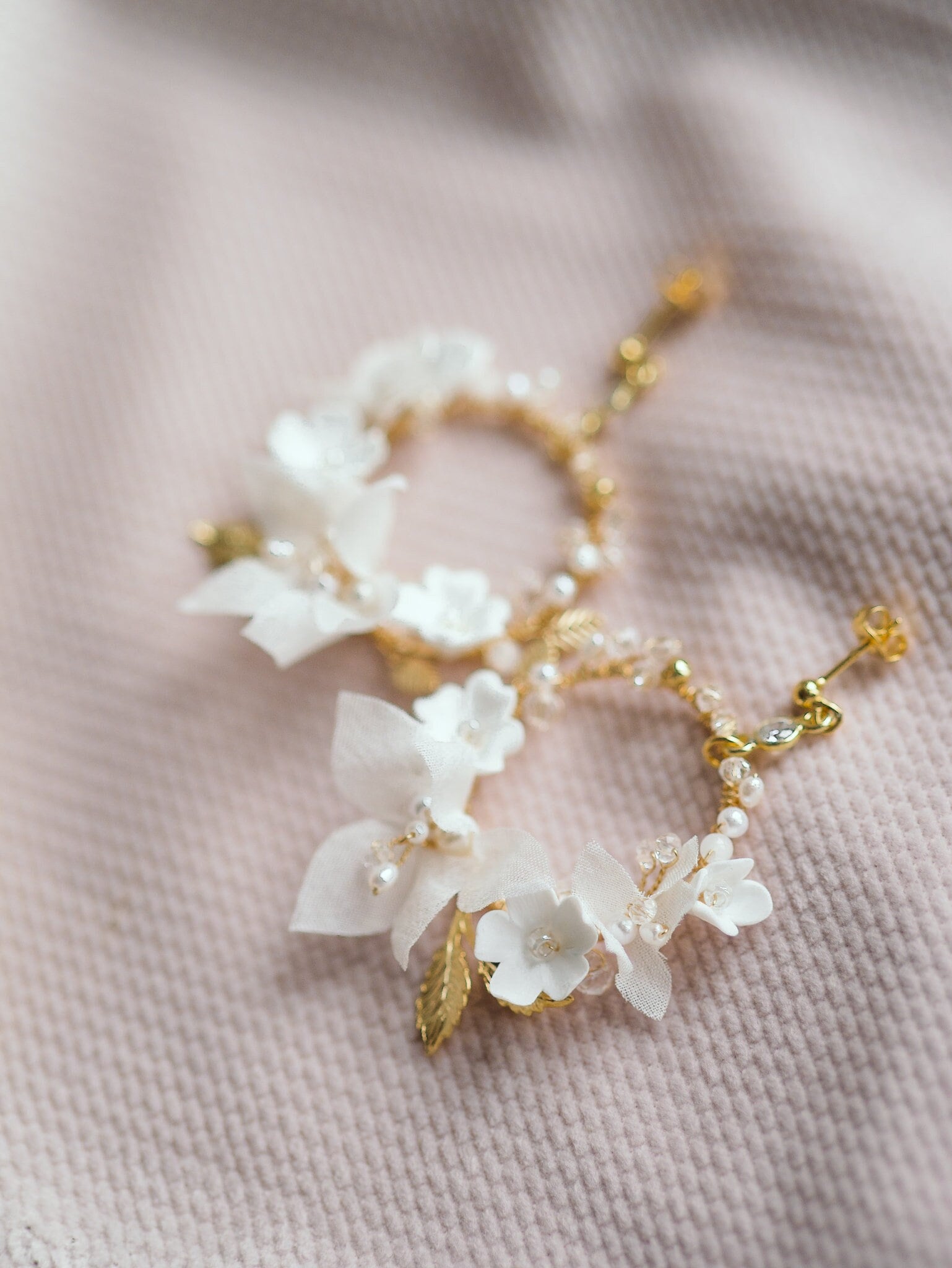 Hochzeitsohrringe im Boho-Stil mit Seidenblumen und weißen Knospen, verflochten mit Kristallen, Perlen und zarten Blättern.