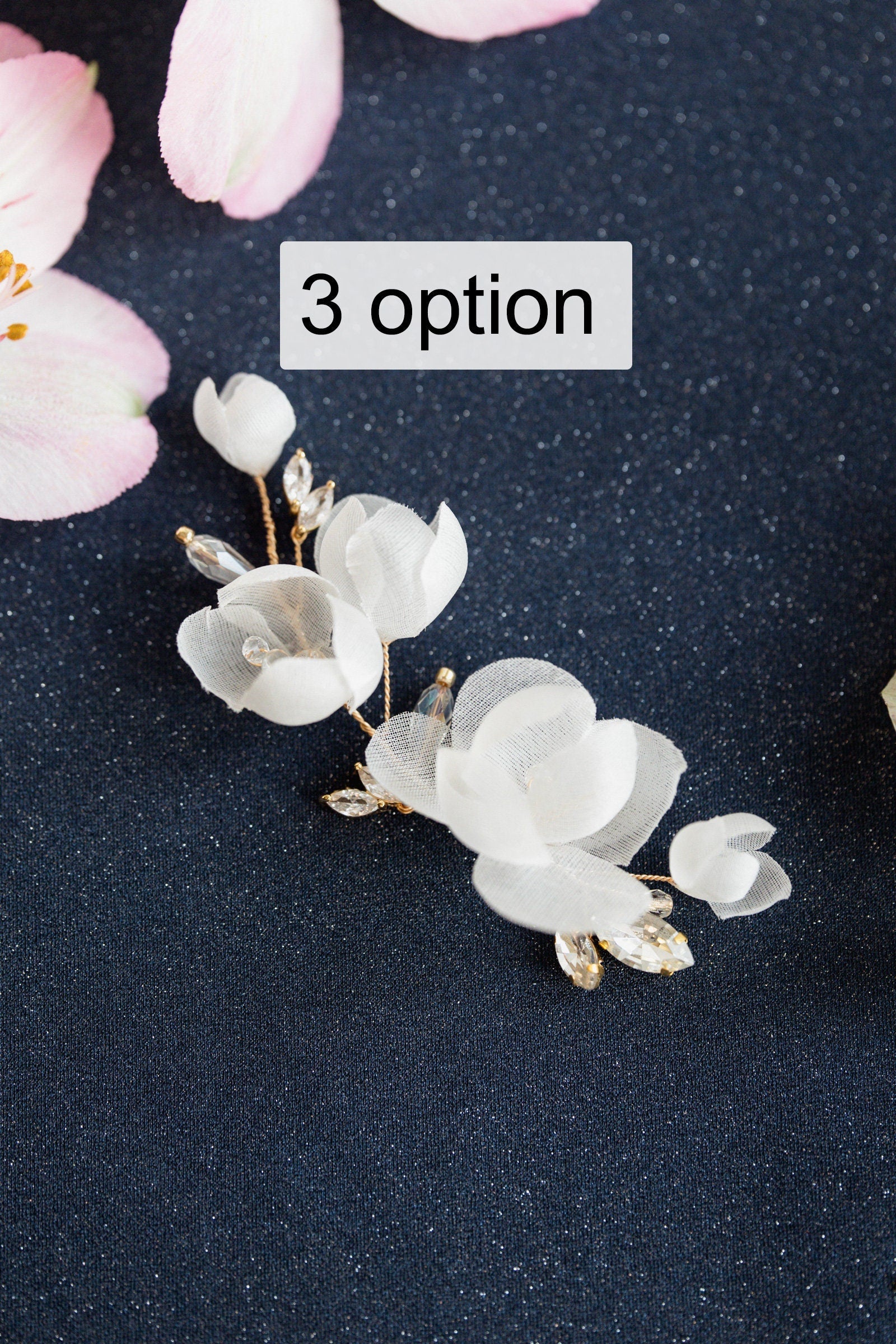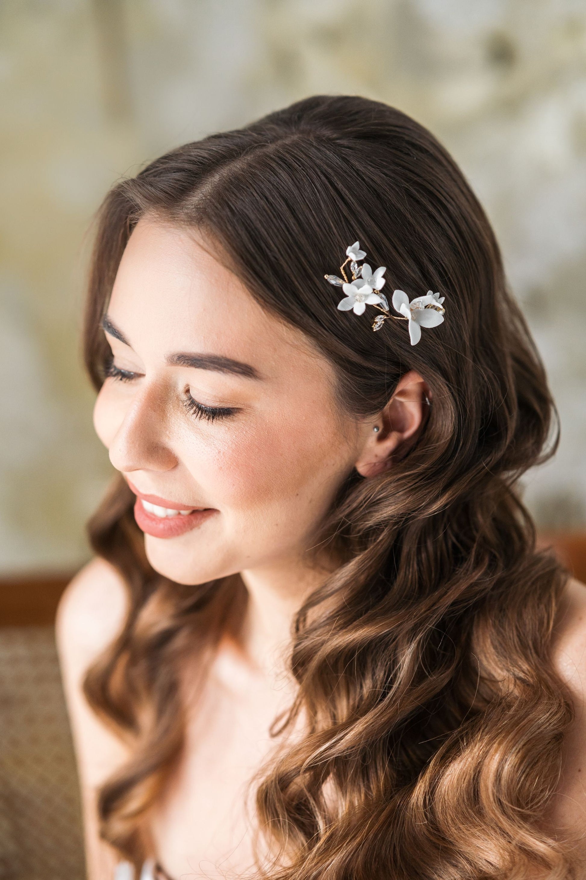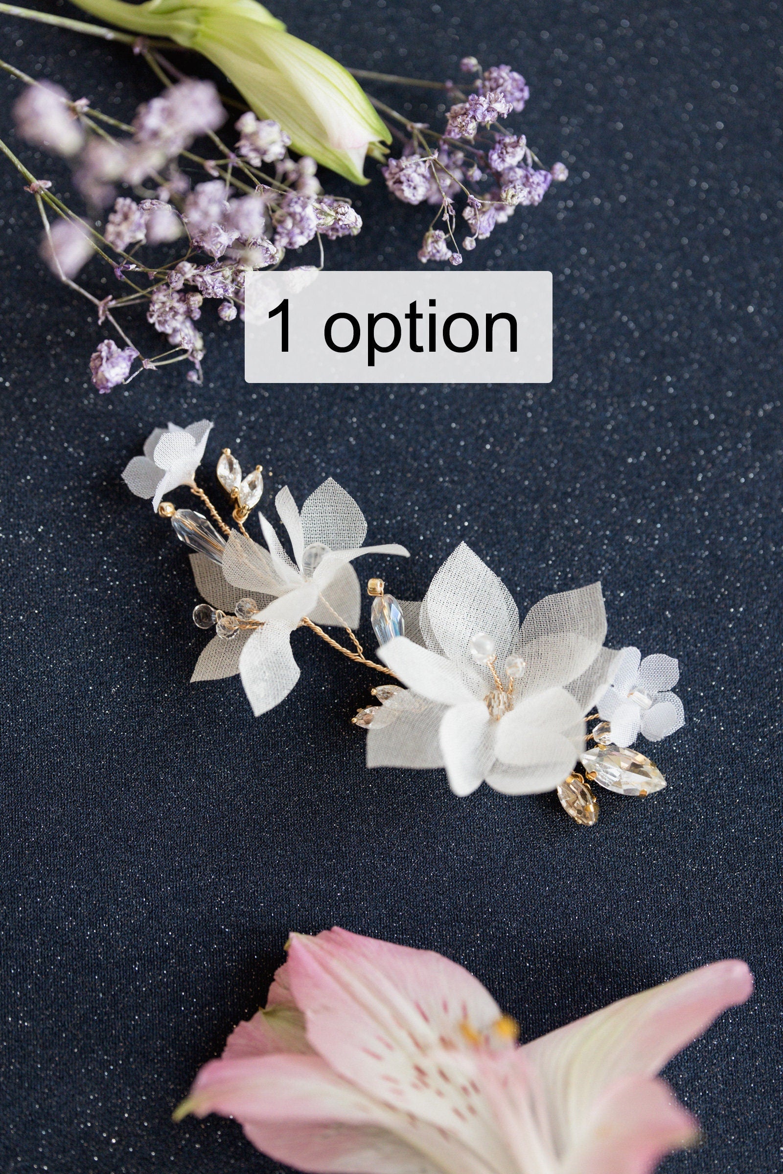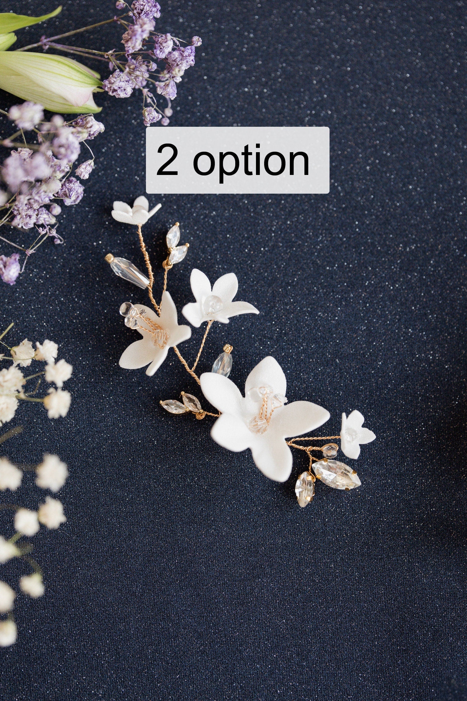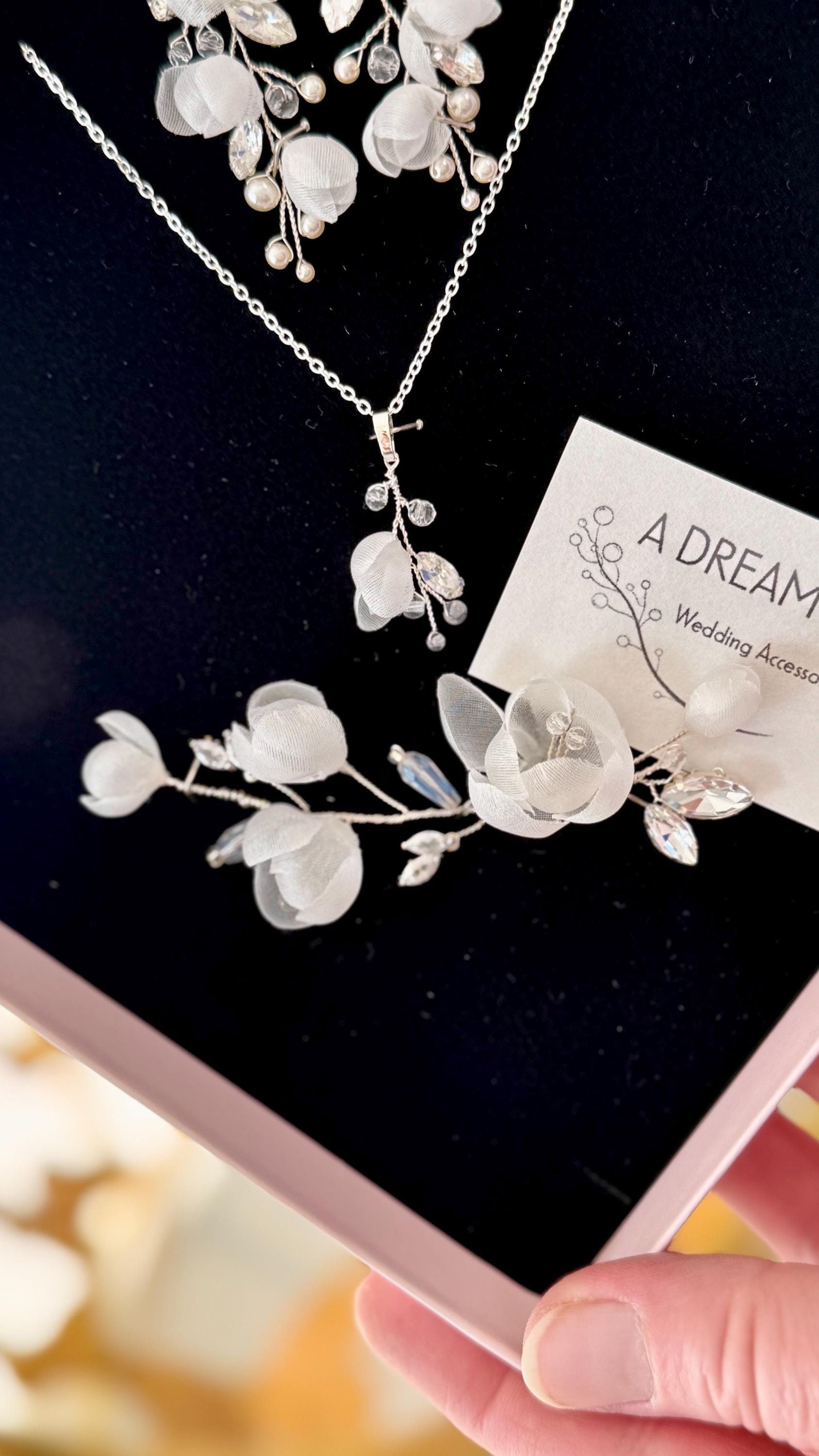 Ein dekorativer Hochzeitszweig, märchenhaft, voller bezaubernder Blüten in verschiedenen Größen, erinnert an Zartheit und Natürlichkeit. Funkelnd mit Kristallen schmückt er verschiedene Frisuren. Er passt zu schönen Dutts und leicht seitlich hochgesteckten Hollywood-Wellen. Er verleiht sowohl klassischen als auch rustikalen Hochzeitsstylings einen romantischen Charakter.