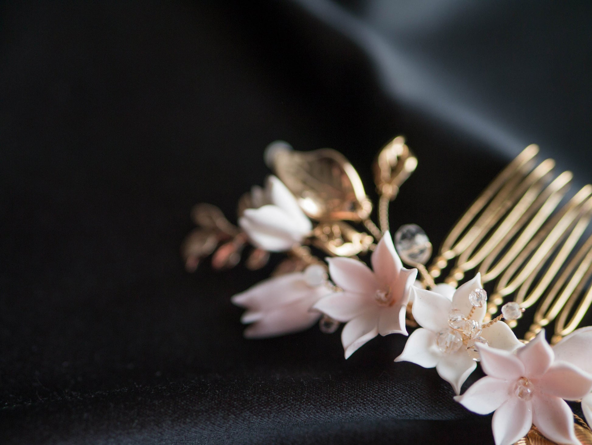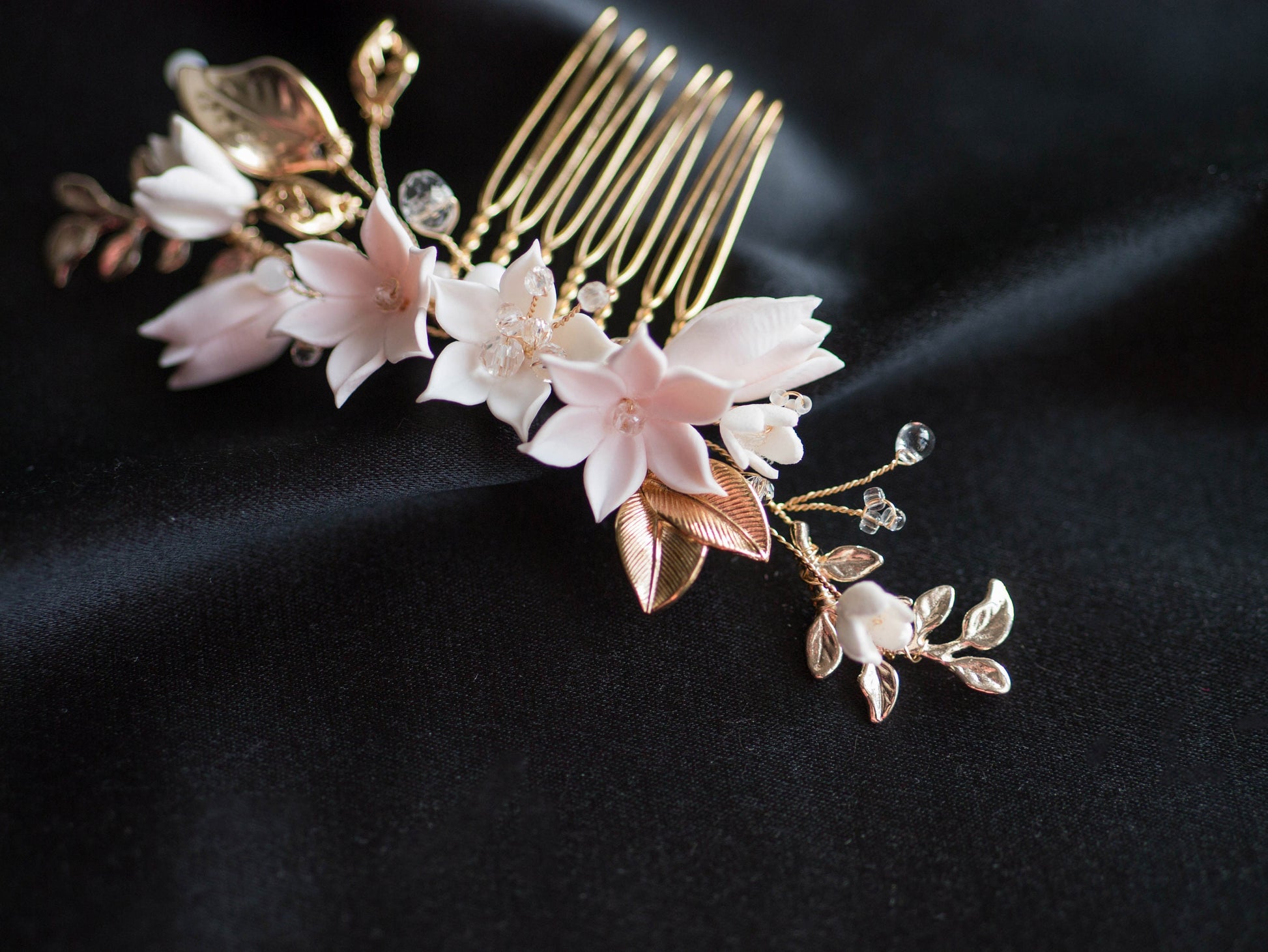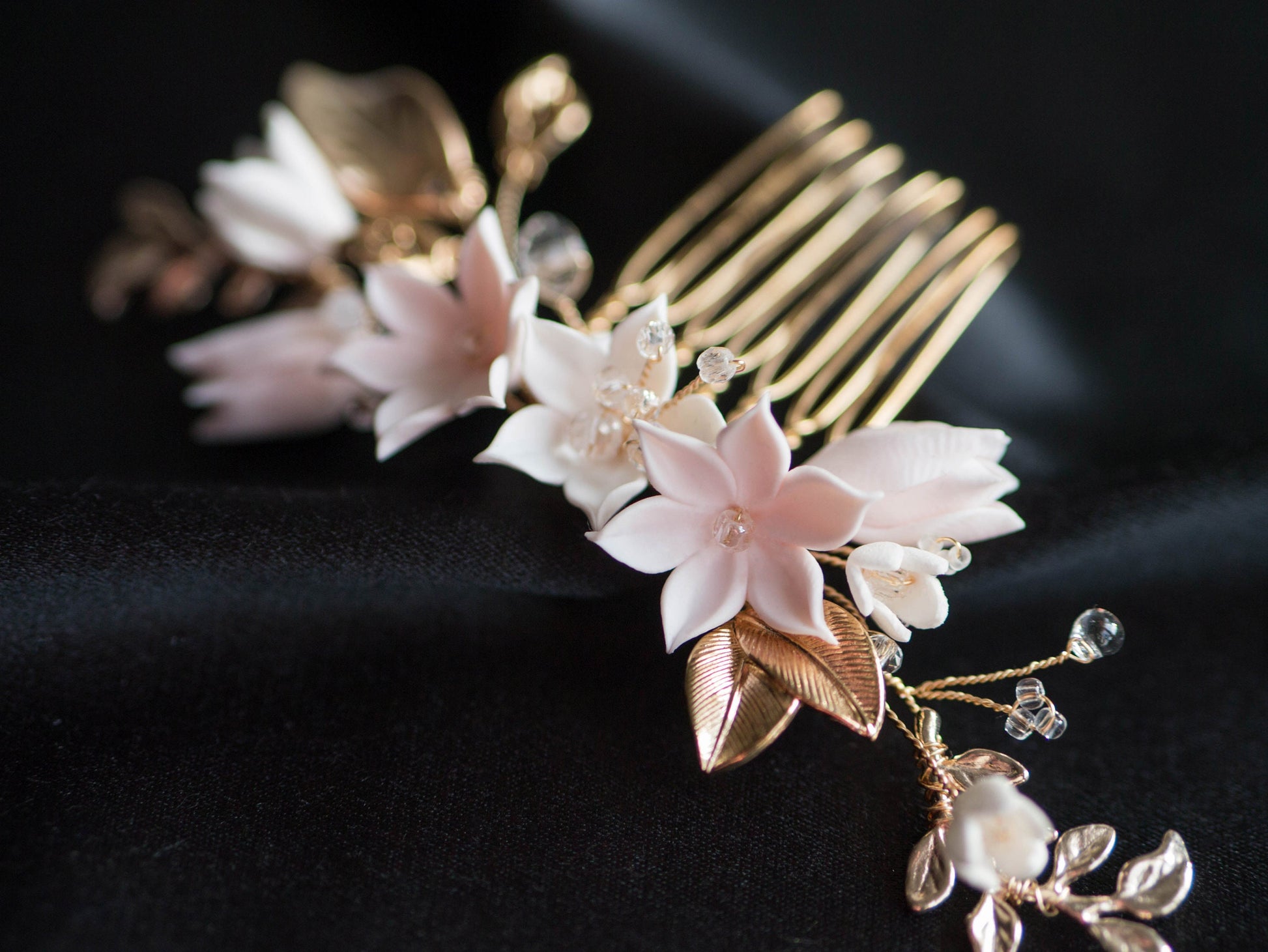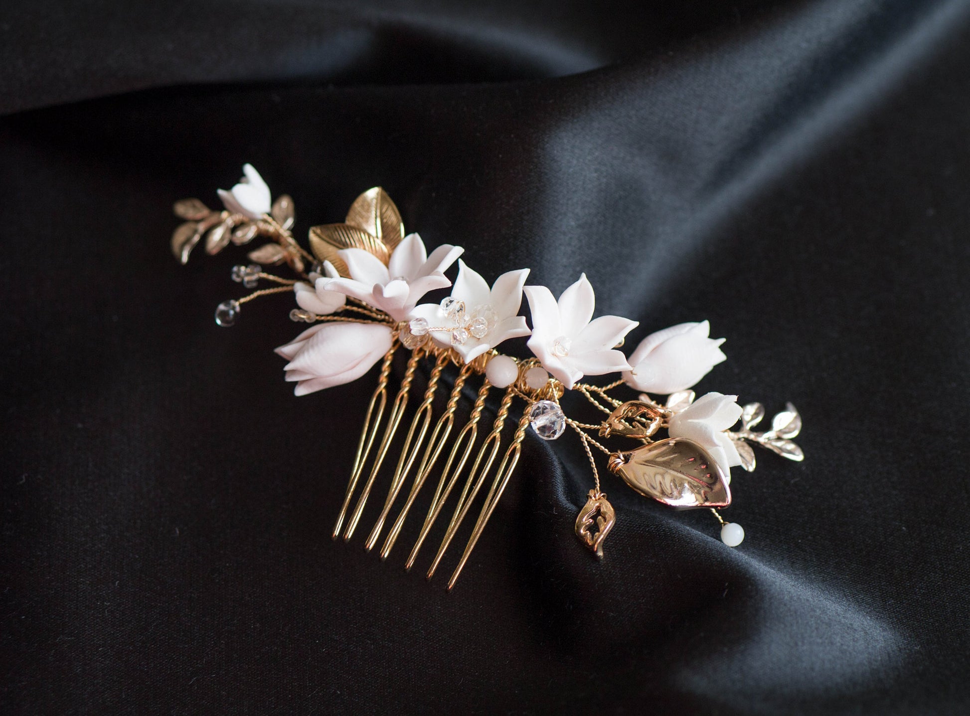 Ein wunderschöner Hochzeitshaarkamm voller Blumen, Kristalle und Blätter aller Art. Inspiriert von der Schönheit einer Frau verleiht er ausgewählten Hochzeitsstilen Charakter. Er passt perfekt zu leicht gestylten Coca-Cola-Frisuren sowie ausgefallenen Frisuren und verleiht ihnen Stil und Eleganz.