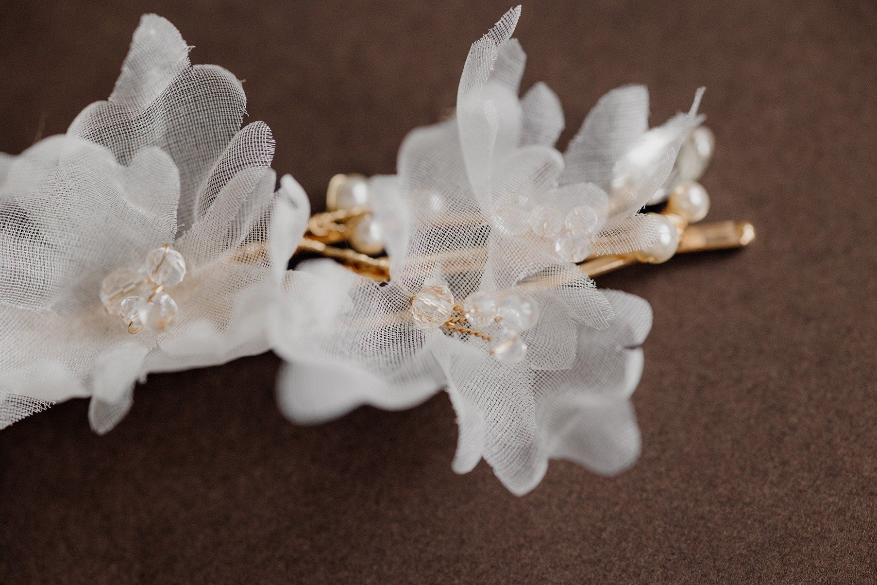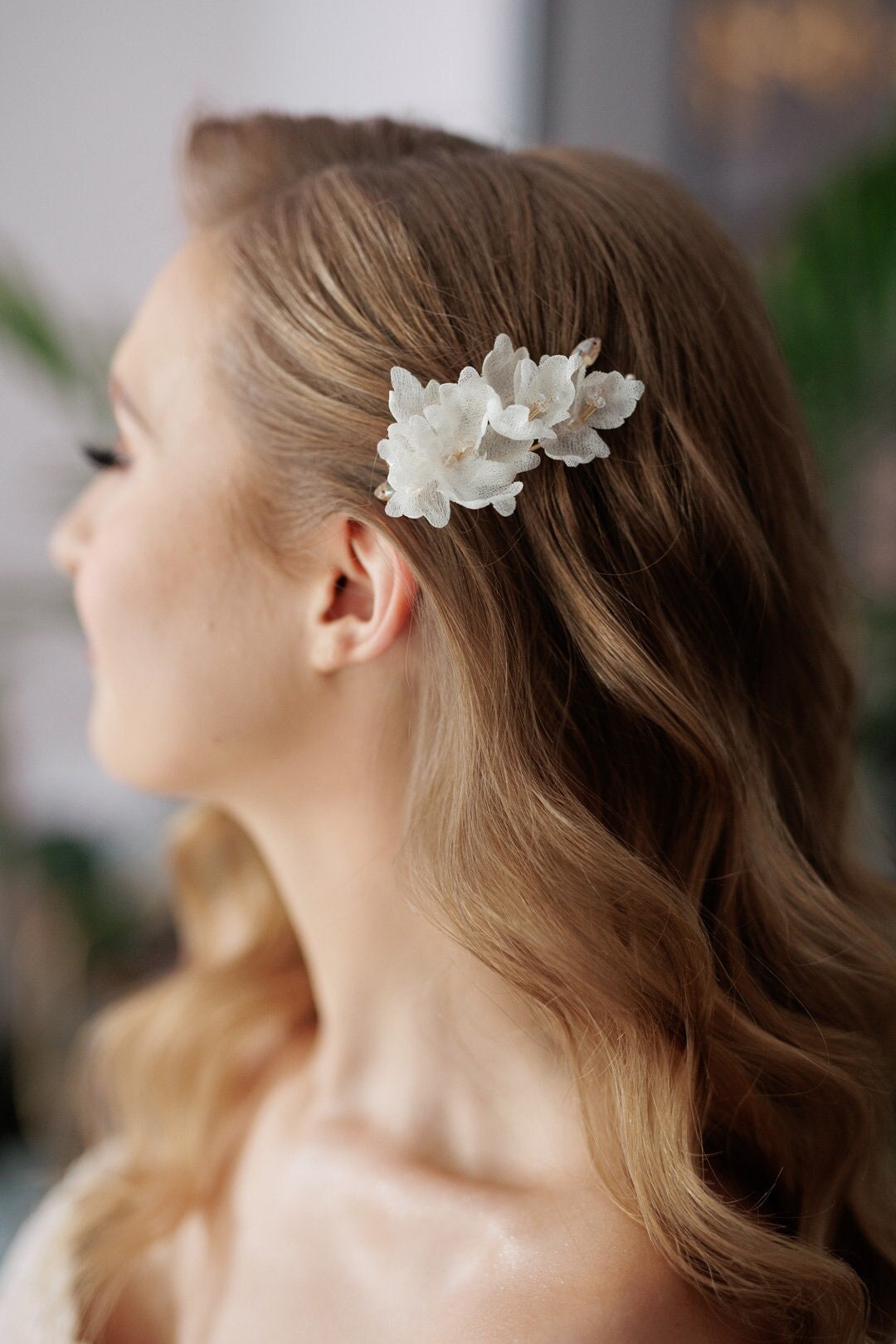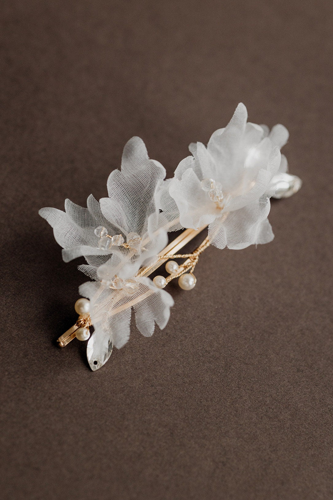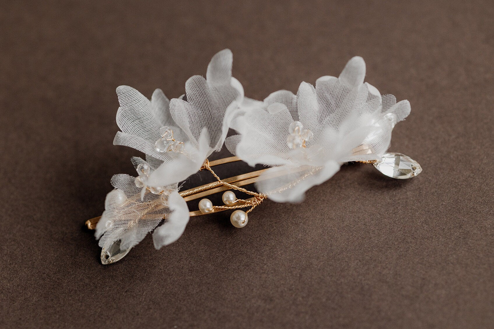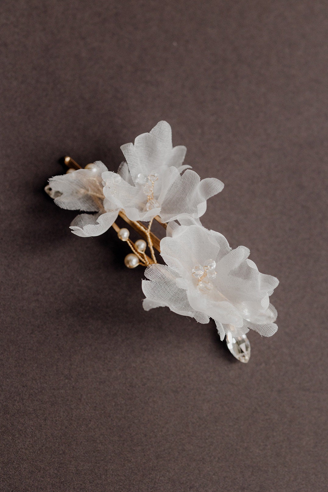Eine wunderschöne Haarspange aus ätherischen Seidenblumen, glänzenden Kristallen und Perlen ist ein toller Vorschlag für romantische, aber auch klassische Hochzeitsfrisuren. Dank der praktischen Einsteckform kann sie seitlich befestigt oder an der richtigen Stelle in der Frisur platziert werden – Hollywood-Wellen, Hochzeitspferdeschwanz usw.